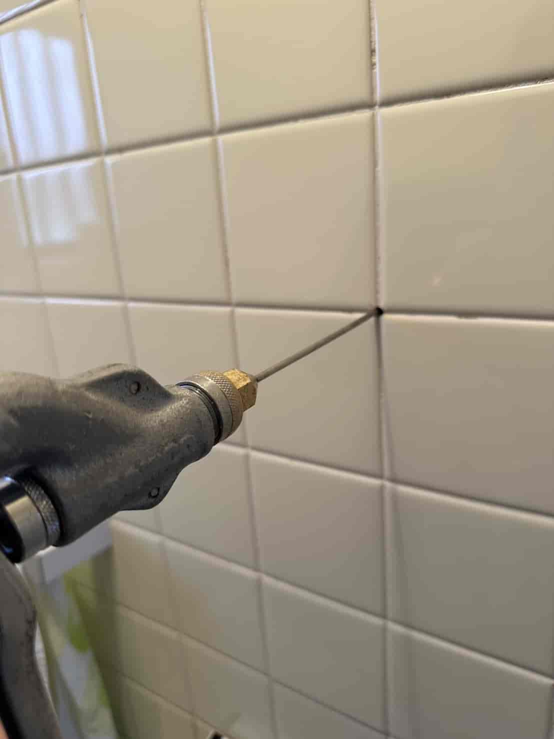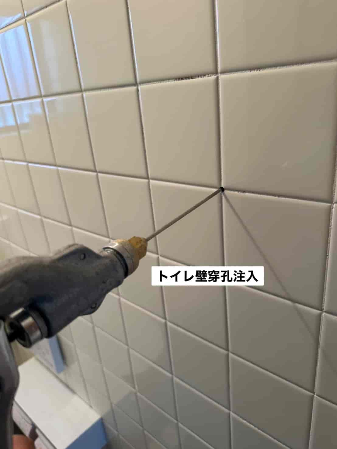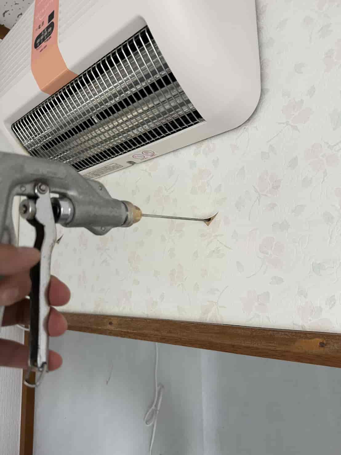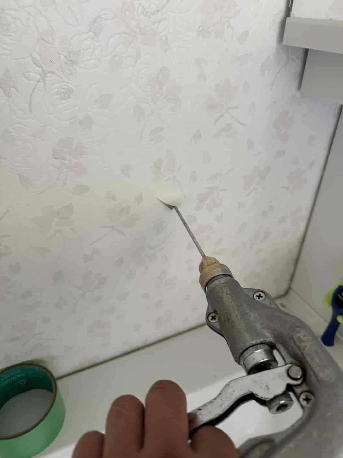 壁内部は外から見えないため、被害が進行していても気づきにくい場所です。そこで、壁穿孔注入を実施しました。壁面に最小限の穴を開け、専用ノズルを使って内部の木部や断熱材付近に薬剤を均一に注入します。壁内に潜む白アリを駆除すると同時に、壁全体を防蟻処理することで再発を防ぐことができます。穿孔した穴は最終的に目立たないように補修を行い、美観を保ちながら施工を終えました。