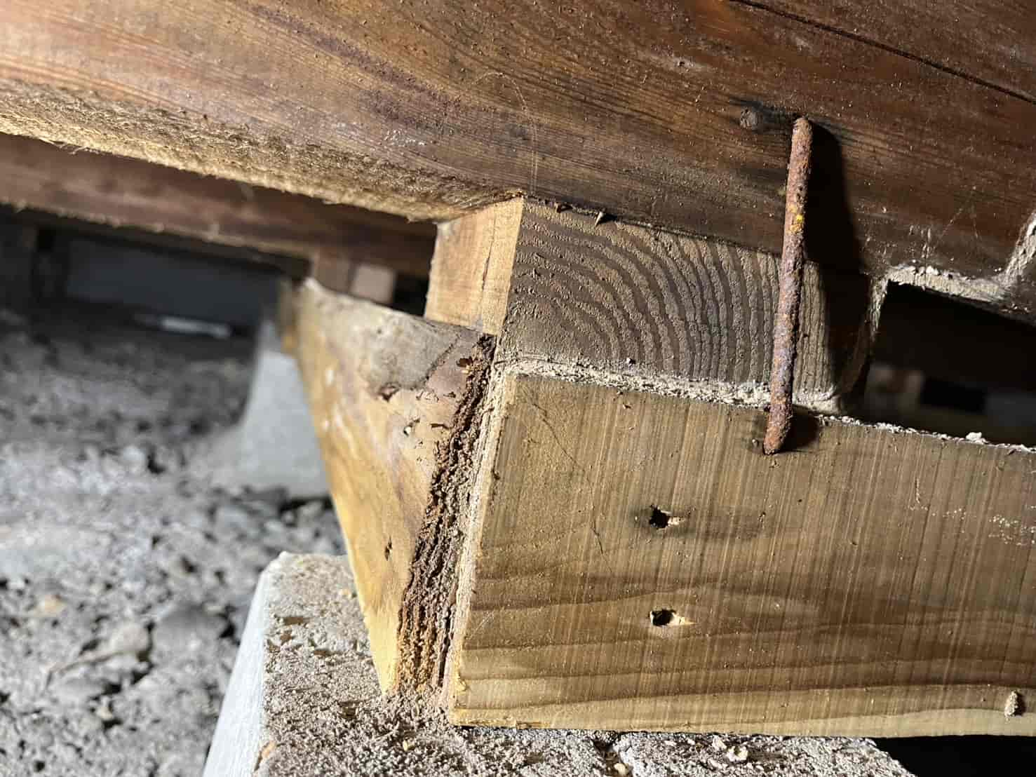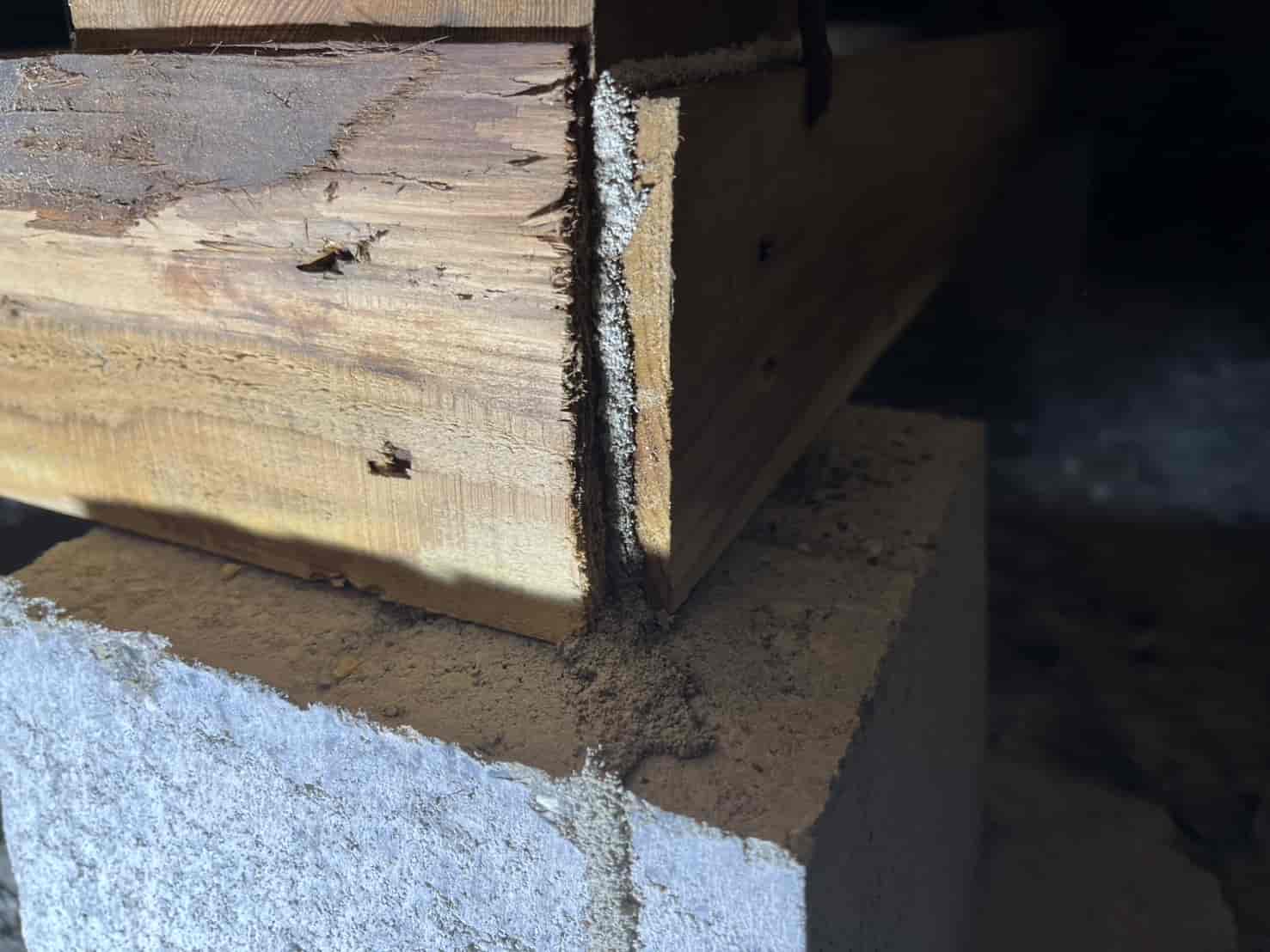 【対応】「シロアリ被害が心配」とご相談いただき調査したところ、基礎が複雑で床下全体の点検が困難な構造でした。そこで 基礎のハツリ・木部穿孔注入・スラブ穿孔注入・壁穿孔注入 を組み合わせ、薬剤を確実に行き渡らせる施工を実施。