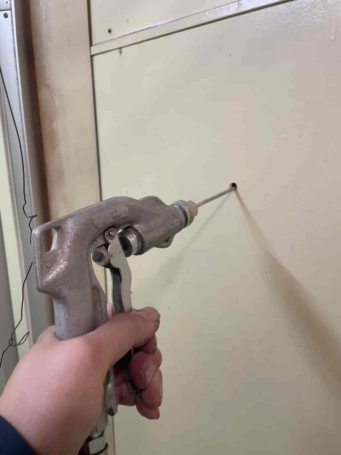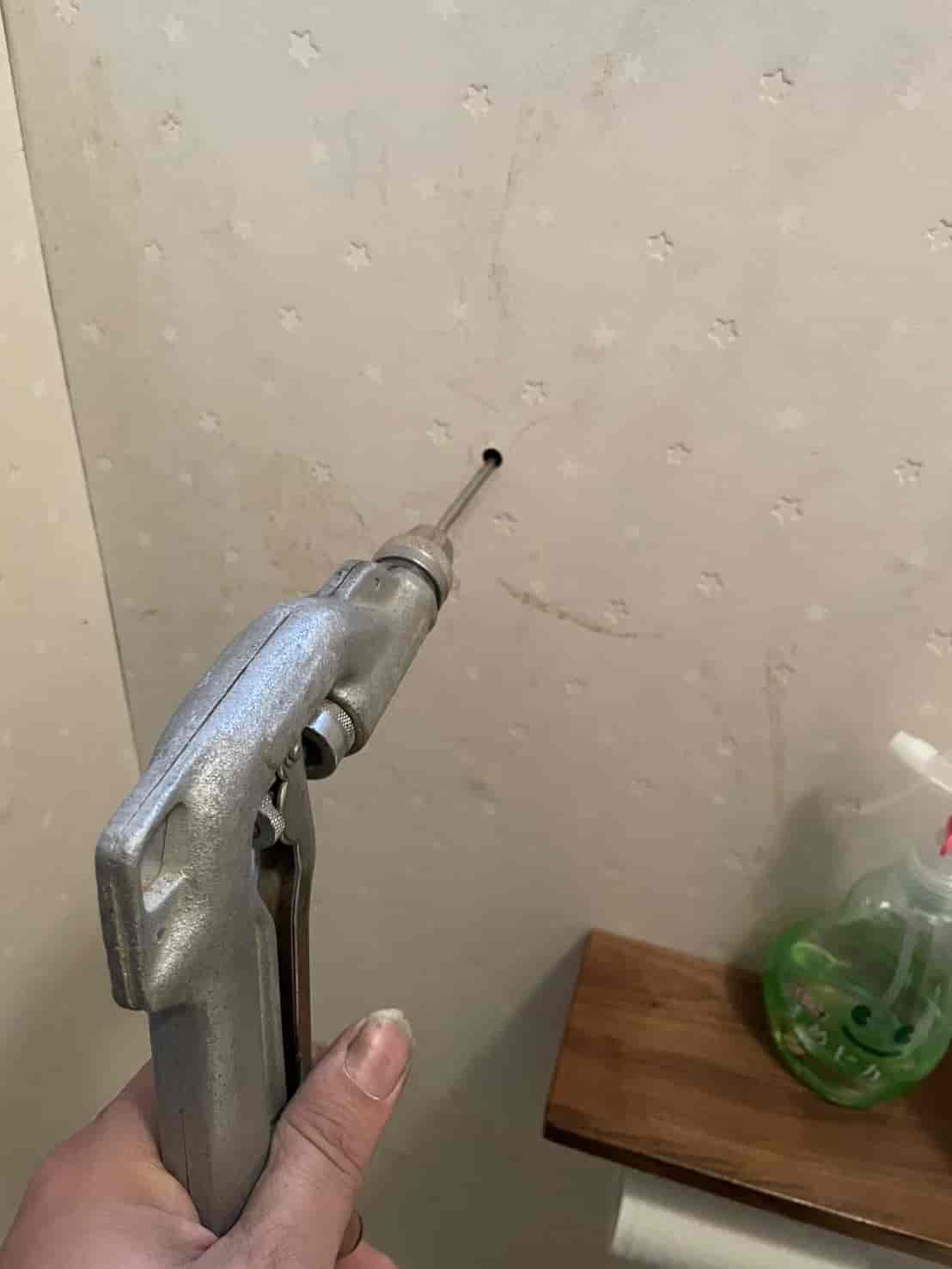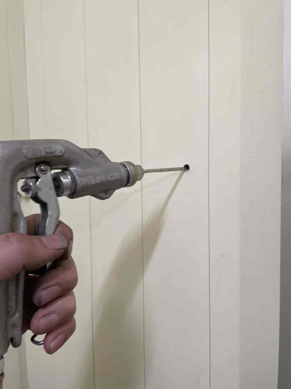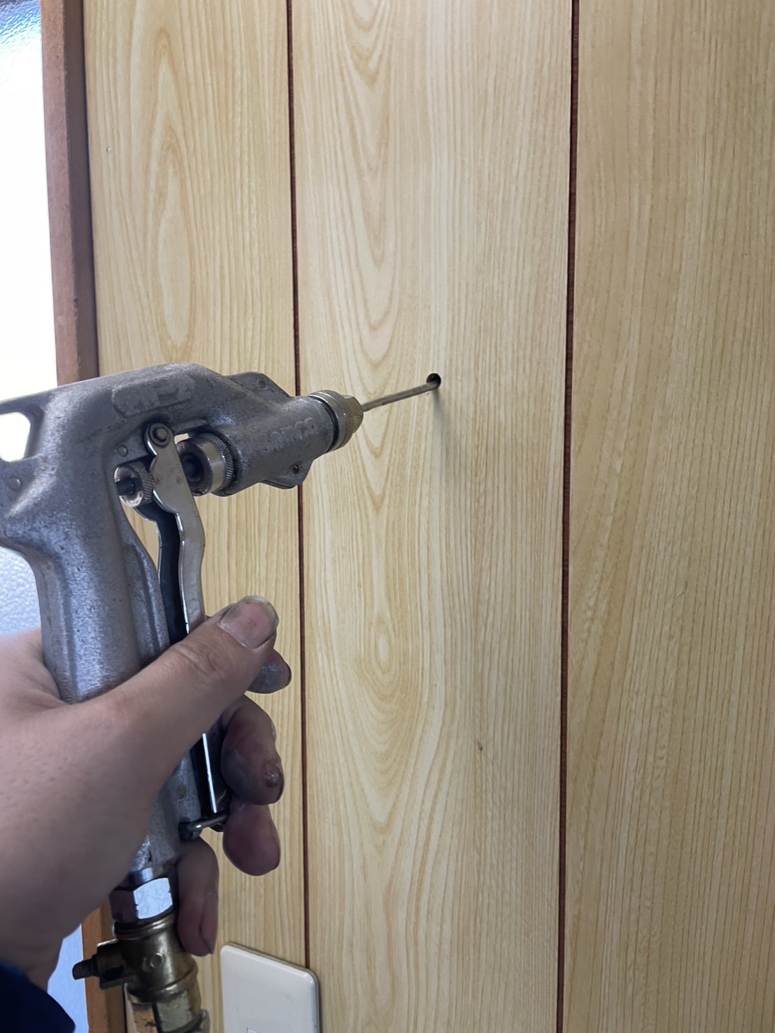 床下に進入できない建物でも、プロの現場では**「壁面への薬剤注入処理」**が非常に有効です。この方法では、面に小さな穴を数カ所あける。内部の空間や木部へ薬剤を直接注入する。その後、穴を補修して原状に近い状態に戻す