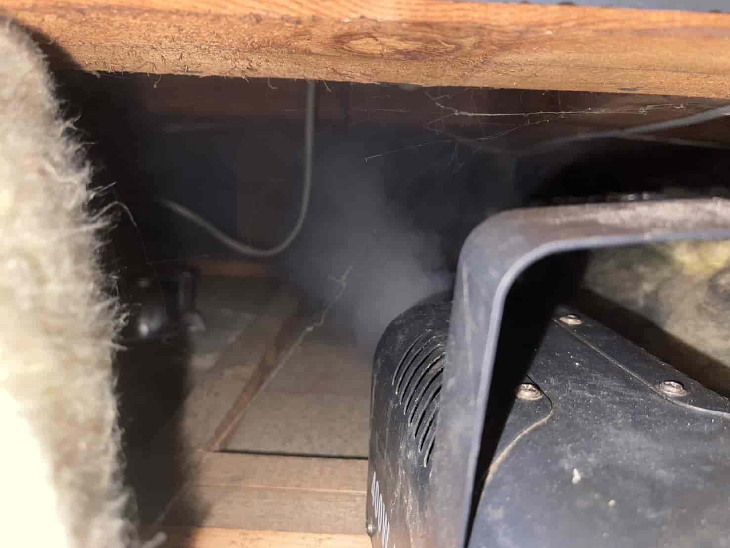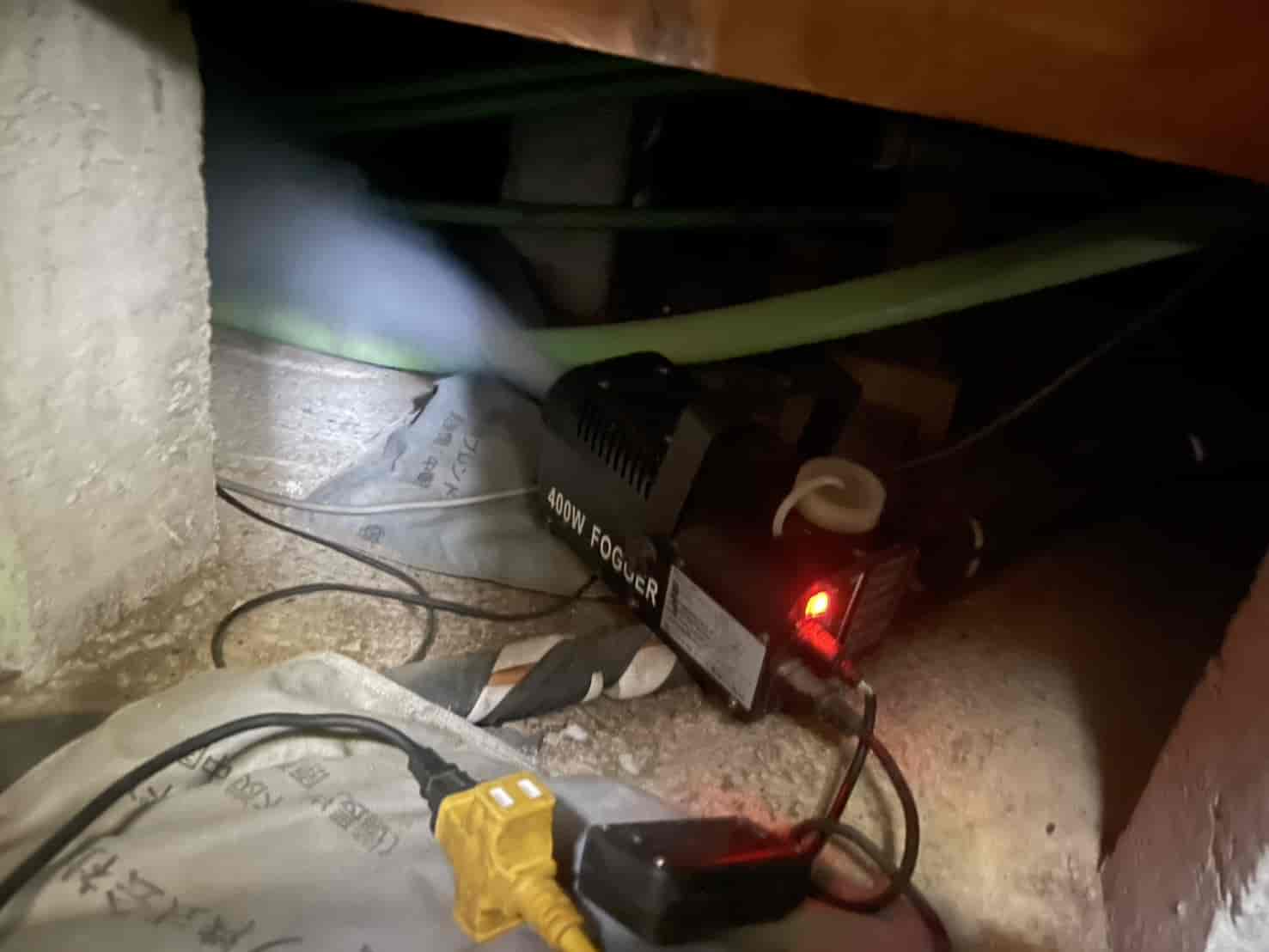 封鎖工事と並行して、屋内に残っているネズミを駆除するため、燻煙処理を実施しました。専用の駆除剤を使用し、天井裏全体に薬剤の煙を行き渡らせ、巣や隠れ場所に潜むネズミを駆除します。