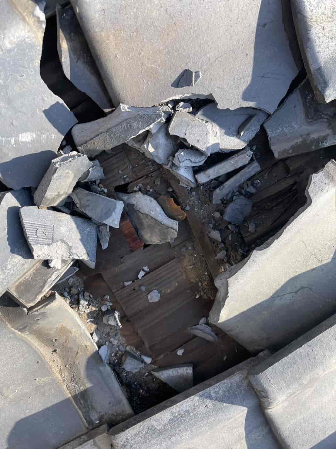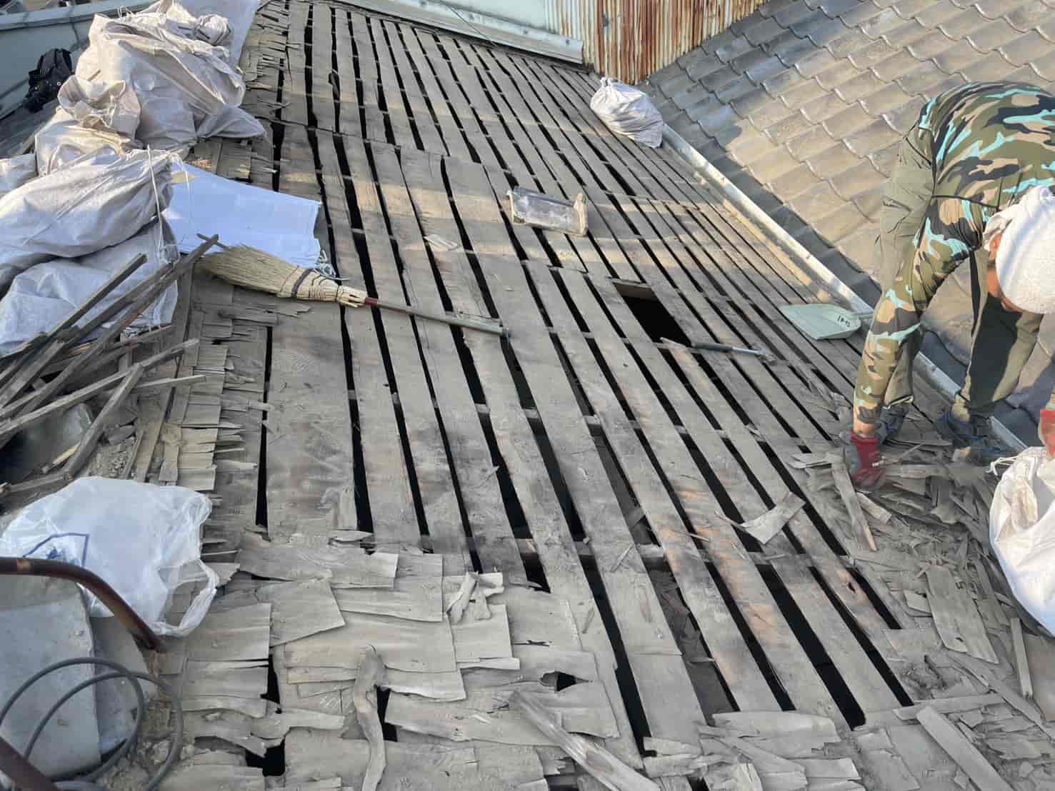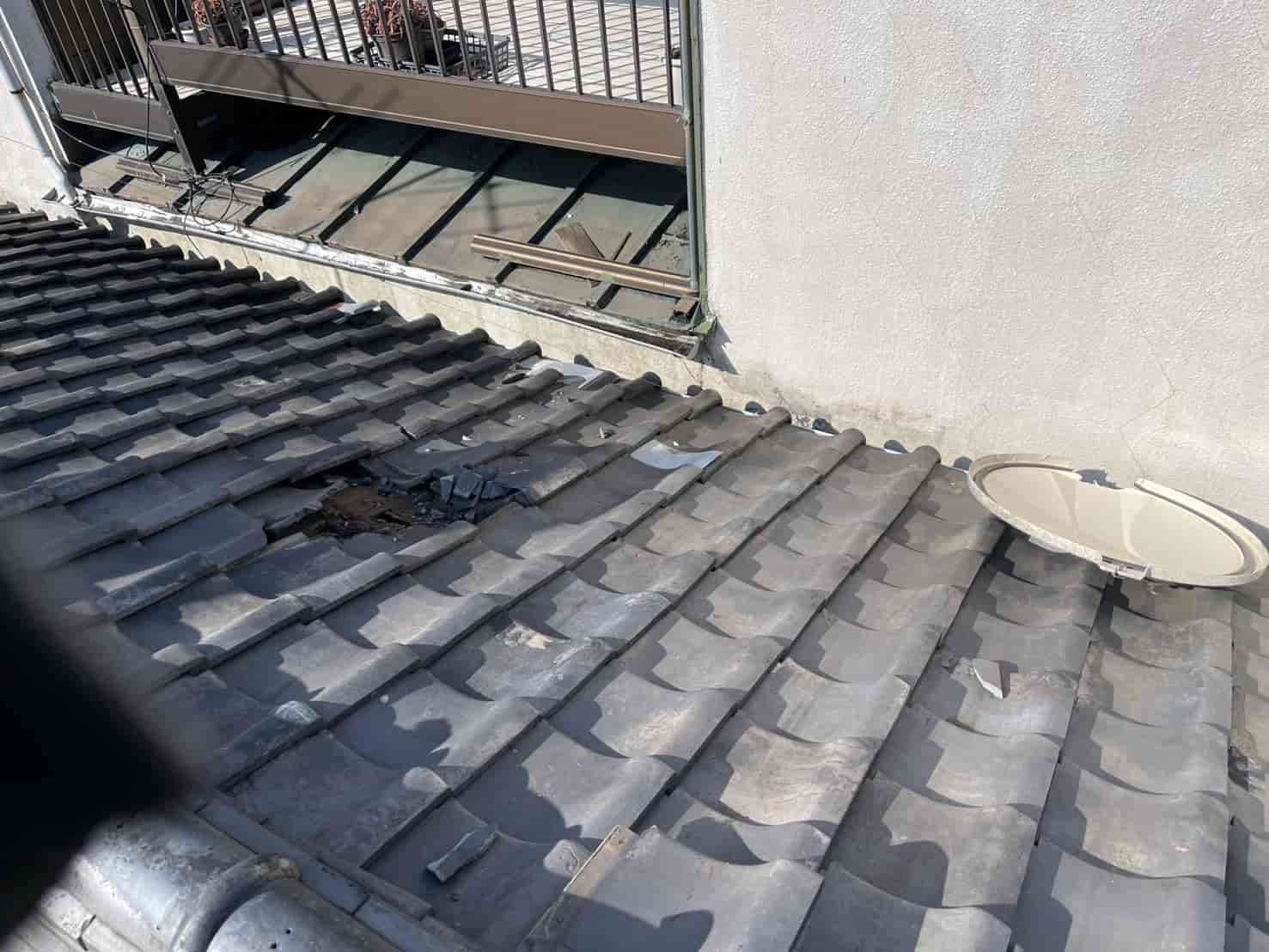 【対応】台風による瓦の破損と雨漏りが発生していたため、既存の瓦屋根を撤去し、下地補修・防水シート敷設のうえ、軽量で耐久性の高い金属屋根「ガルテクト」へ葺き替えを実施。雨漏りを解消し、台風・地震にも強い屋根へと改修しました。