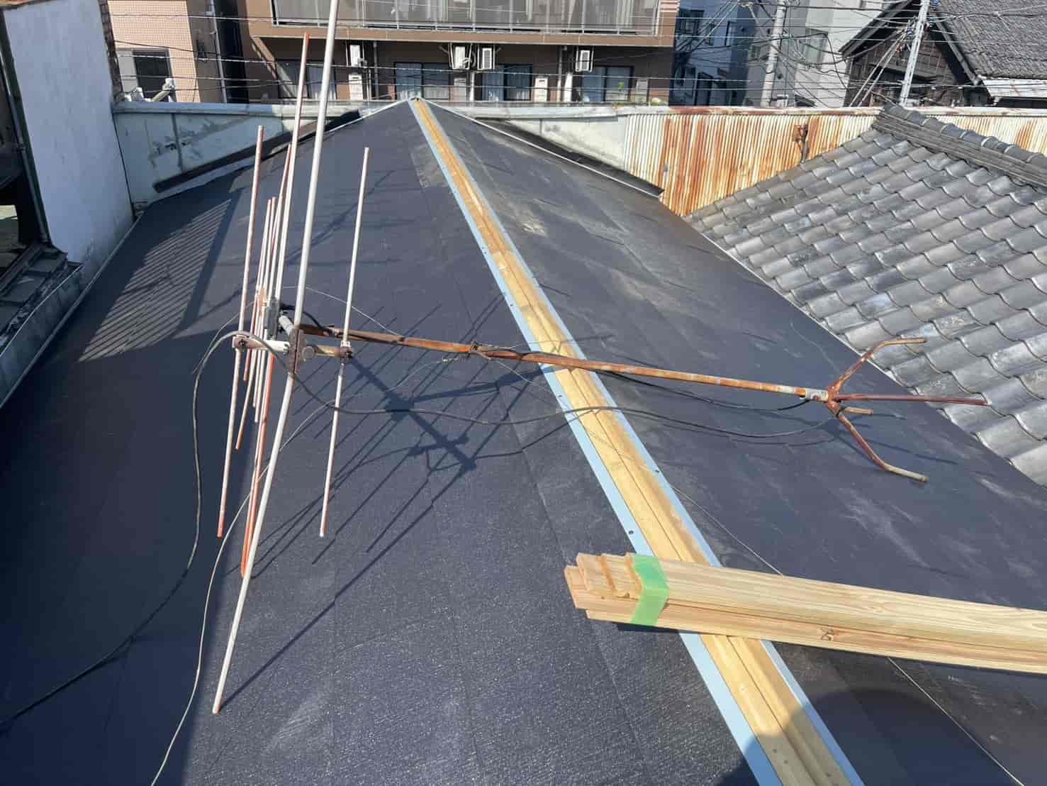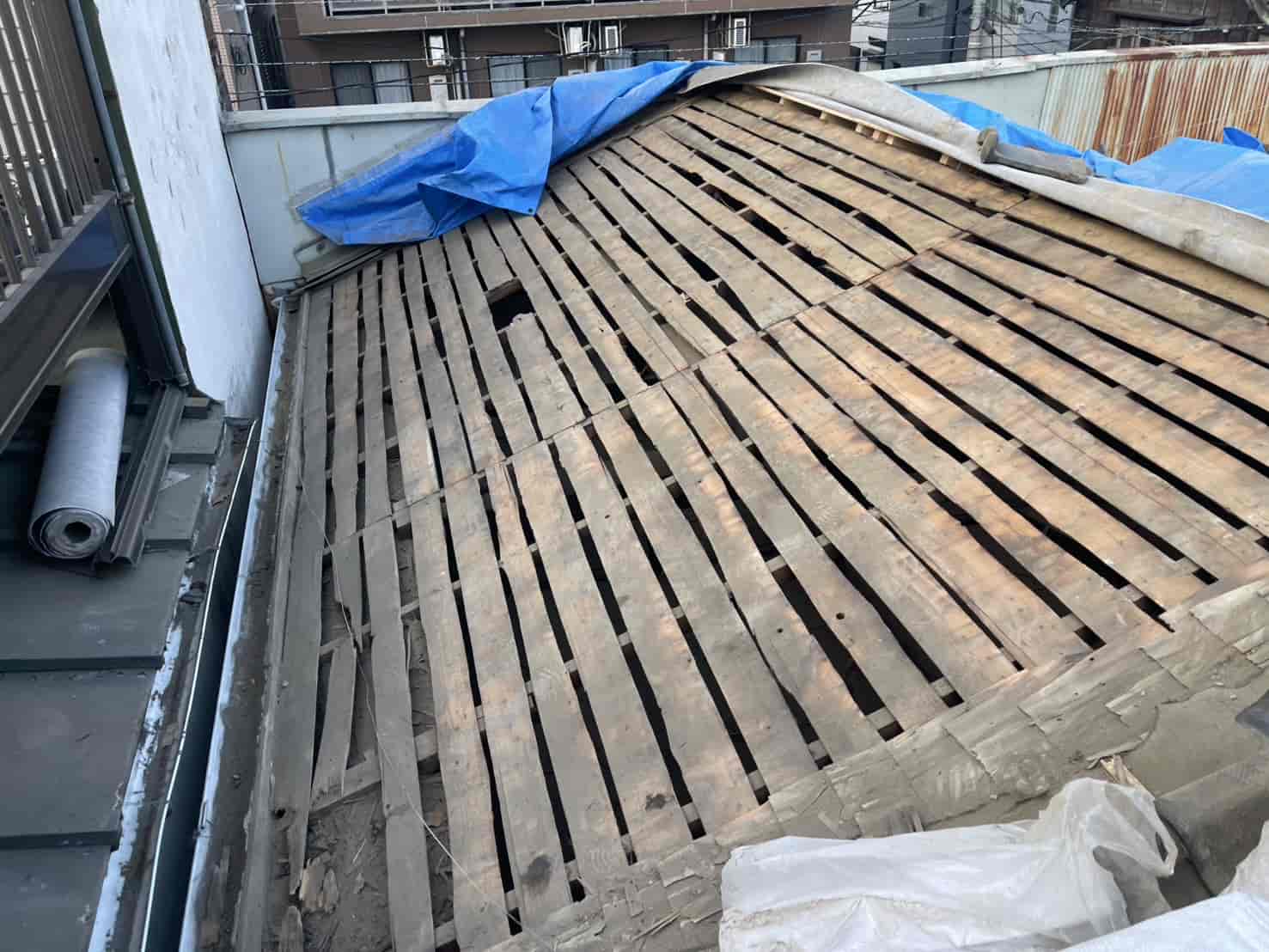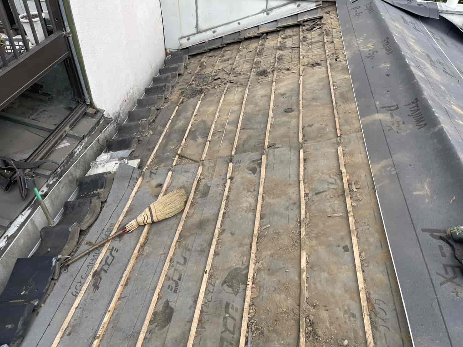 まずは瓦と古くなった下葺き材を丁寧に撤去します。長年の雨水で一部の野地板が傷んでいたため、腐食部分を交換して下地を補強しました。