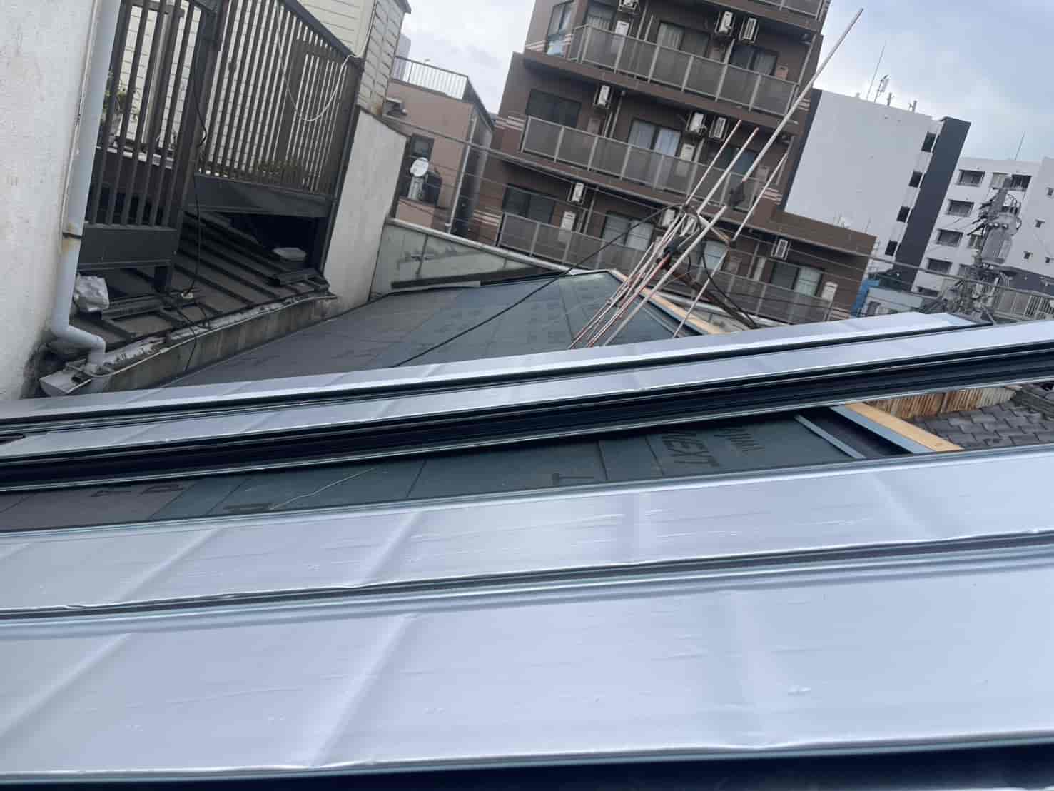 棟部分や谷部分は雨漏りの原因になりやすい箇所ですので、板金と防水材を組み合わせてしっかり納めます。