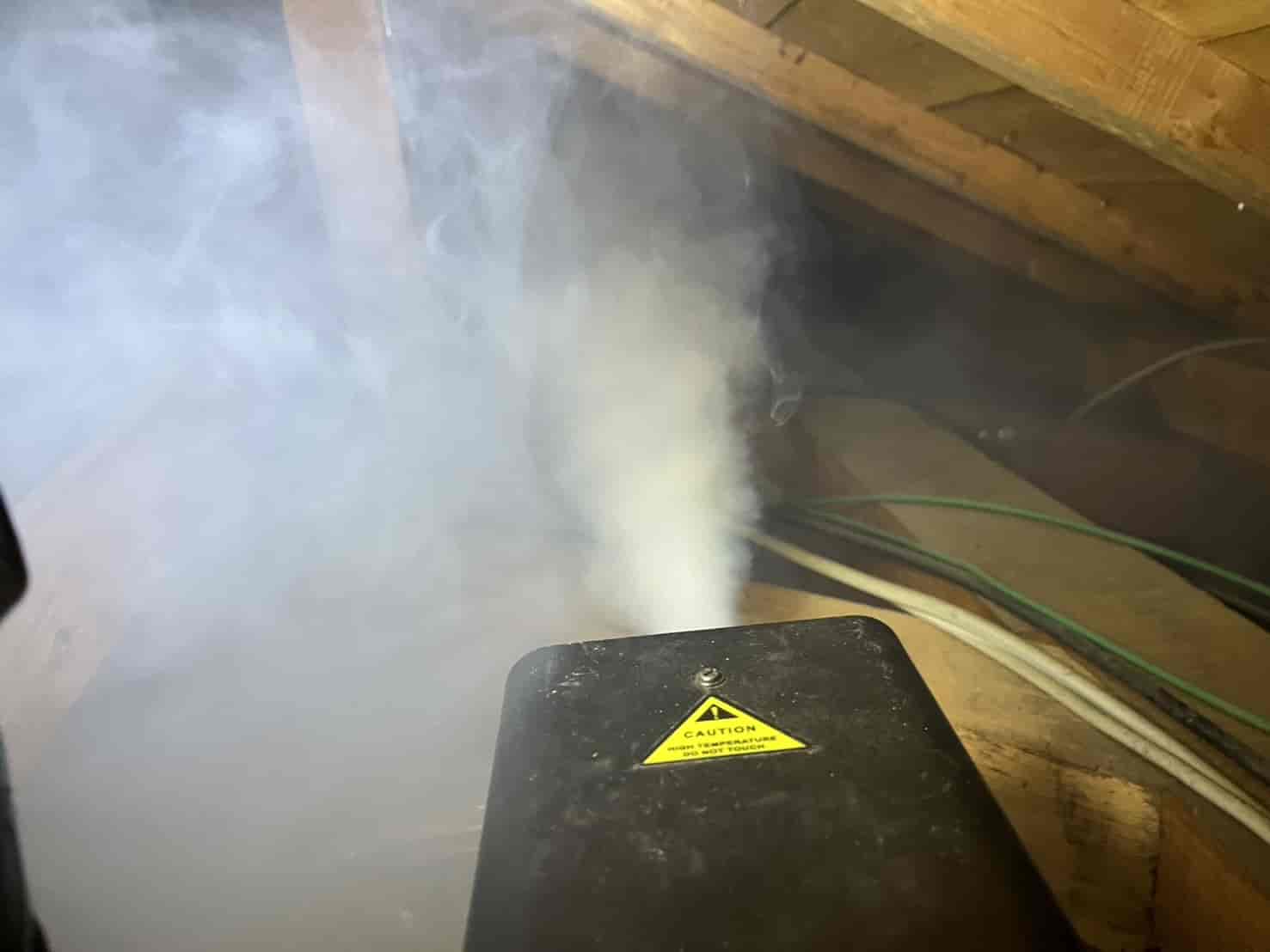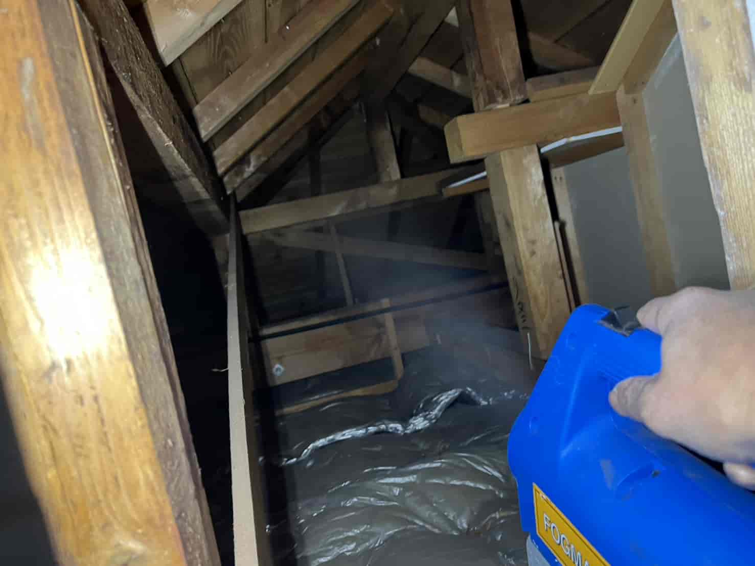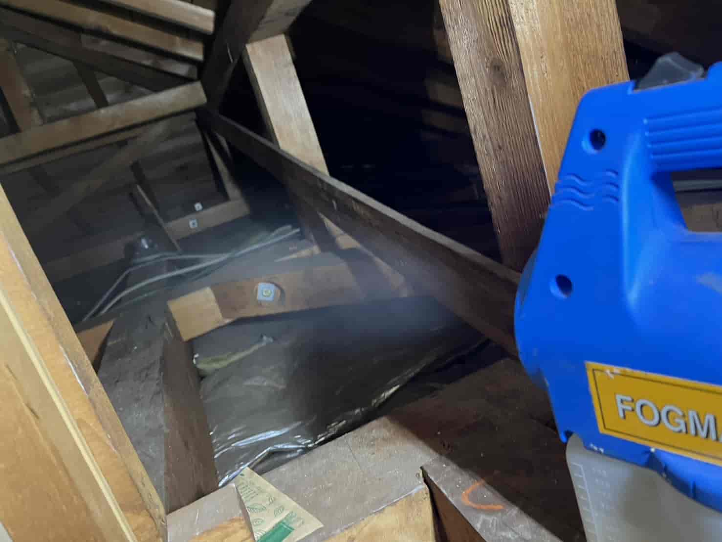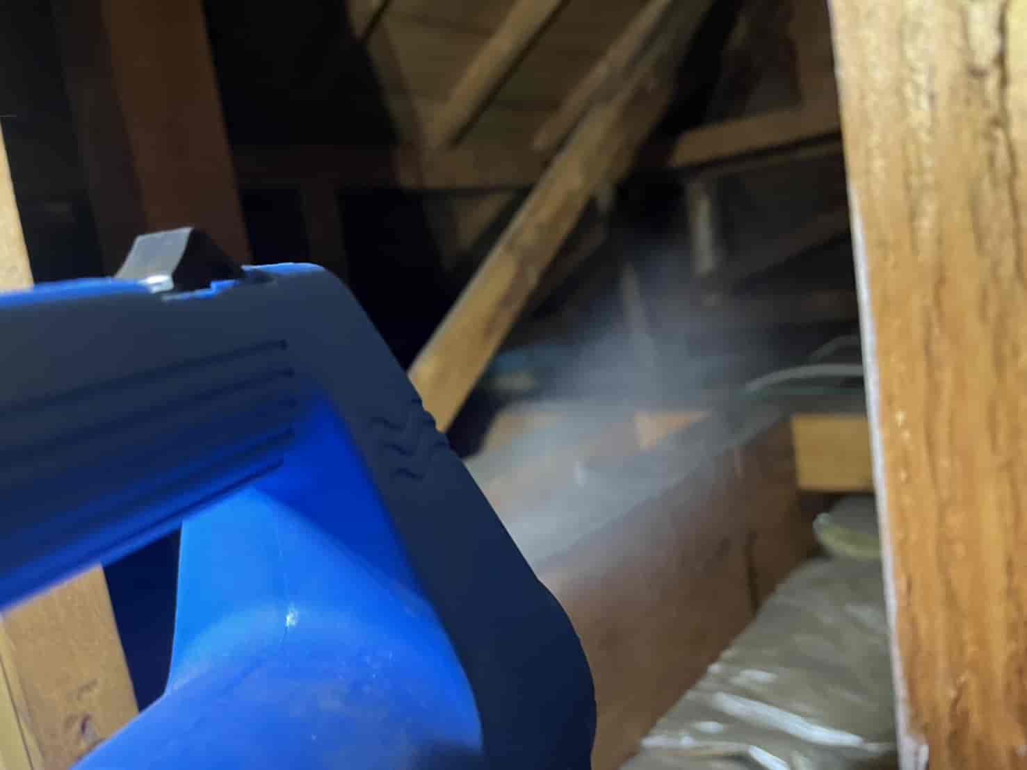 まずは、今現在屋根裏に潜んでいる個体を外へ追い出す必要があります。 動物が嫌がる成分を含んだ薬剤を煙状にして屋根裏の隅々まで充満させる「燻煙(くんえん)作業」を実施しました。これにより、建物を傷つけることなく、安全に害獣を追い出します。
