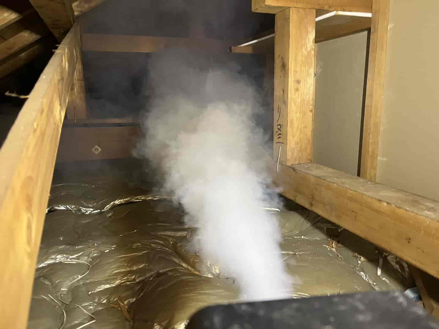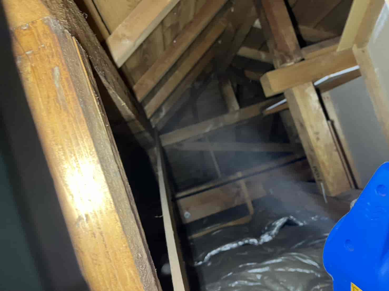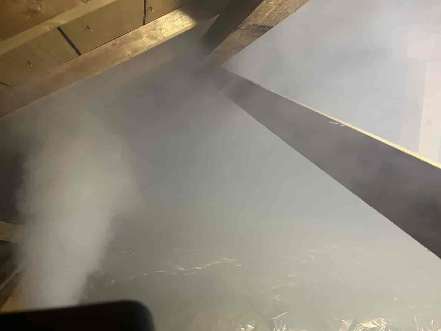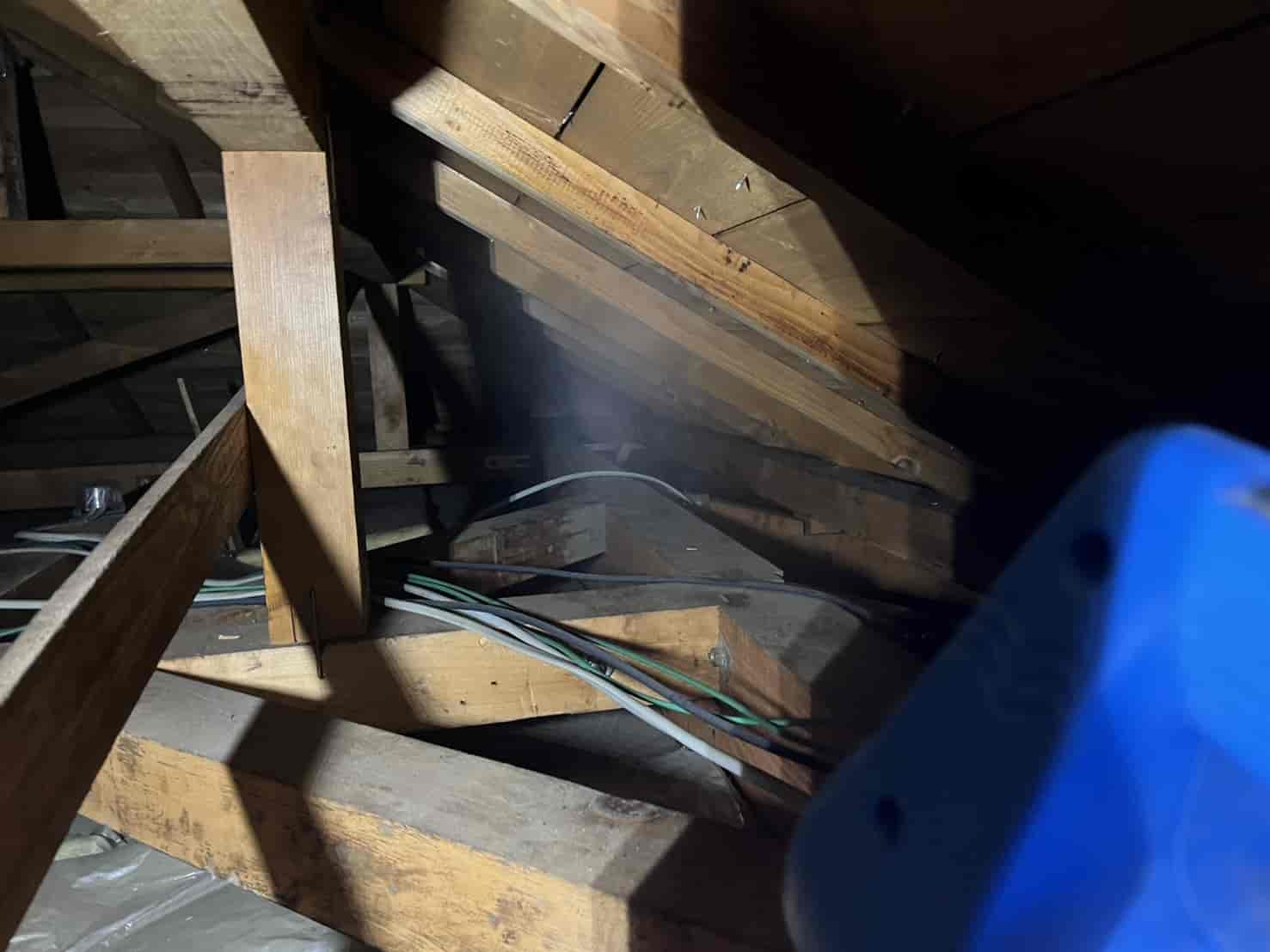 まずは、今現在屋根裏に潜んでいる個体を外へ追い出す必要があります。 動物が嫌がる成分を含んだ薬剤を煙状にして屋根裏の隅々まで充満させる「燻煙(くんえん)作業」を実施しました。これにより、建物を傷つけることなく、安全に害獣を追い出します。