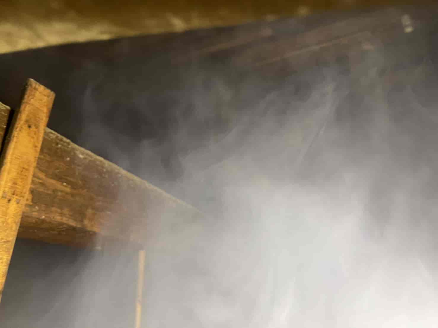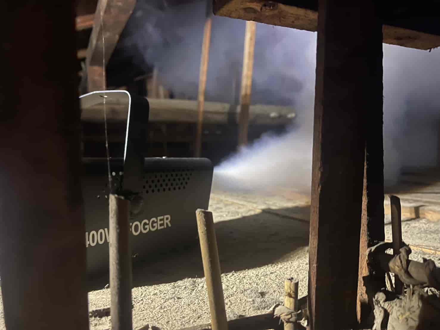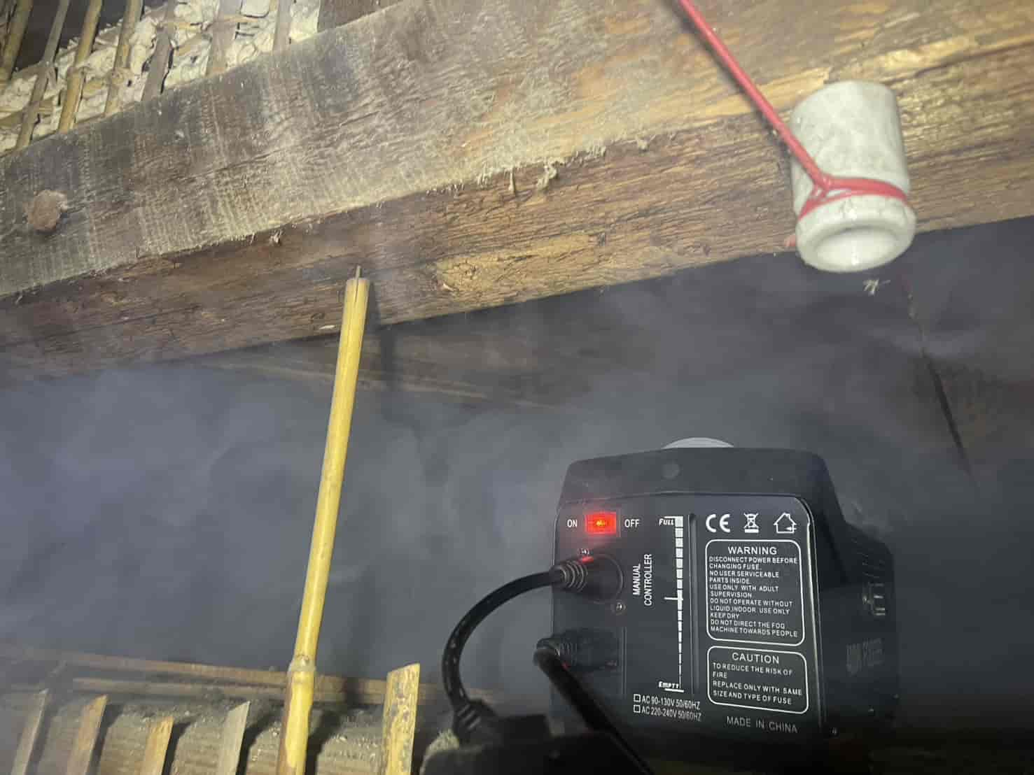 現場状況を踏まえ、まずは天井裏全体に 燻煙処理 を実施し、隠れている個体の追い出しと消毒を同時に行いました。その後、活動経路となる梁や配線周りを中心に 粘着シートを多数配置。天井裏の構造を確認し、ネズミが横移動しやすい部分を見極めながら、確実に捕獲につながるよう配置に工夫を加えました。