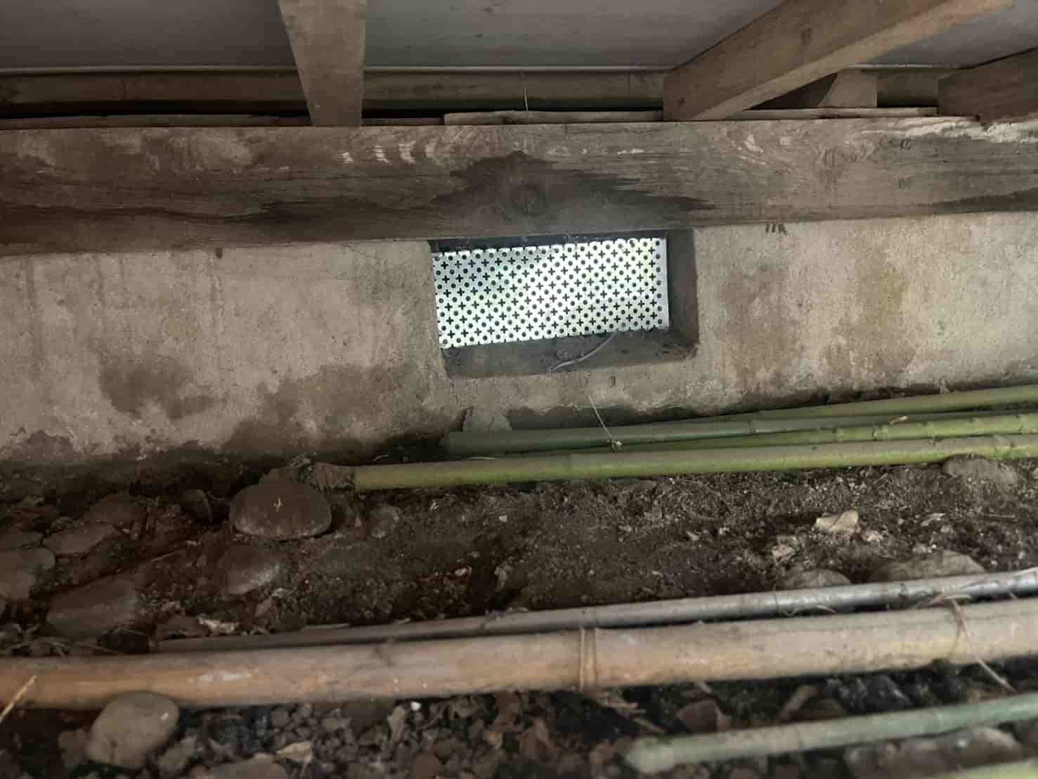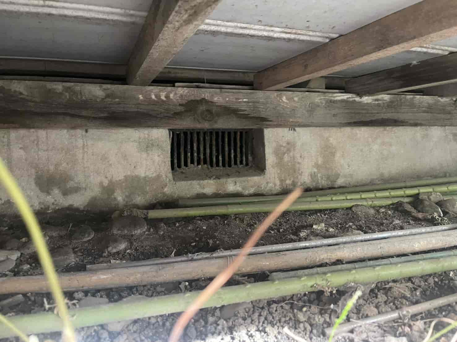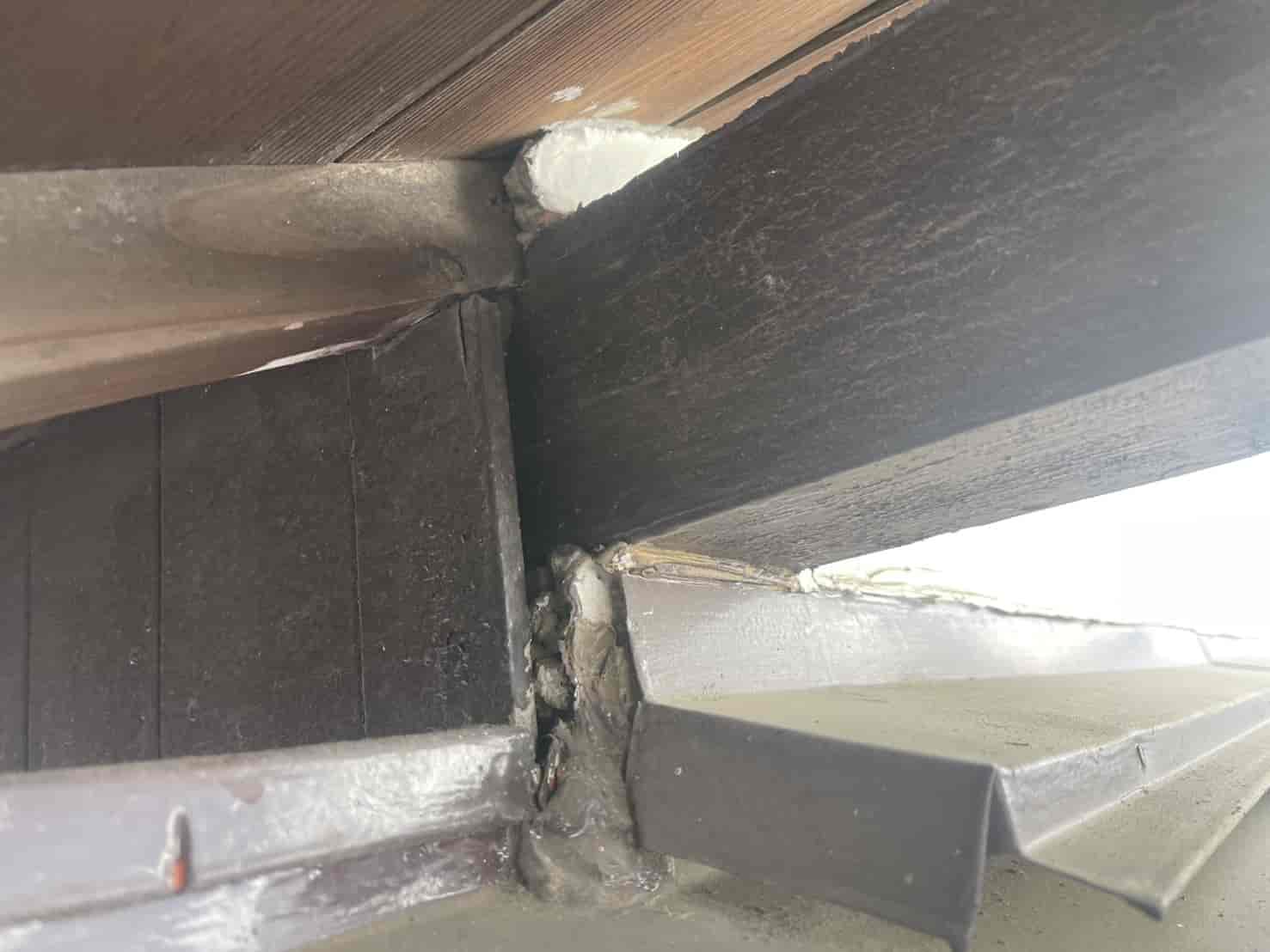 通気口は建物外周部に設置されており、通常は金網や防鼠材で塞ぐ必要がありますが、ここがそのままになっていたため、ネズミが容易に侵入できる状態が続いていました。また、建物の軒天部を確認すると、 柱と柱の間にわずかな隙間 があり、ネズミが指一本分の隙間でも通る習性を考えると、こちらも大きな侵入口となっていました。