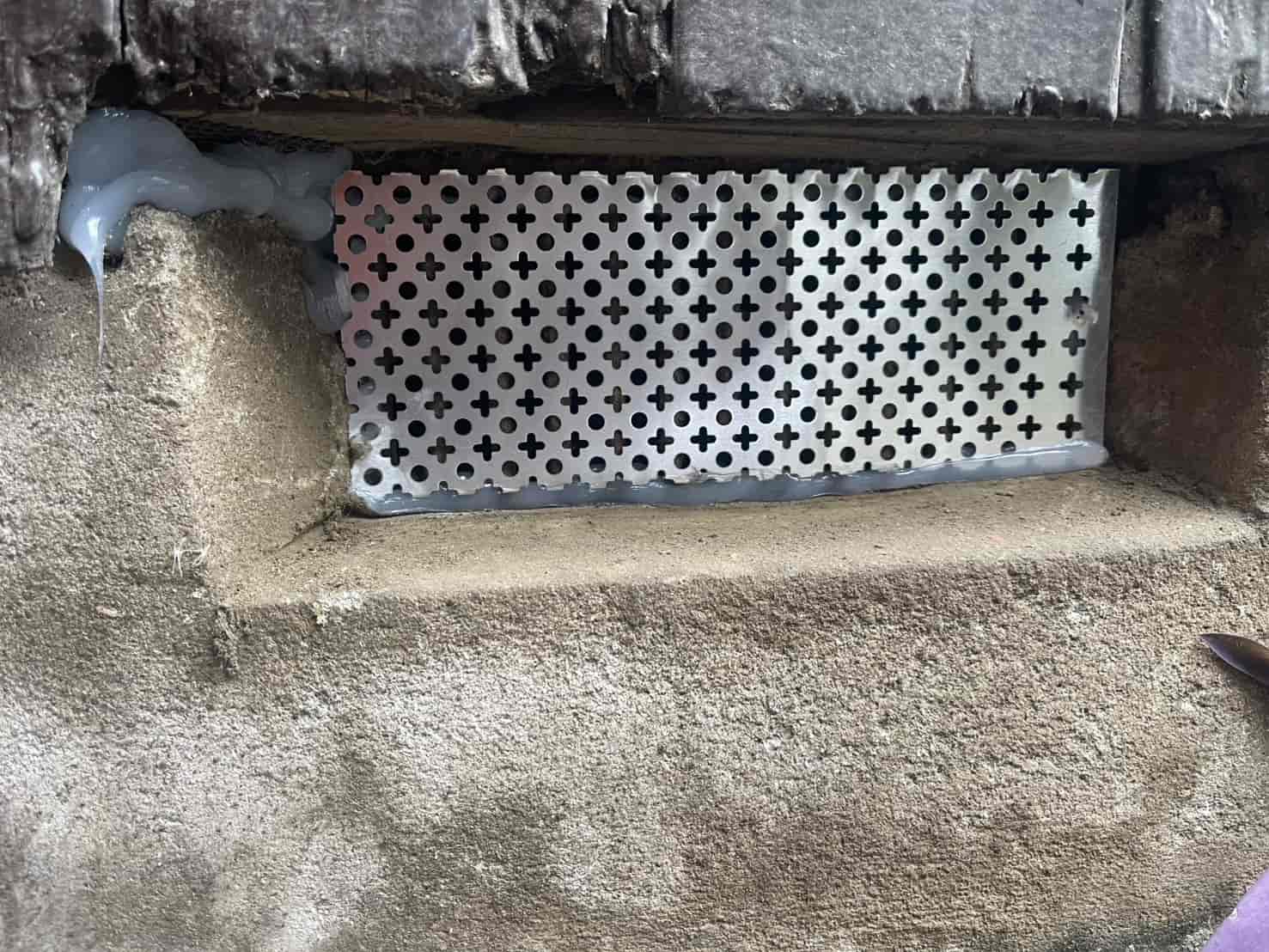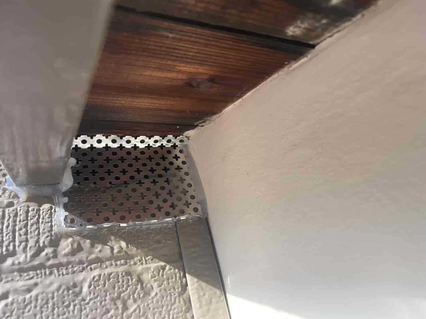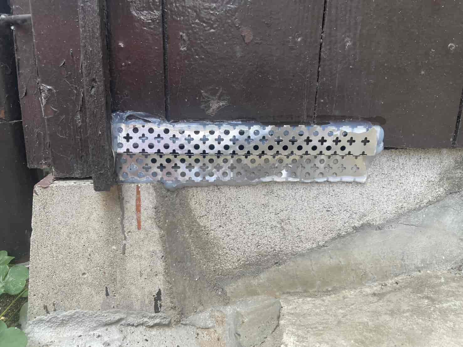 続いて、 侵入口の完全封鎖 に着手しました。まず、閉じ忘れられていた通気口には新しくアルミ製の防鼠金網を取り付け、丁寧に固定。軒天の柱の隙間についても、金物、コーキングで塞ぎました。