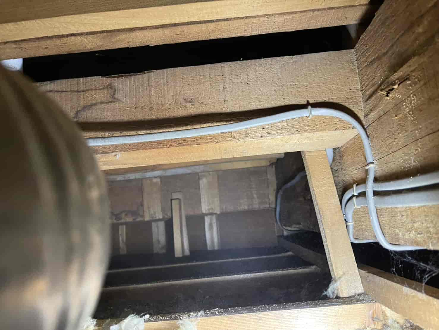 まず天井裏点検口から内部へ入り、ライトとカメラで詳細な状況を確認しました。天井裏の断熱材上には無数のネズミのフンが散乱しており、量や新しさからみても 現在進行形の被害 が続いていることが明確でした。フンの形状はクマネズミ特有の細長いタイプで、乾燥した古いフンと黒く湿気を帯びた新しいフンが混在していたため、数週間以上にわたり天井裏を通路として利用していたものと判断できます。