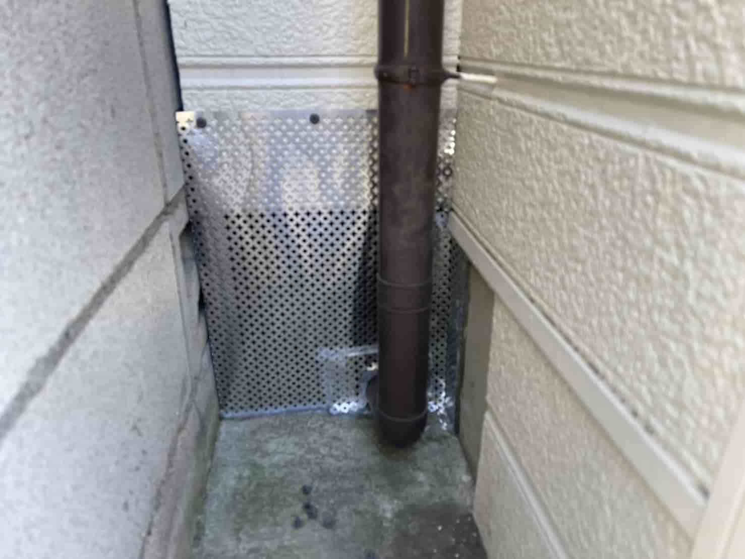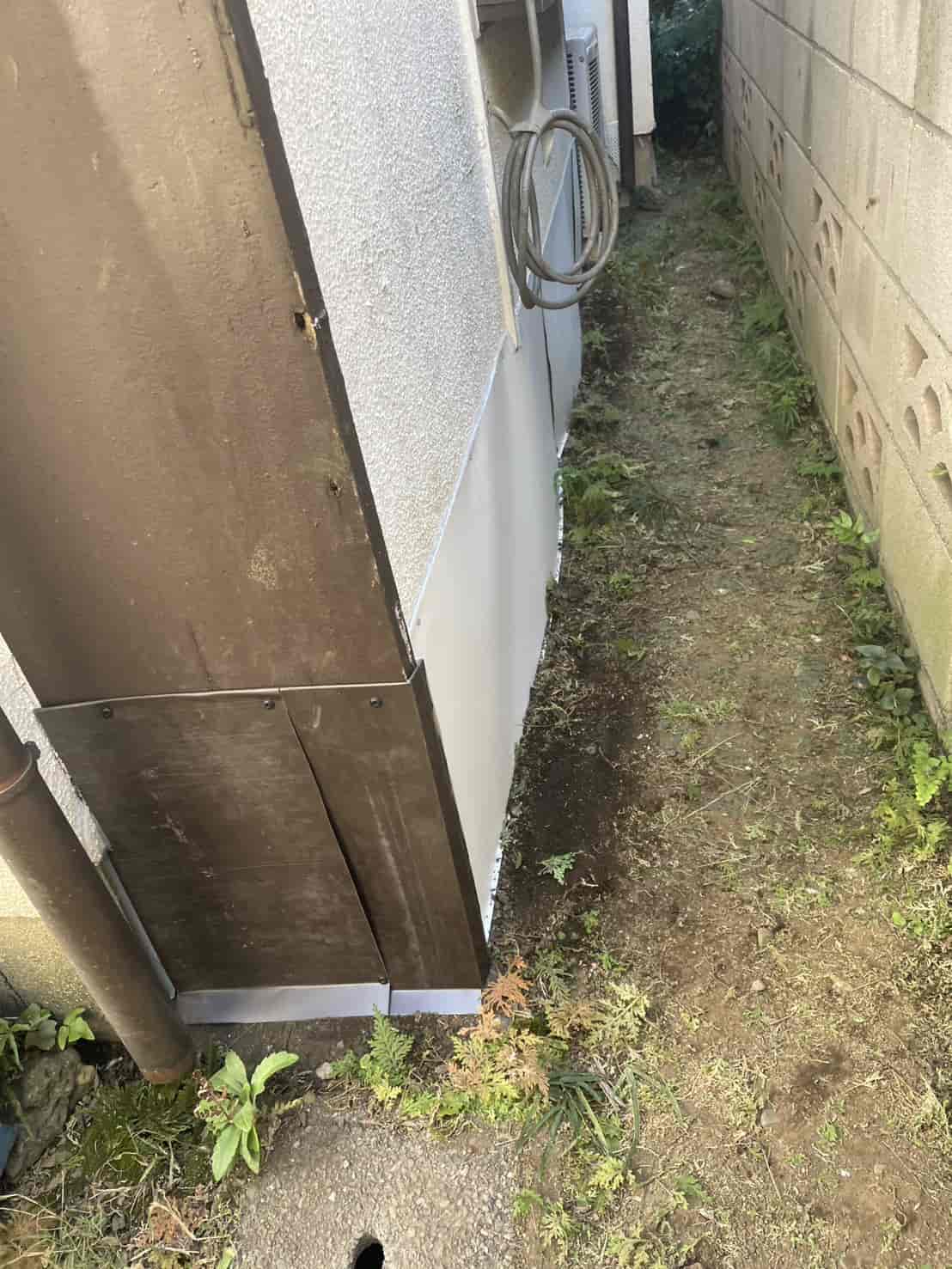 出窓下の侵入口に関しては、市販のパテや簡易的なスポンジでは長期的な効果が得られないため、耐久性の高い 板金加工物を現場で採寸・製作し、確実に隙間を塞ぐ処置 を行いました。外壁の形状に合わせて曲げ加工した板金をビス止めし、さらにシーリングで雨水の浸入も防止する構造としています。