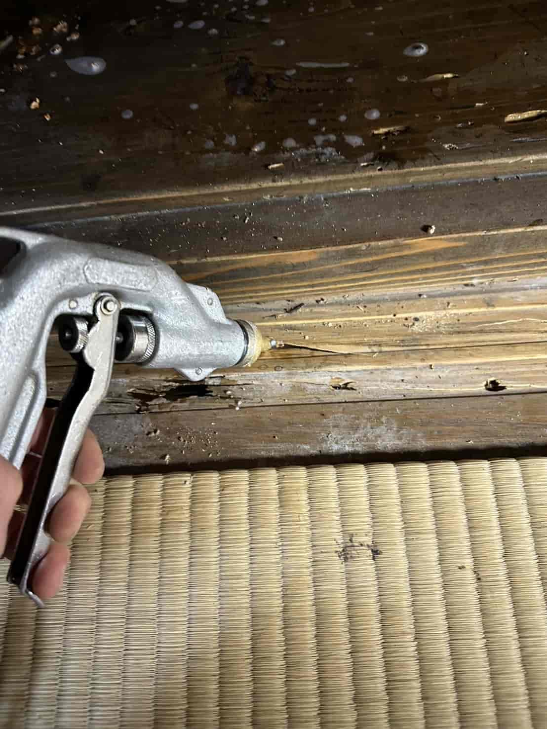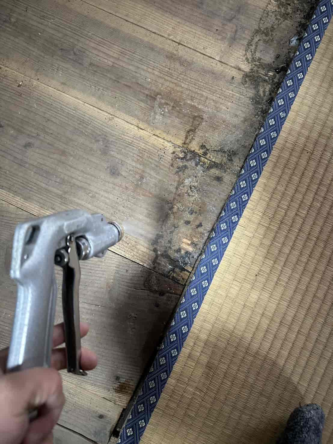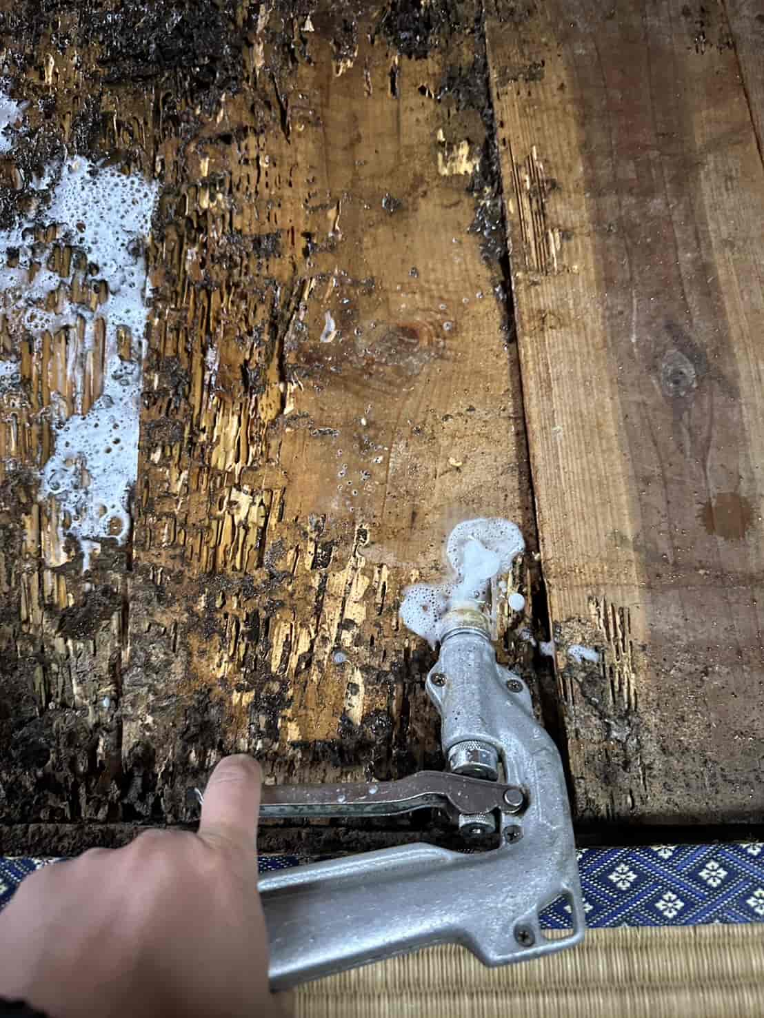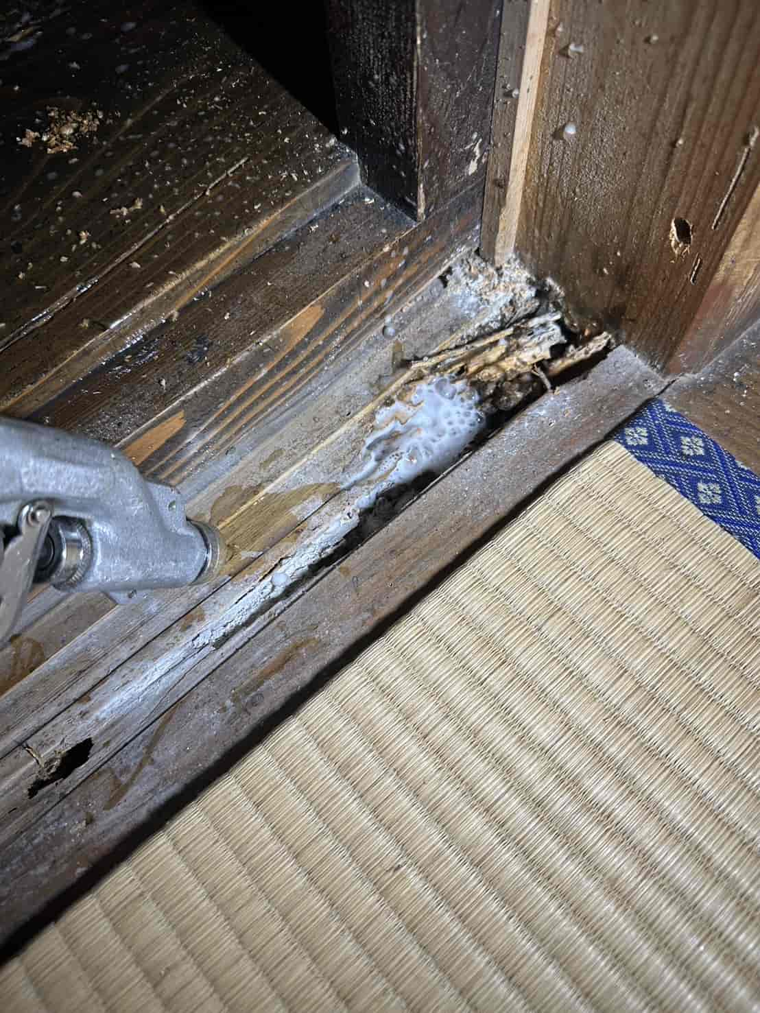 室内への被害痕跡も確認できたため、畳下の白アリ対策として消毒処理を実施しました。畳は湿気を含みやすく、白アリにとって好条件となることがあります。畳を一時的に上げ、下地部分の確認と消毒を行い、再発防止処置を徹底しました。