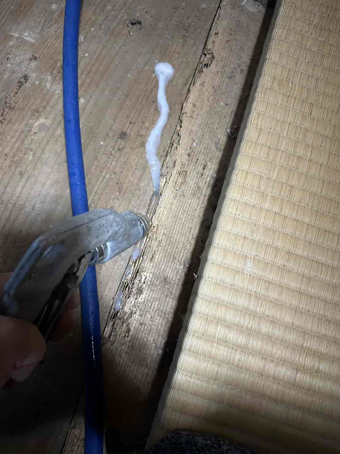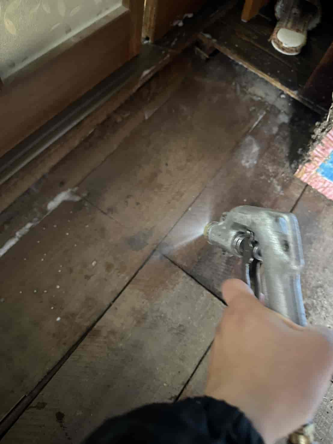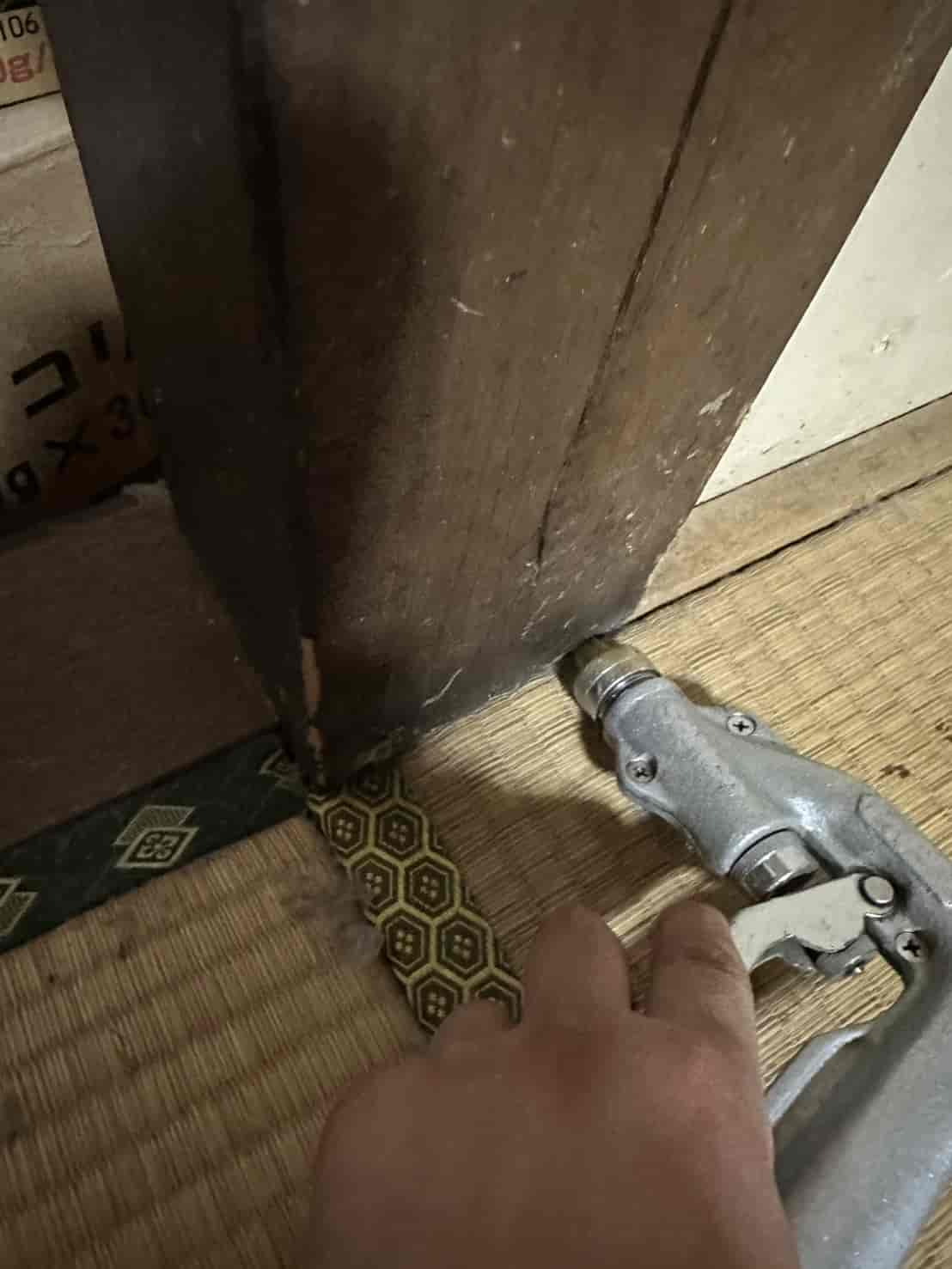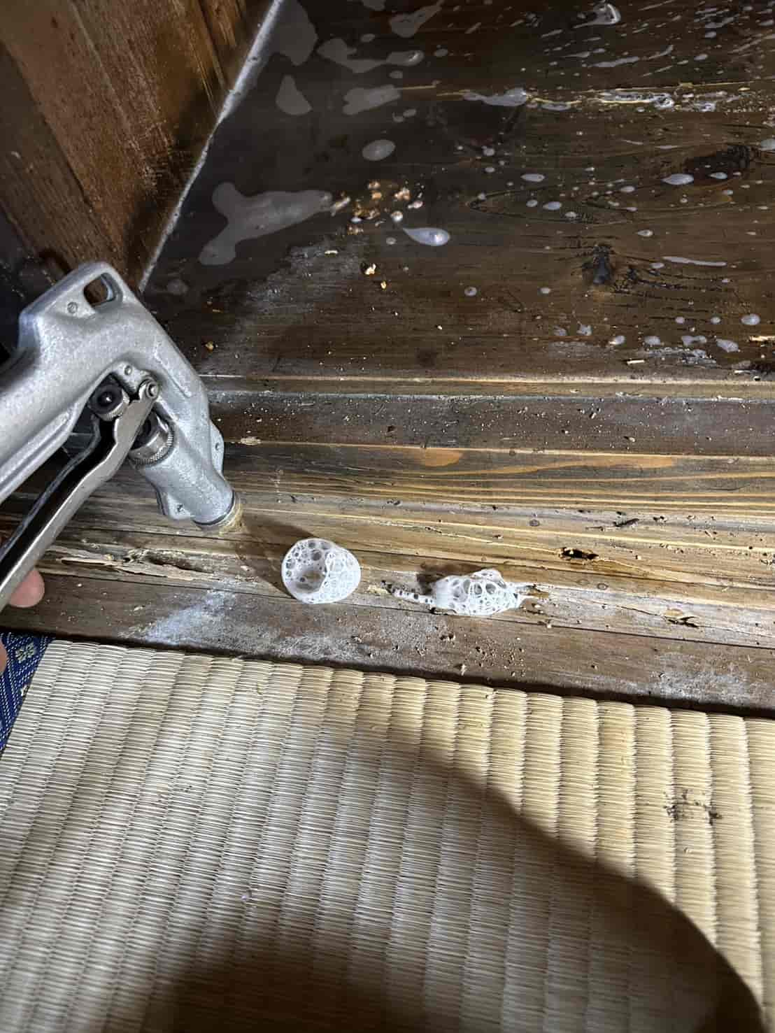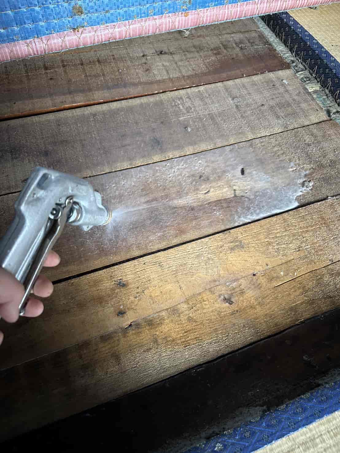 室内への被害痕跡も確認できたため、畳下の白アリ対策として消毒処理を実施しました。畳は湿気を含みやすく、白アリにとって好条件となることがあります。畳を一時的に上げ、下地部分の確認と消毒を行い、再発防止処置を徹底しました。