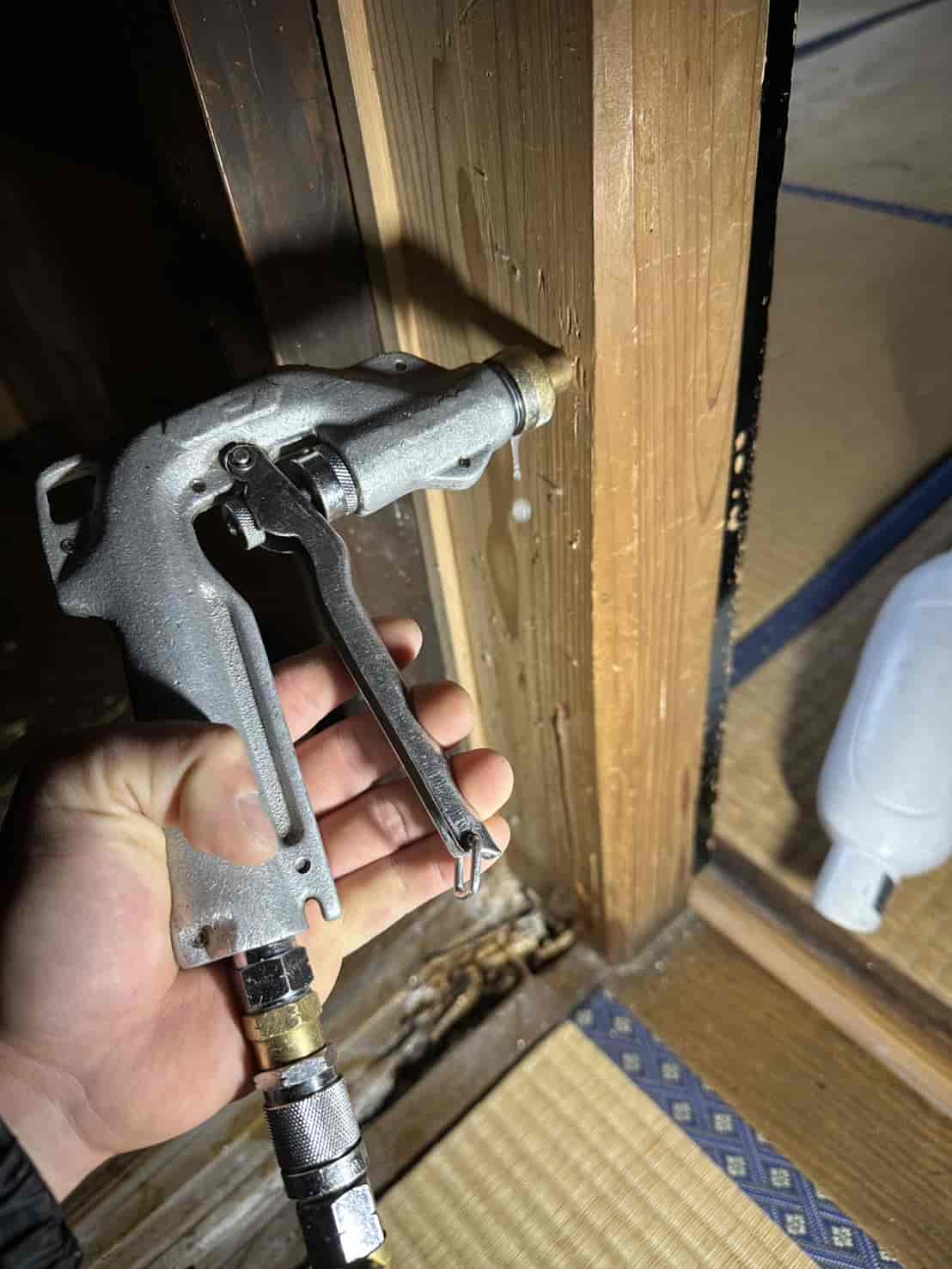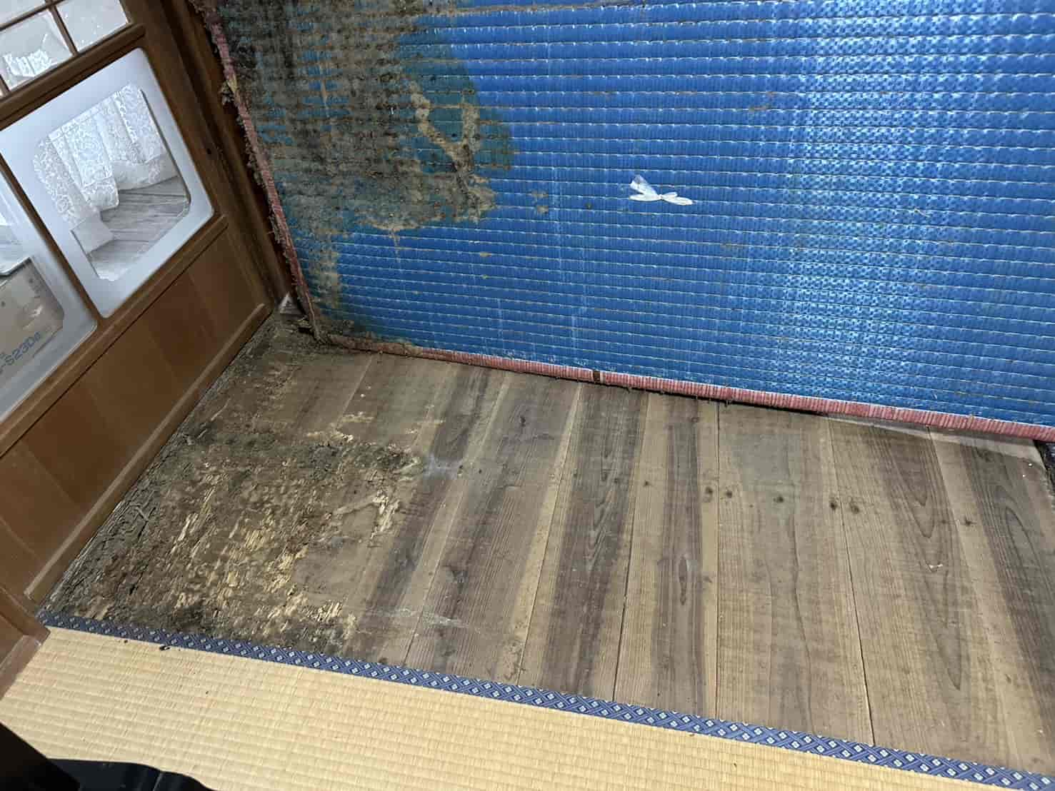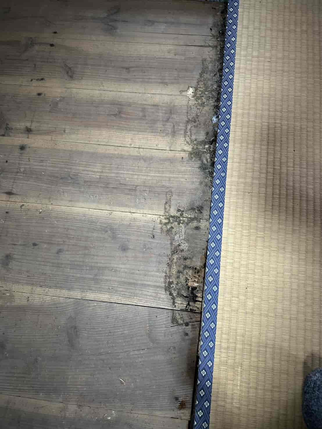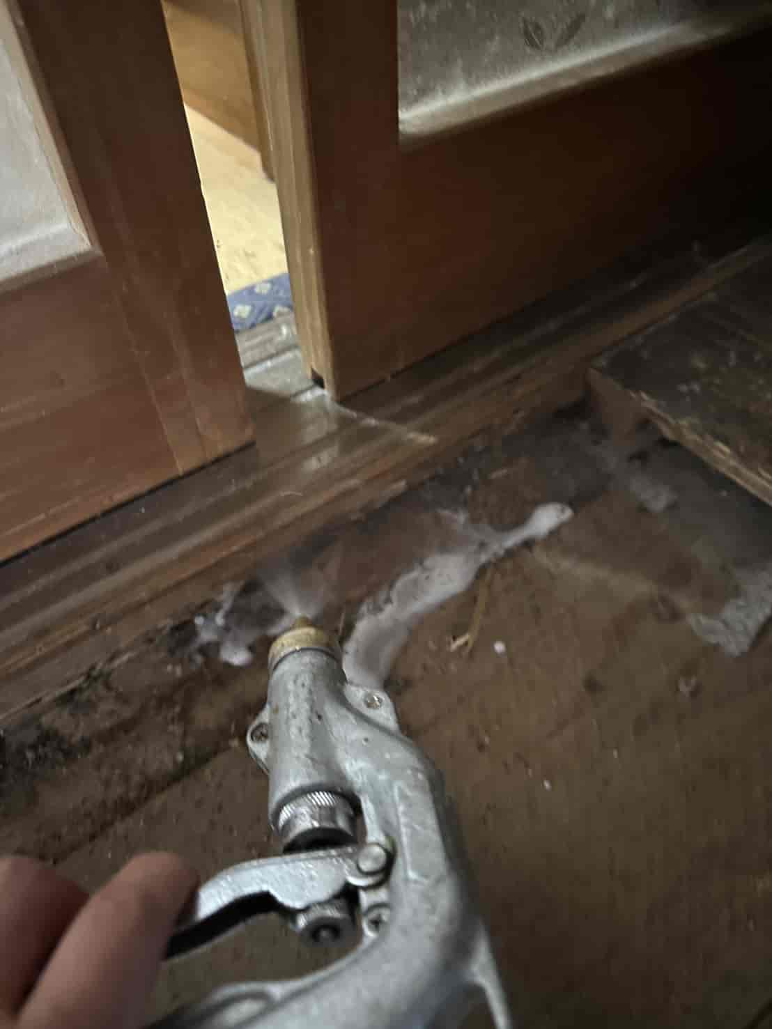 室内への被害痕跡も確認できたため、畳下の白アリ対策として消毒処理を実施しました。畳は湿気を含みやすく、白アリにとって好条件となることがあります。畳を一時的に上げ、下地部分の確認と消毒を行い、再発防止処置を徹底しました。