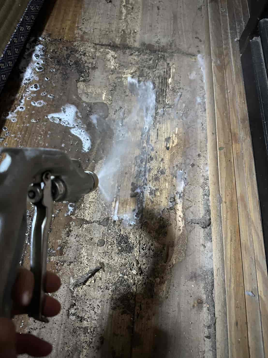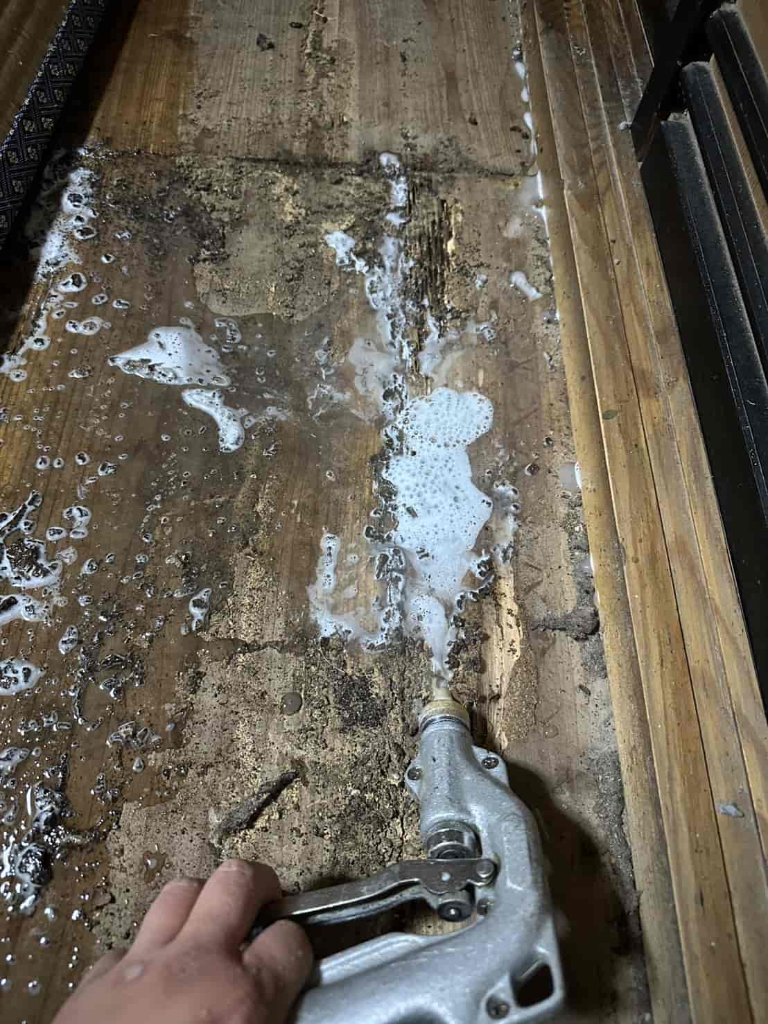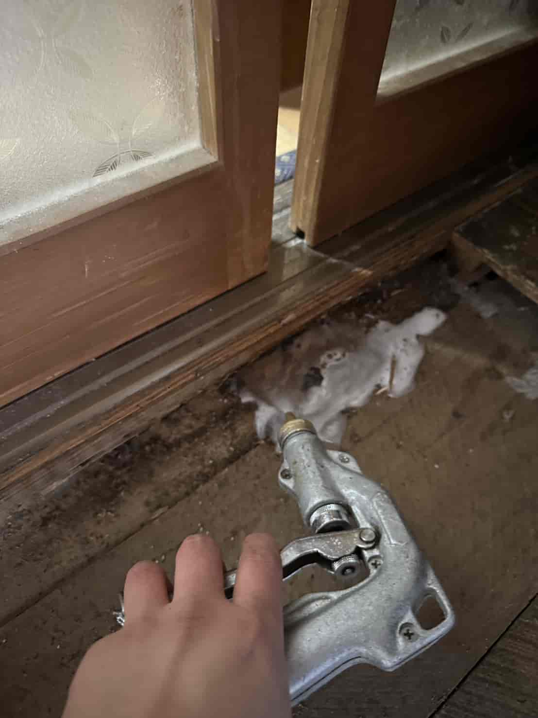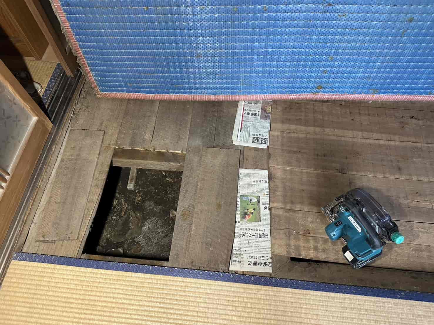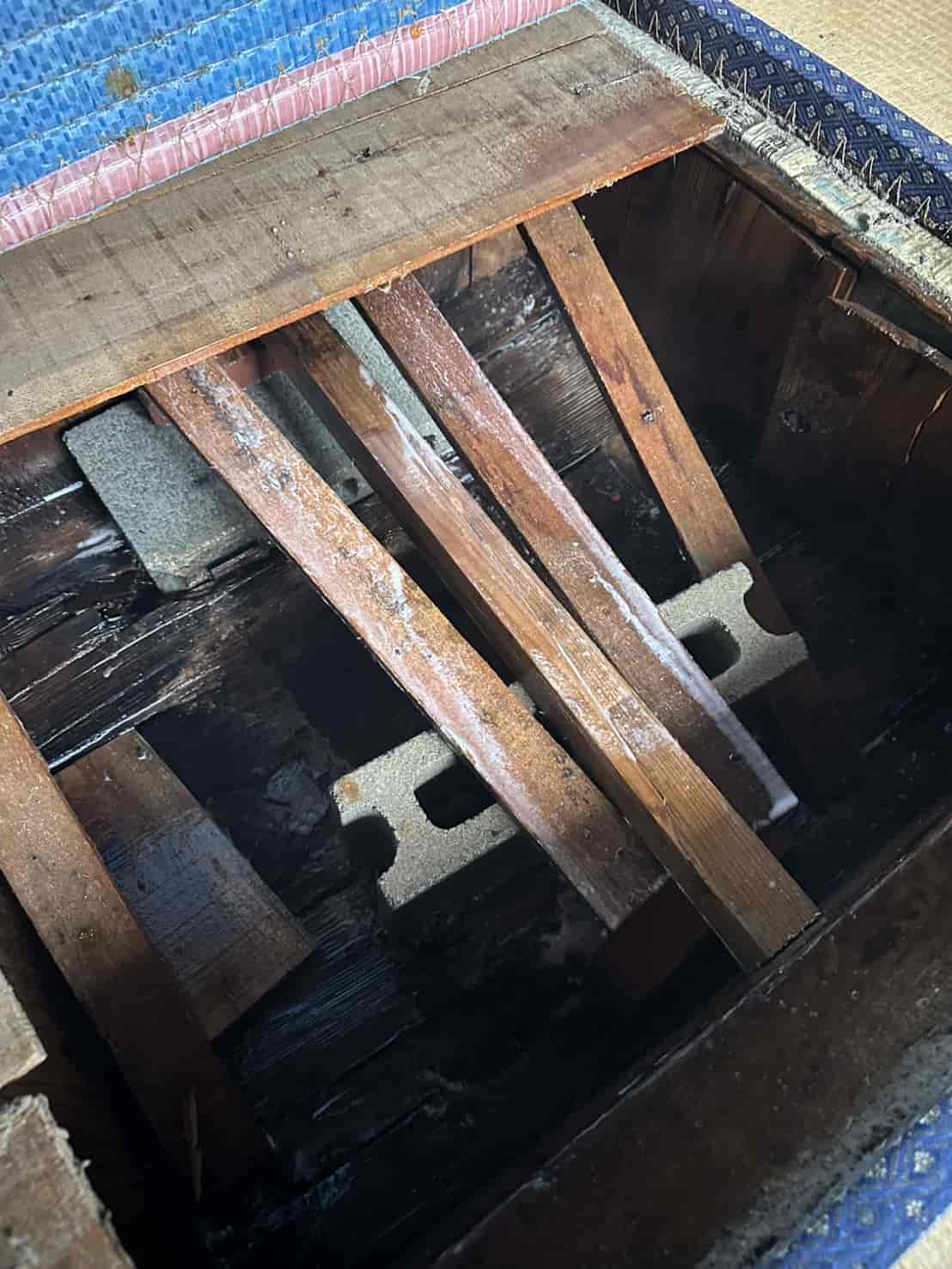室内への被害痕跡も確認できたため、畳下の白アリ対策として消毒処理を実施しました。畳は湿気を含みやすく、白アリにとって好条件となることがあります。畳を一時的に上げ、下地部分の確認と消毒を行い、再発防止処置を徹底しました。