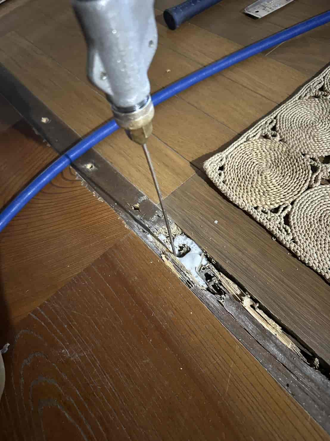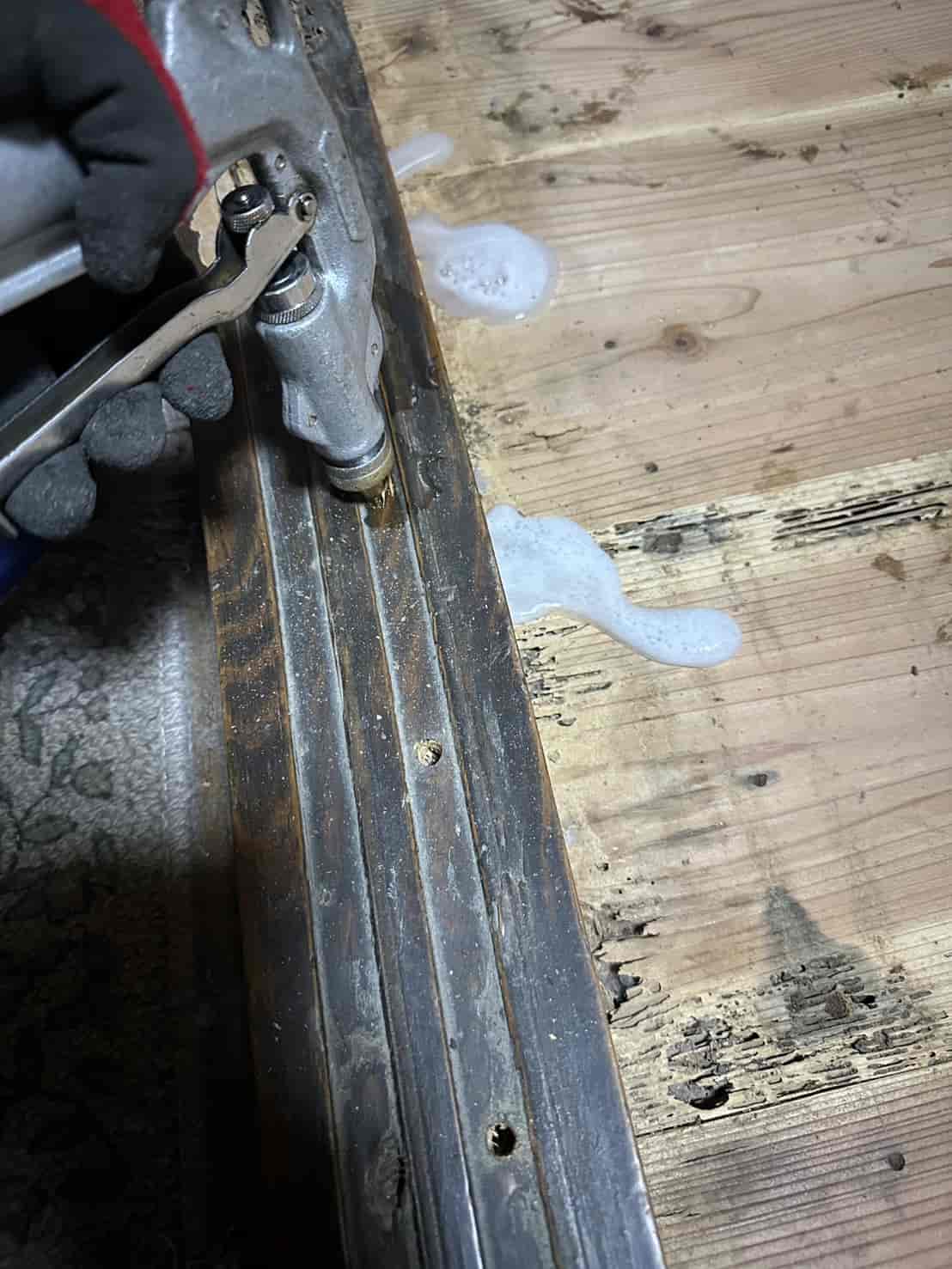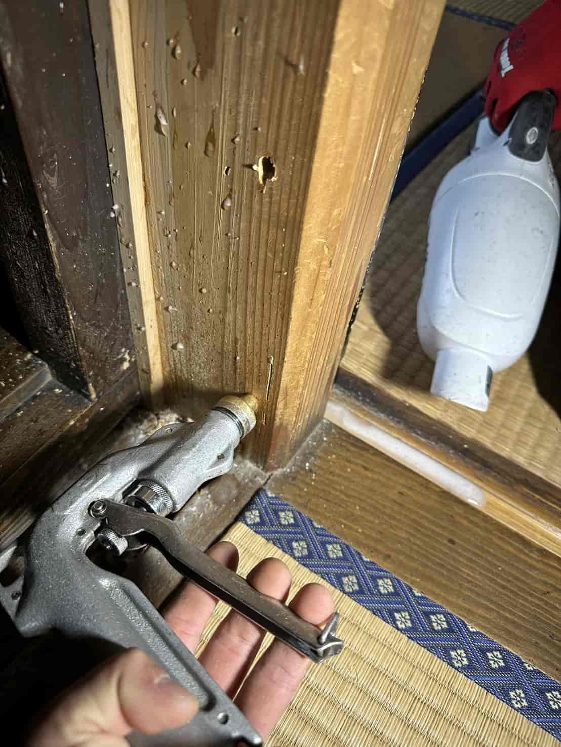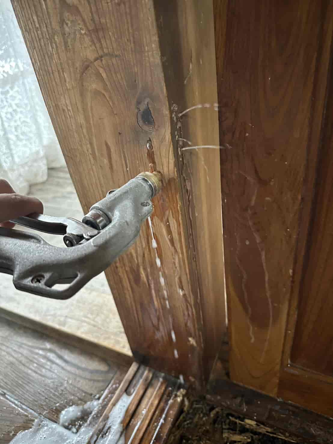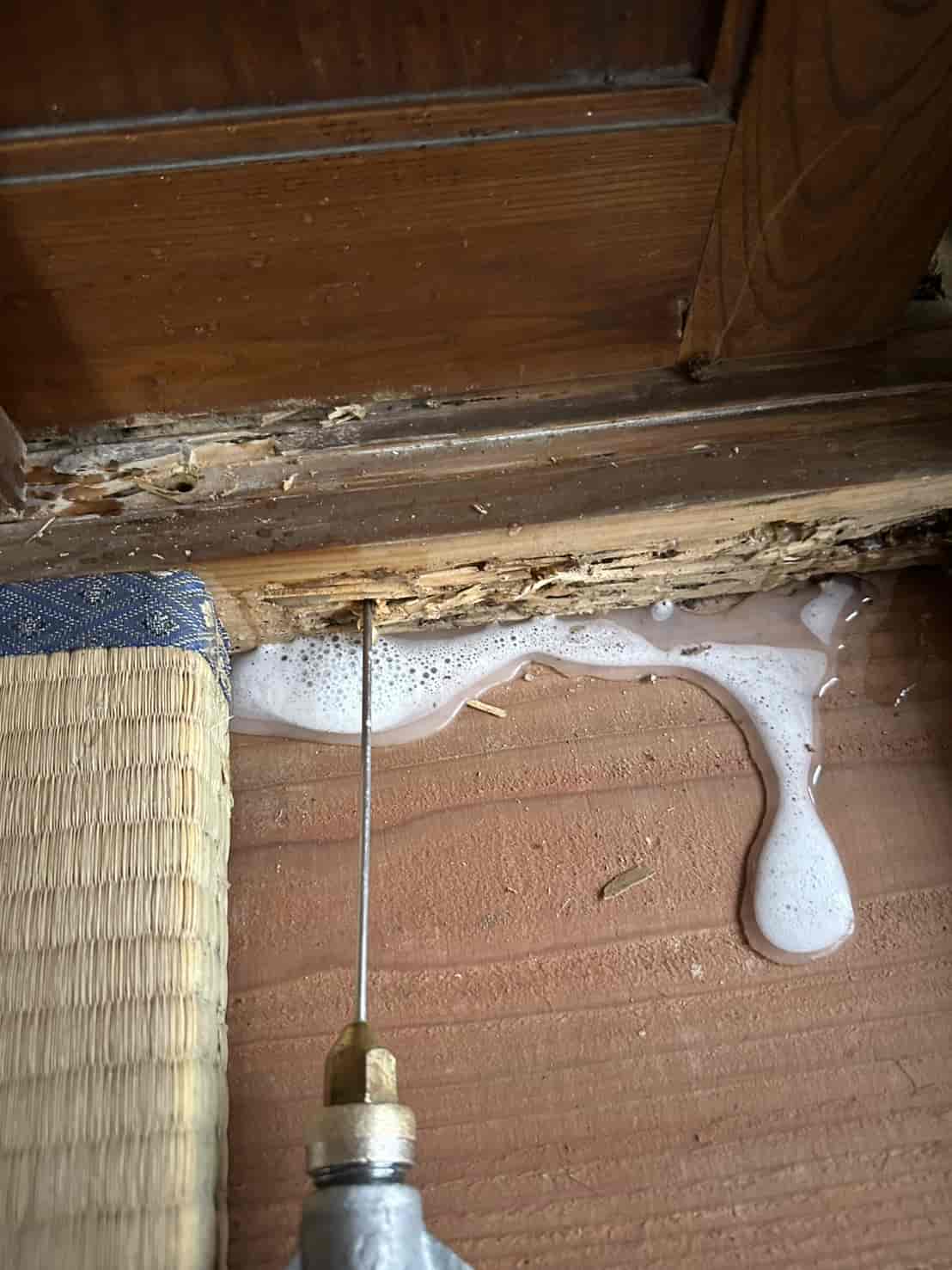 被害が進行している木部に対しては、表面散布だけでは十分ではありません。内部まで薬剤を浸透させる必要があります。専用ドリルで木部へ穿孔し、高濃度薬剤を直接注入。内部に潜伏している白アリや卵に対しても効果を発揮させます。特に土台・大引きなど構造上重要な部分は重点的に処理しました。これは被害が深刻な現場では欠かせない工程です。