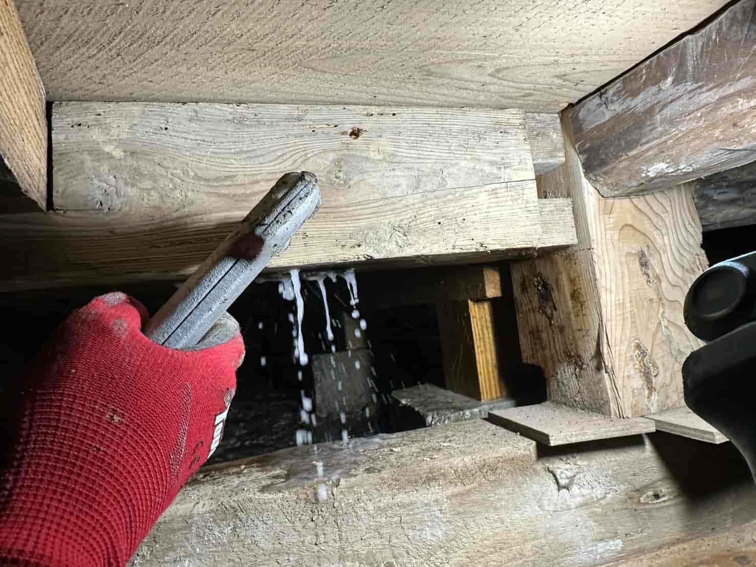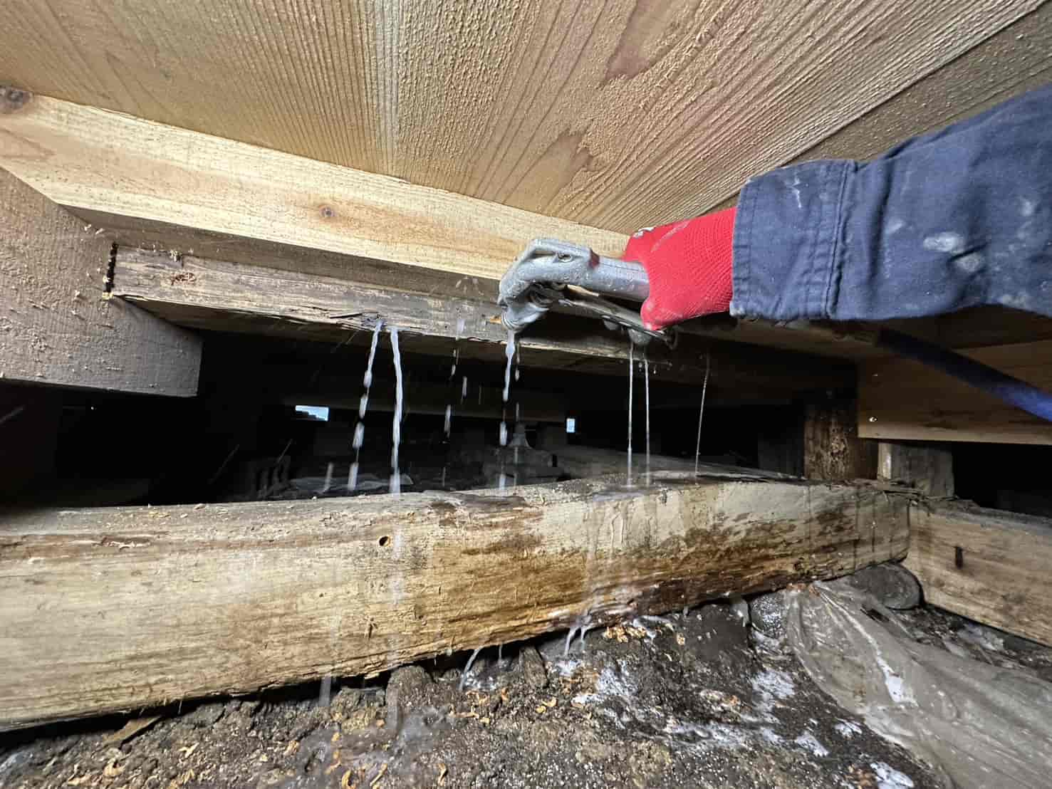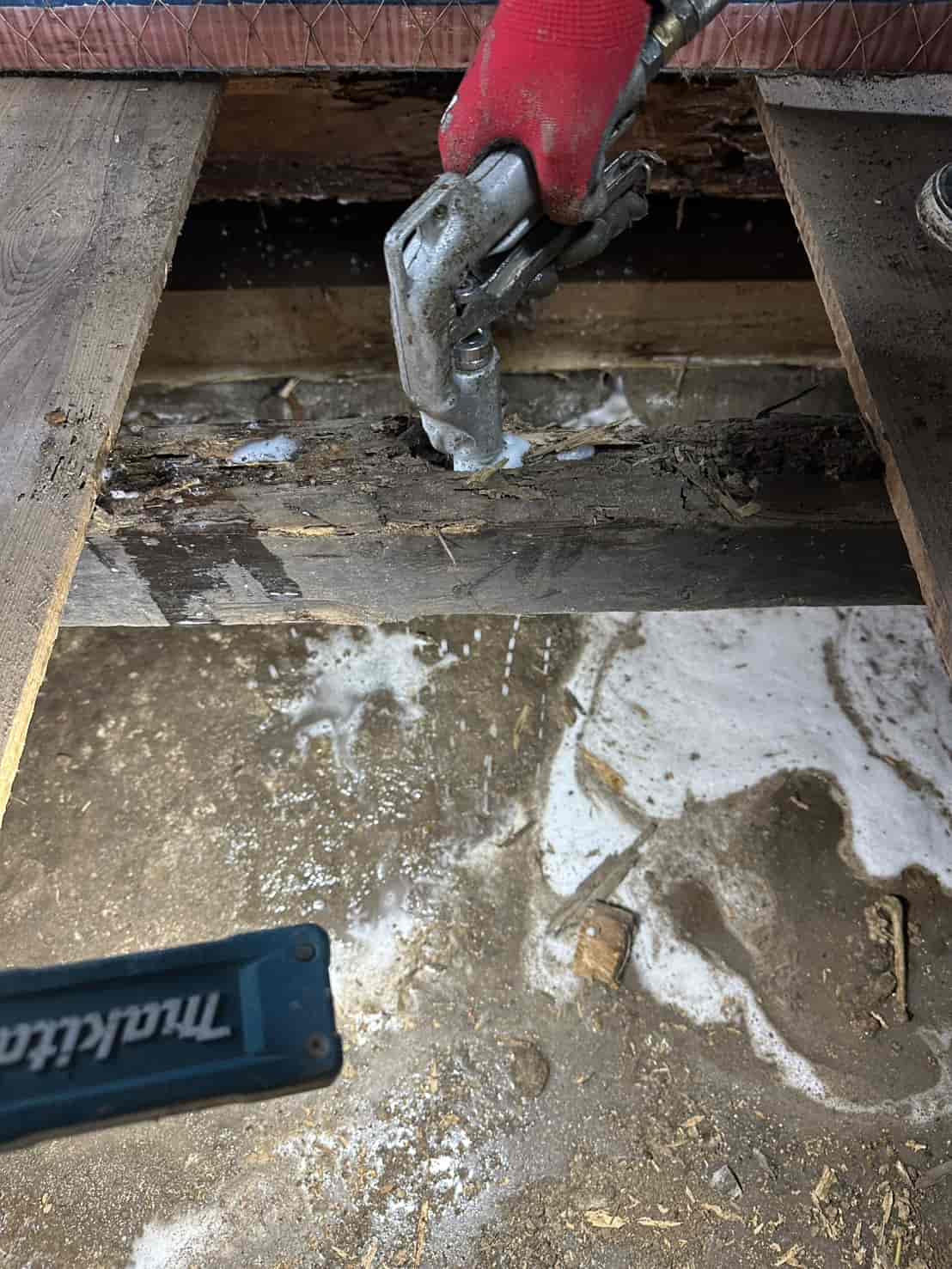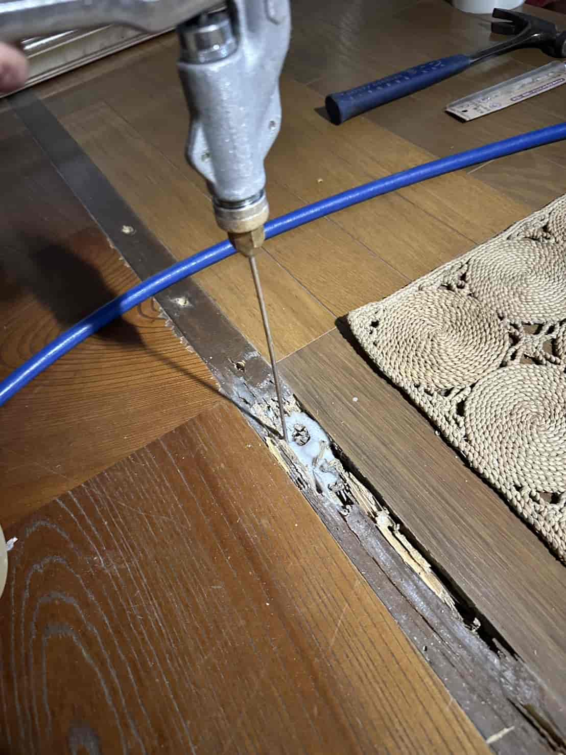 被害が進行している木部に対しては、表面散布だけでは十分ではありません。内部まで薬剤を浸透させる必要があります。専用ドリルで木部へ穿孔し、高濃度薬剤を直接注入。内部に潜伏している白アリや卵に対しても効果を発揮させます。特に土台・大引きなど構造上重要な部分は重点的に処理しました。これは被害が深刻な現場では欠かせない工程です。