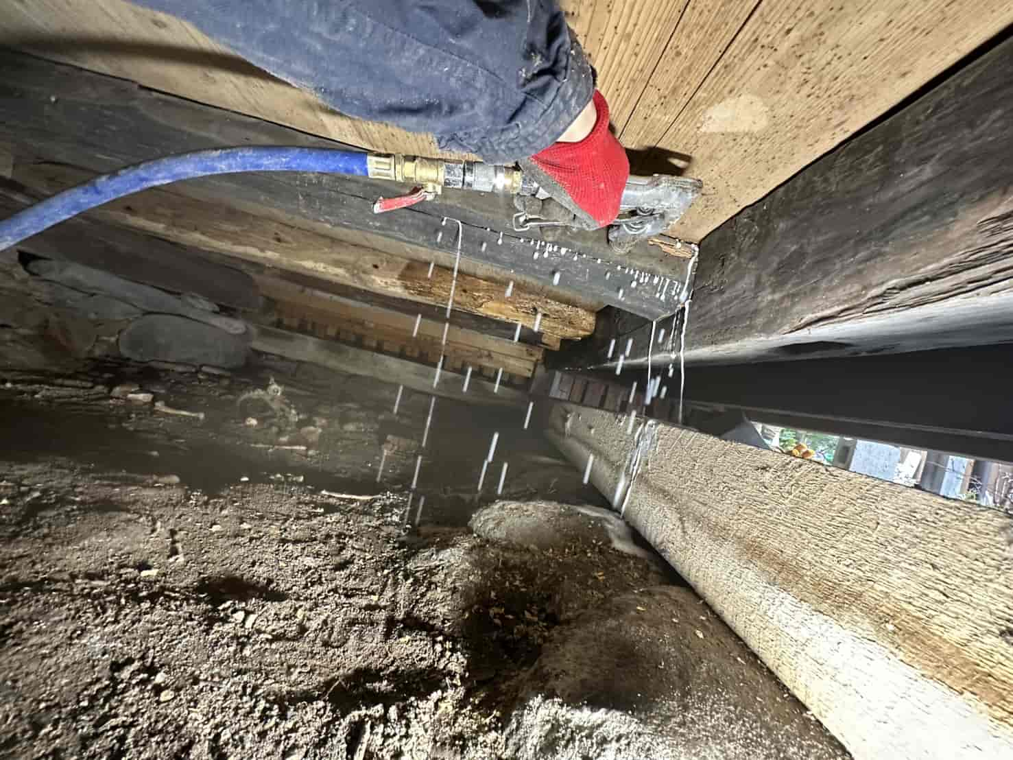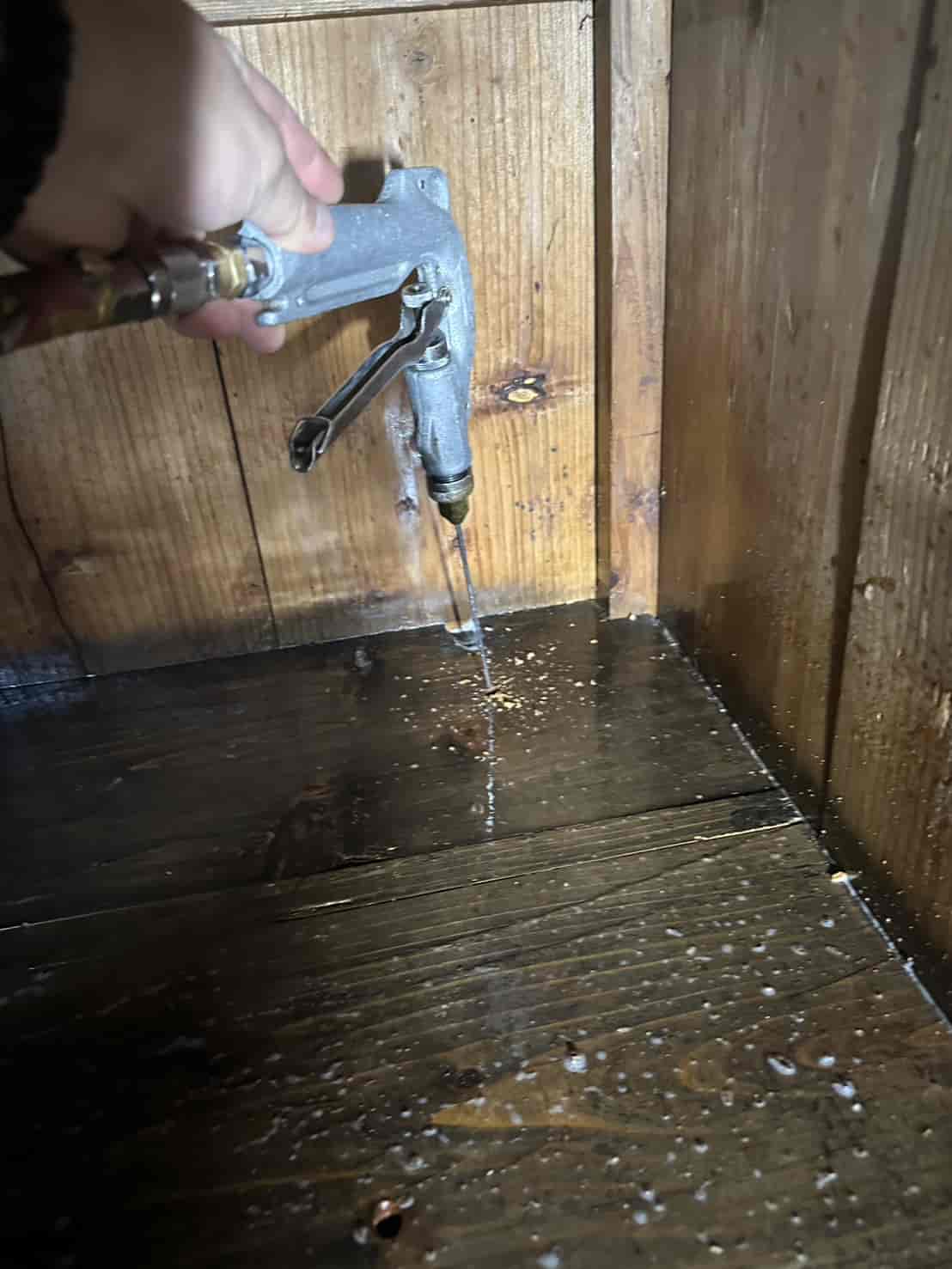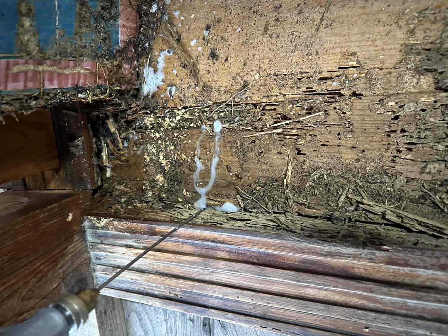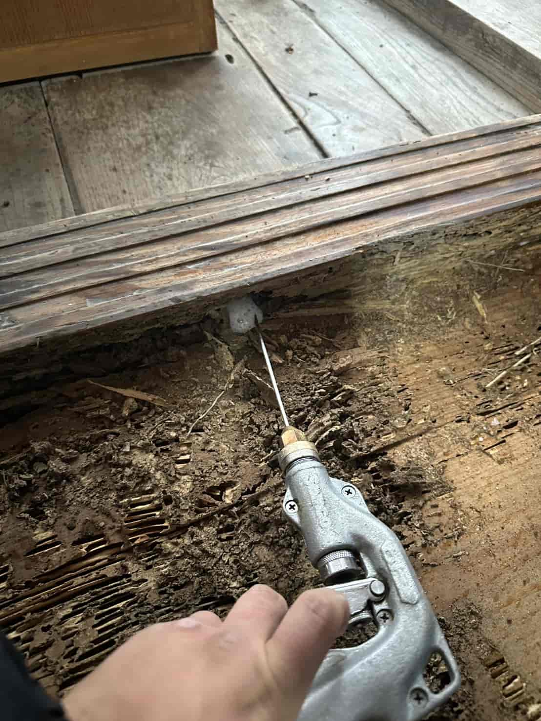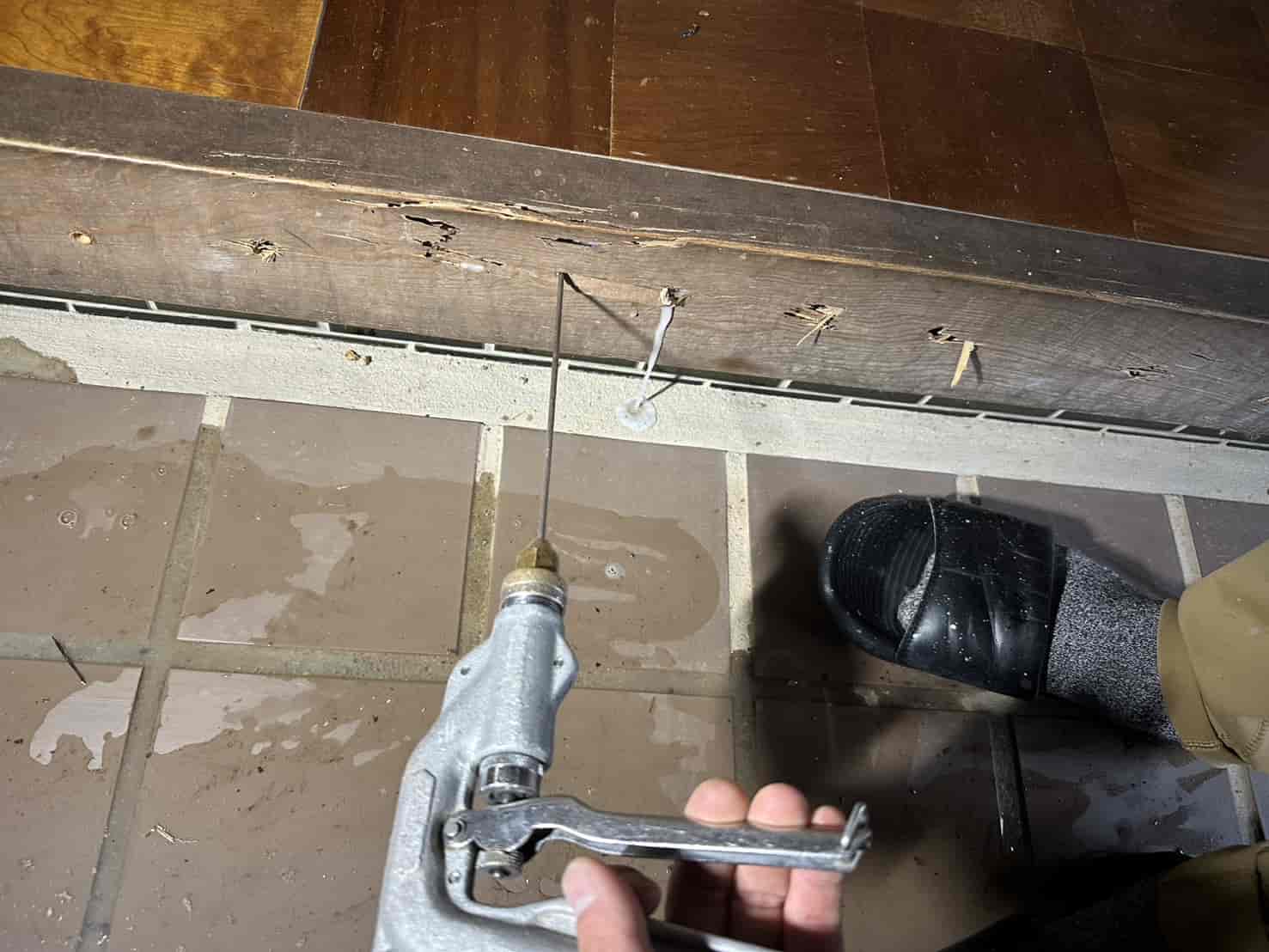 被害が進行している木部に対しては、表面散布だけでは十分ではありません。内部まで薬剤を浸透させる必要があります。専用ドリルで木部へ穿孔し、高濃度薬剤を直接注入。内部に潜伏している白アリや卵に対しても効果を発揮させます。特に土台・大引きなど構造上重要な部分は重点的に処理しました。これは被害が深刻な現場では欠かせない工程です。