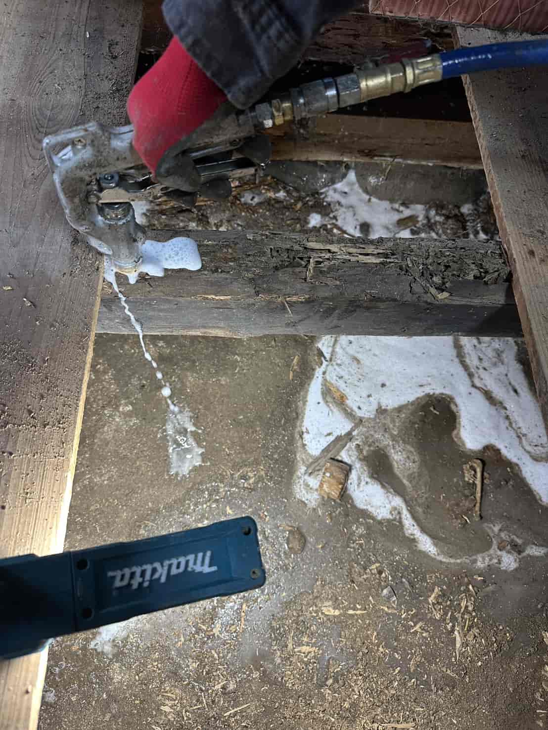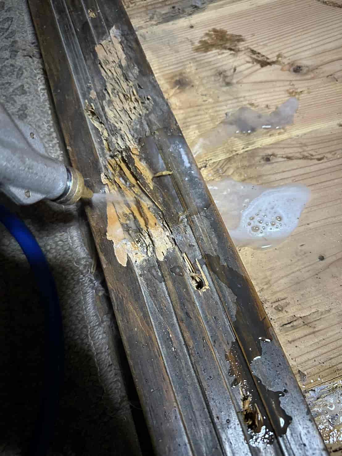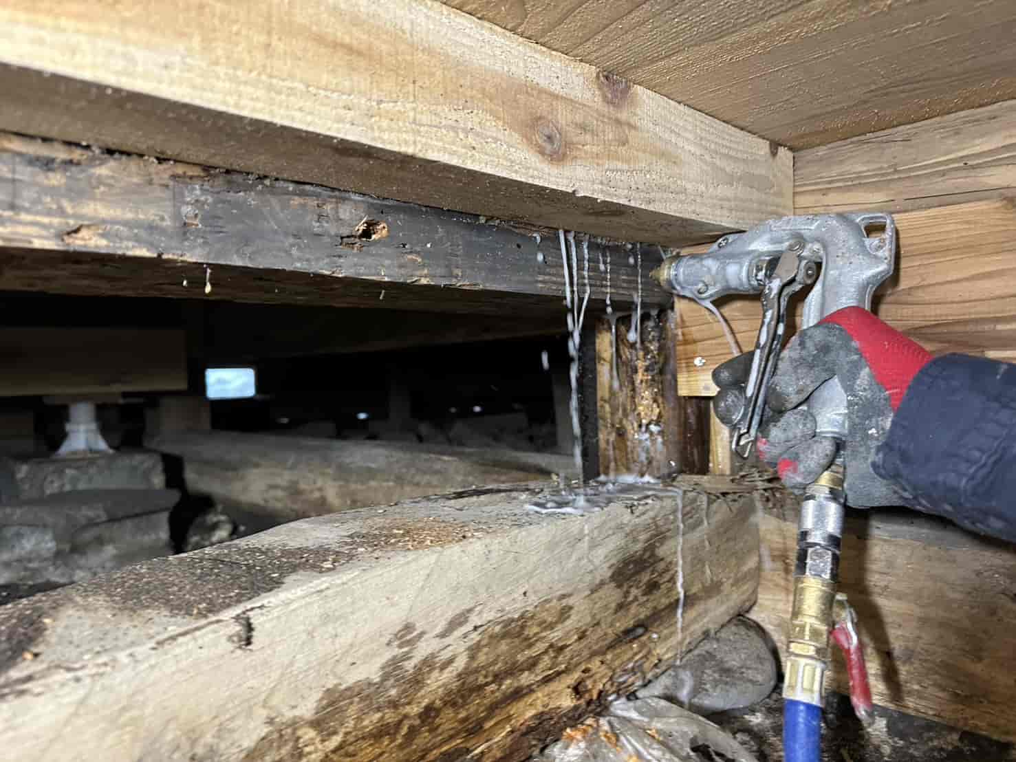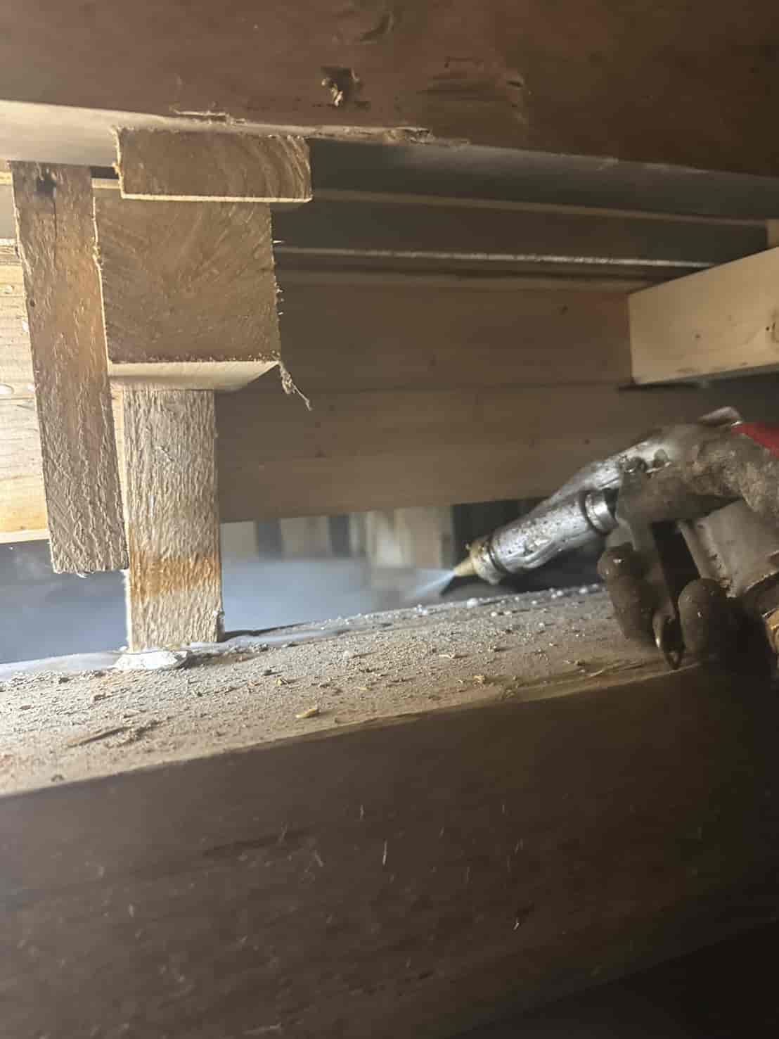 被害が進行している木部に対しては、表面散布だけでは十分ではありません。内部まで薬剤を浸透させる必要があります。専用ドリルで木部へ穿孔し、高濃度薬剤を直接注入。内部に潜伏している白アリや卵に対しても効果を発揮させます。特に土台・大引きなど構造上重要な部分は重点的に処理しました。これは被害が深刻な現場では欠かせない工程です。