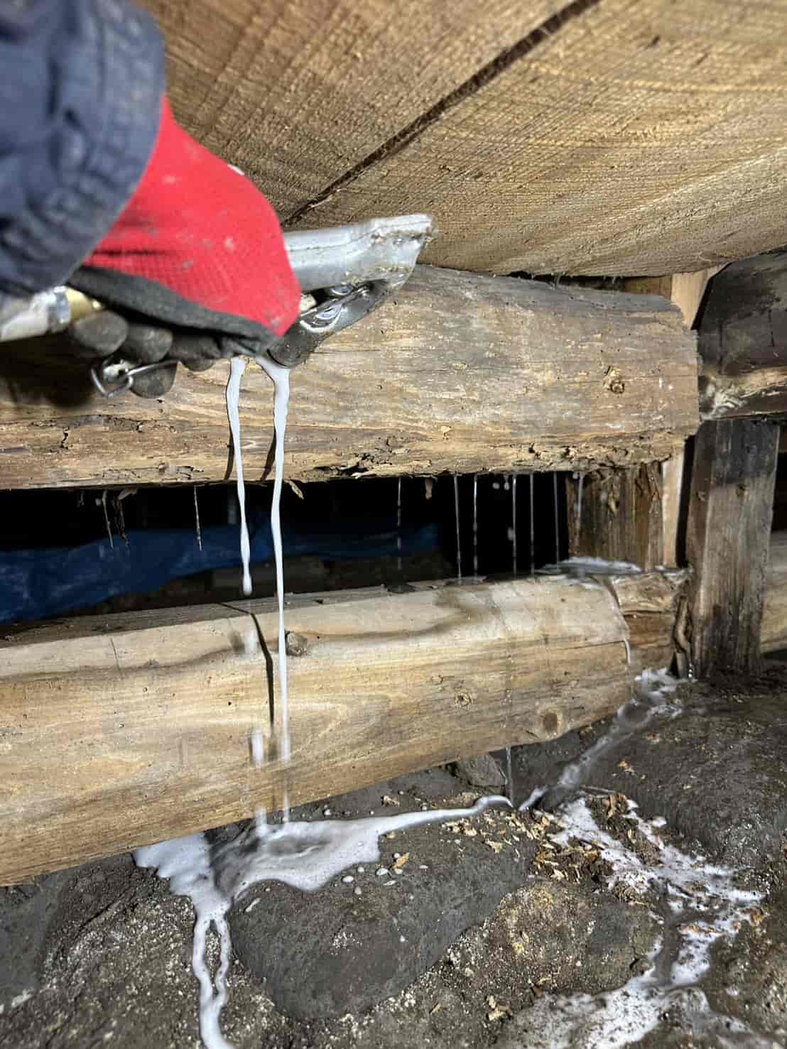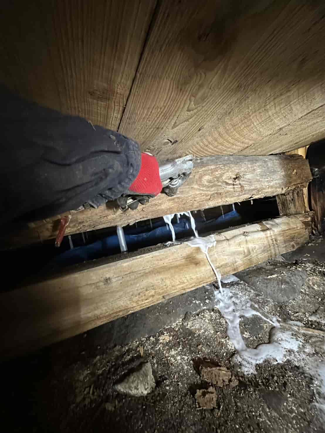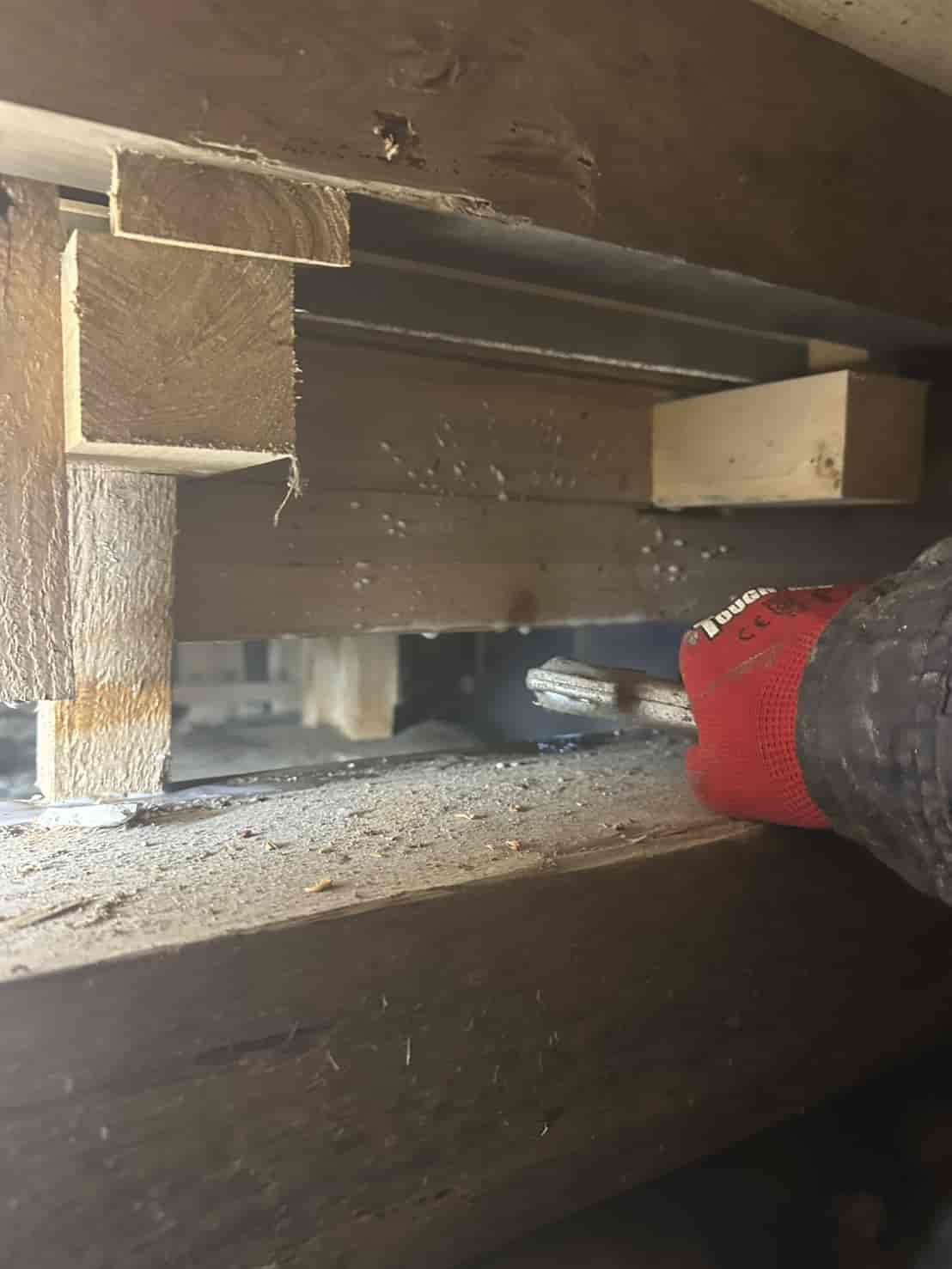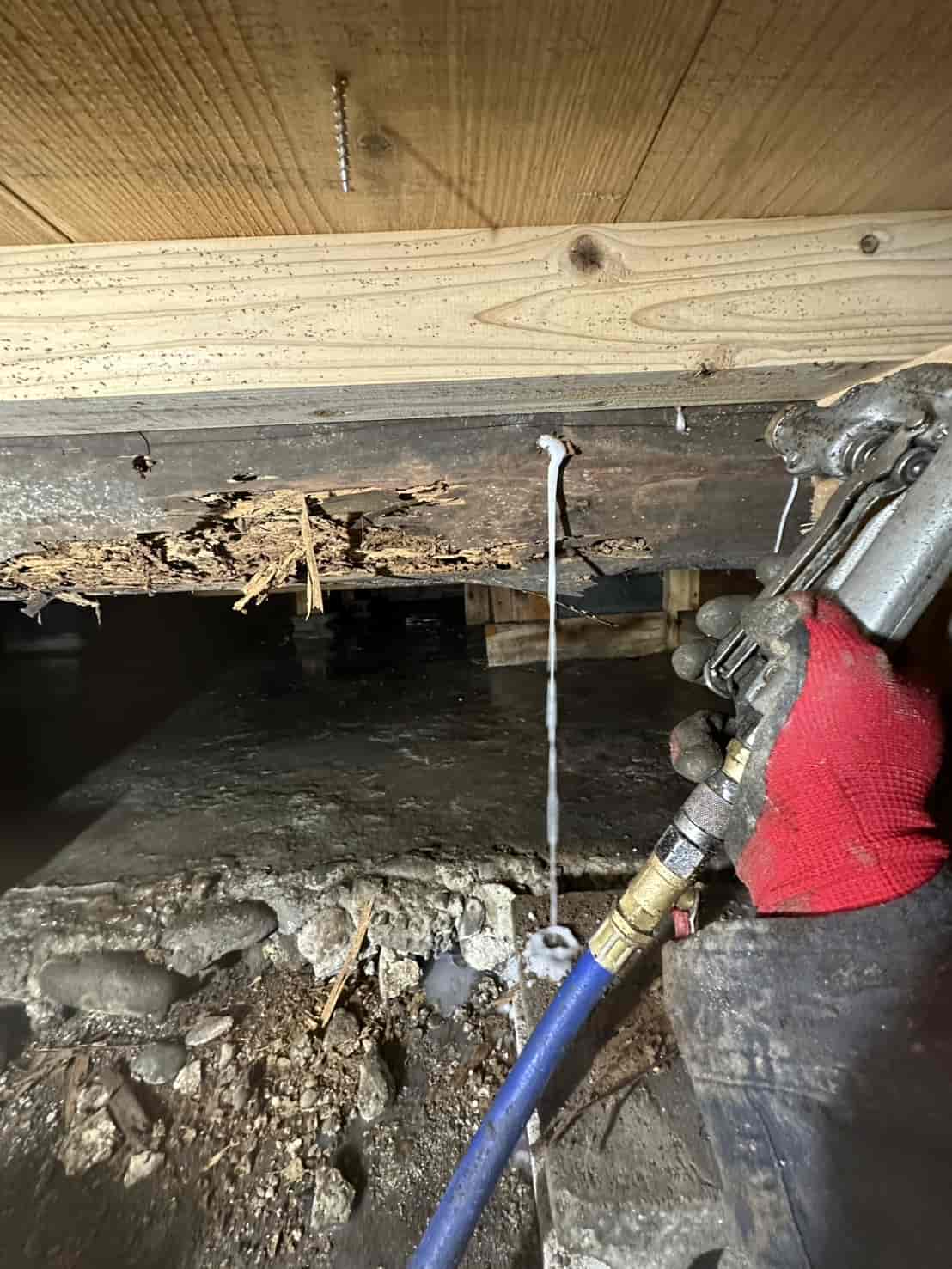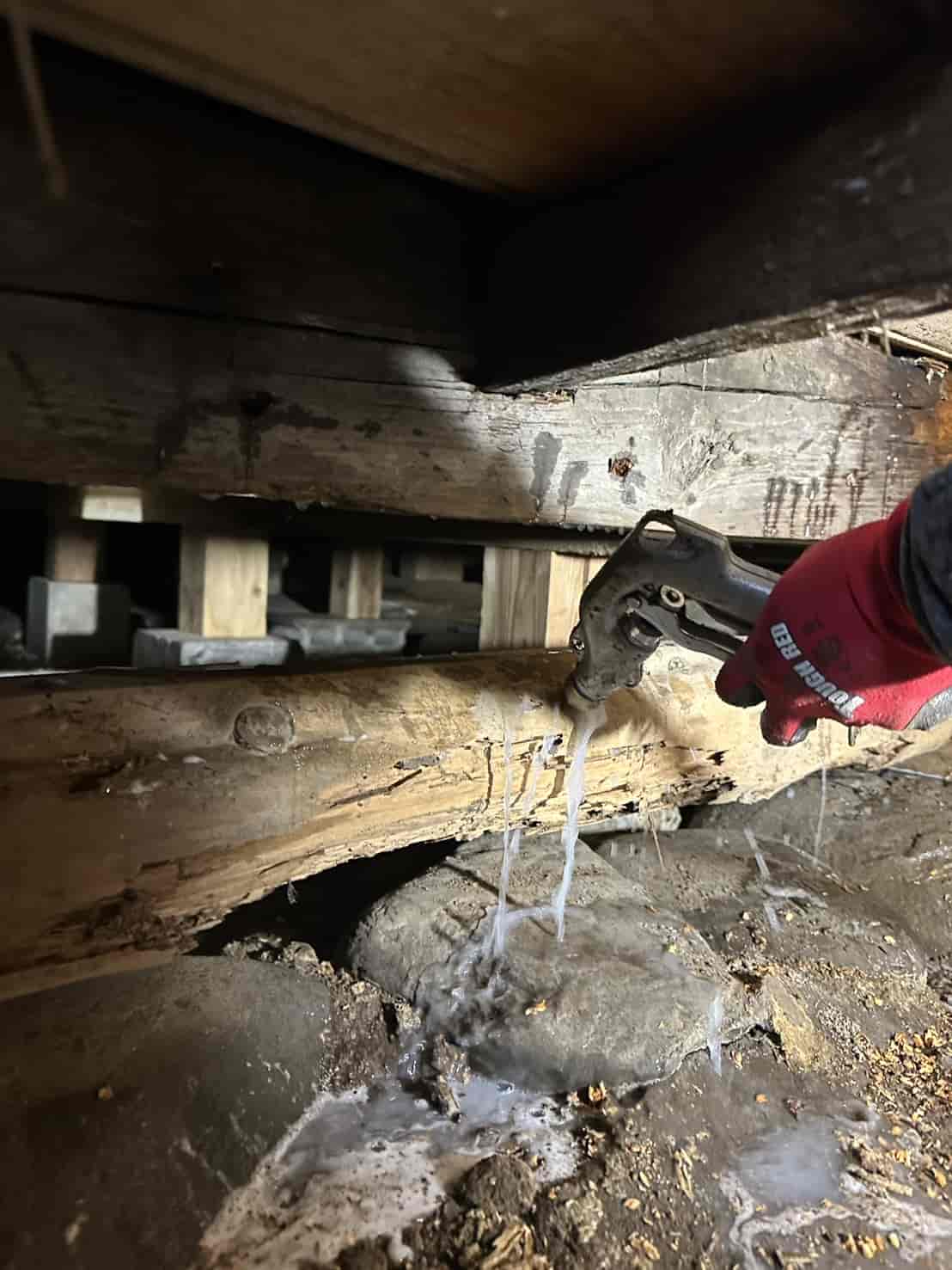 被害が進行している木部に対しては、表面散布だけでは十分ではありません。内部まで薬剤を浸透させる必要があります。専用ドリルで木部へ穿孔し、高濃度薬剤を直接注入。内部に潜伏している白アリや卵に対しても効果を発揮させます。特に土台・大引きなど構造上重要な部分は重点的に処理しました。これは被害が深刻な現場では欠かせない工程です。