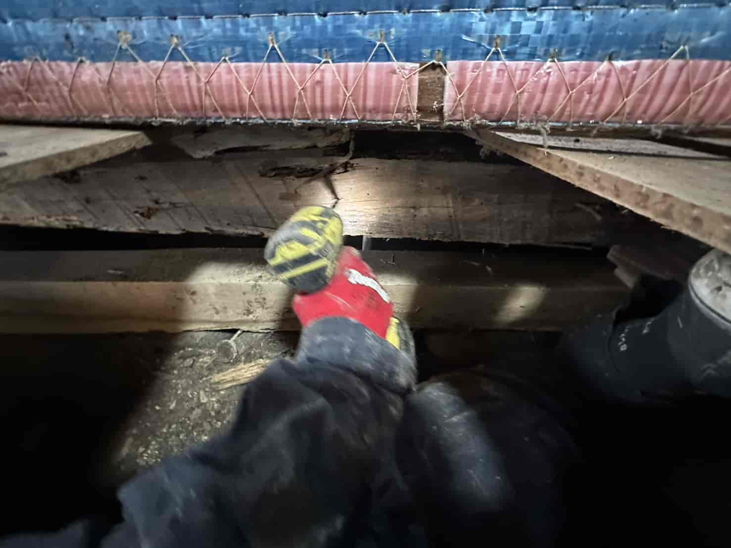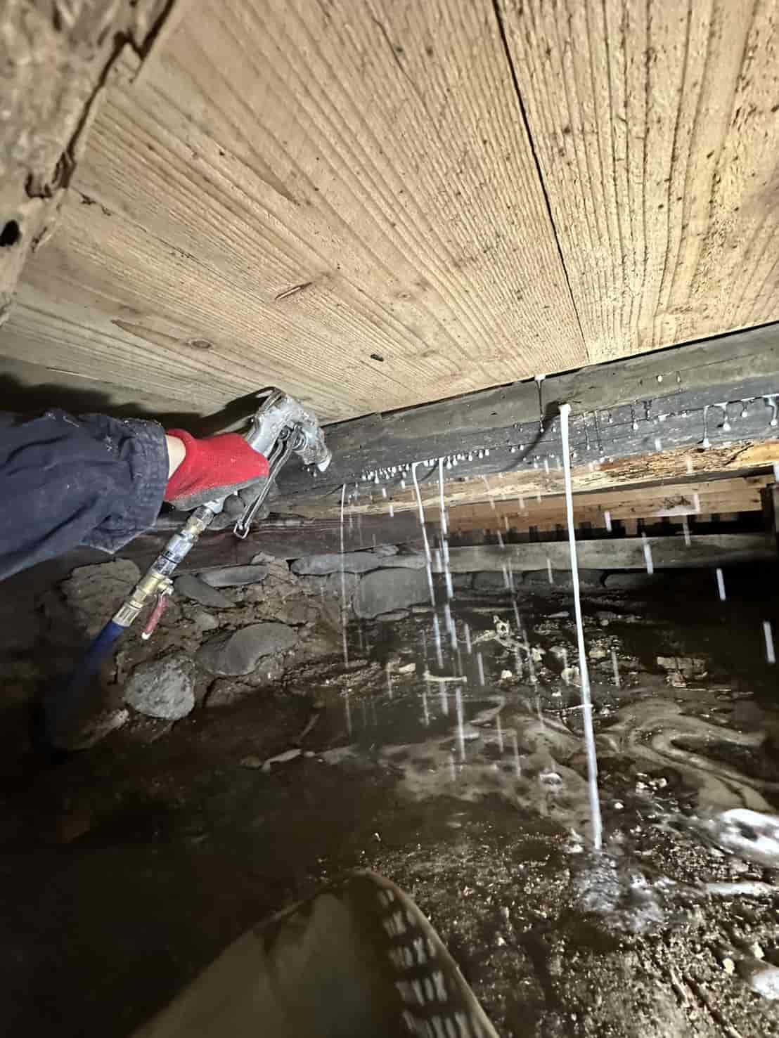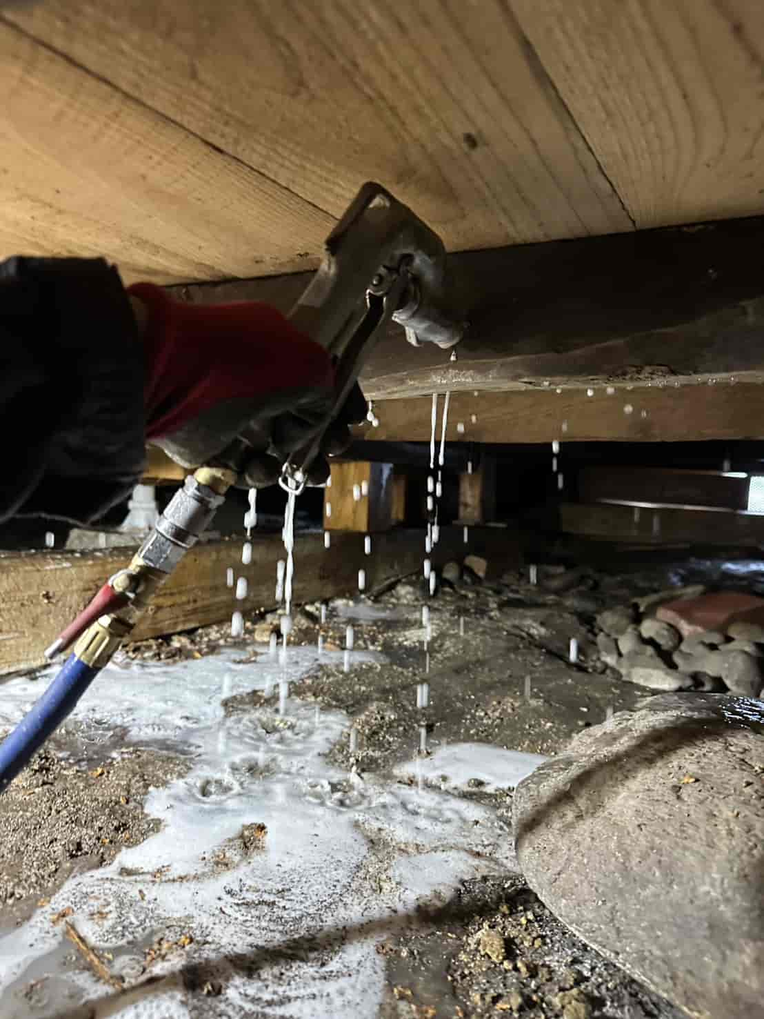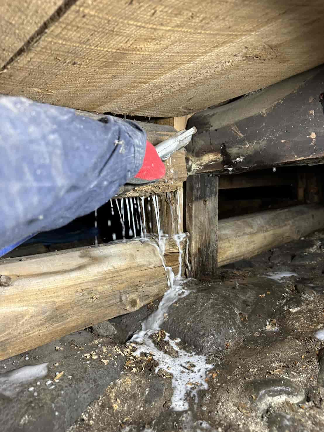 被害が進行している木部に対しては、表面散布だけでは十分ではありません。内部まで薬剤を浸透させる必要があります。専用ドリルで木部へ穿孔し、高濃度薬剤を直接注入。内部に潜伏している白アリや卵に対しても効果を発揮させます。特に土台・大引きなど構造上重要な部分は重点的に処理しました。これは被害が深刻な現場では欠かせない工程です。
