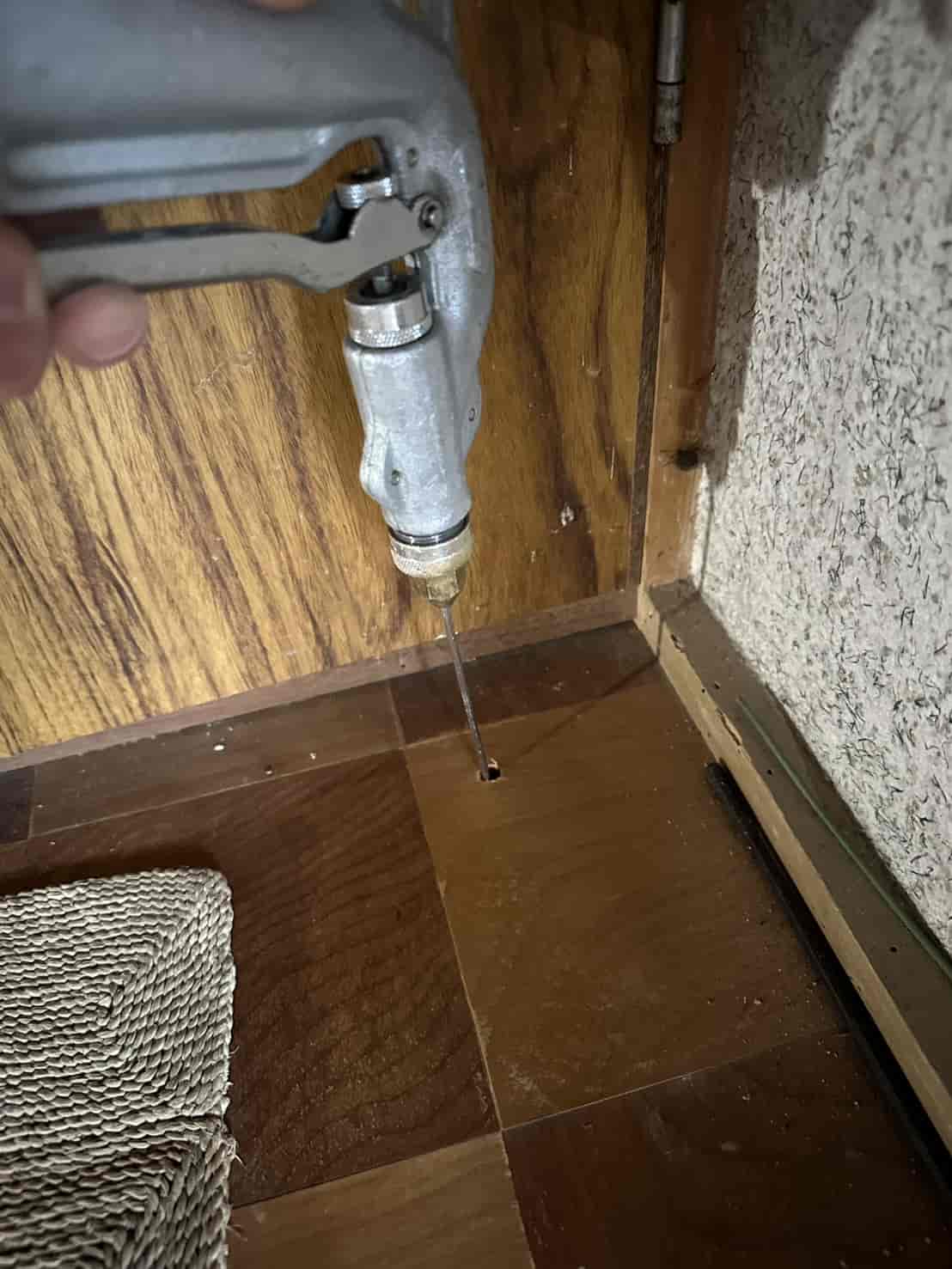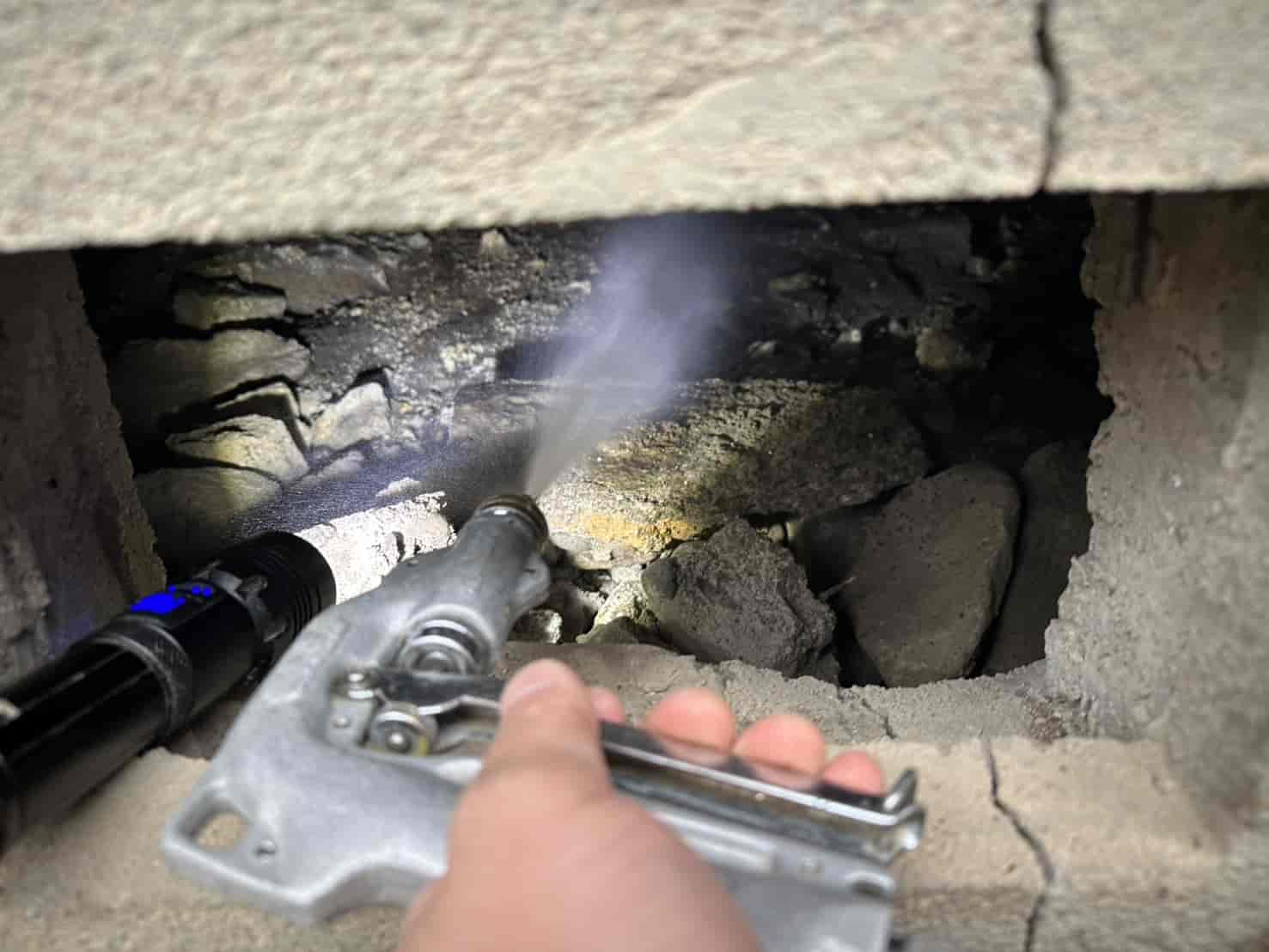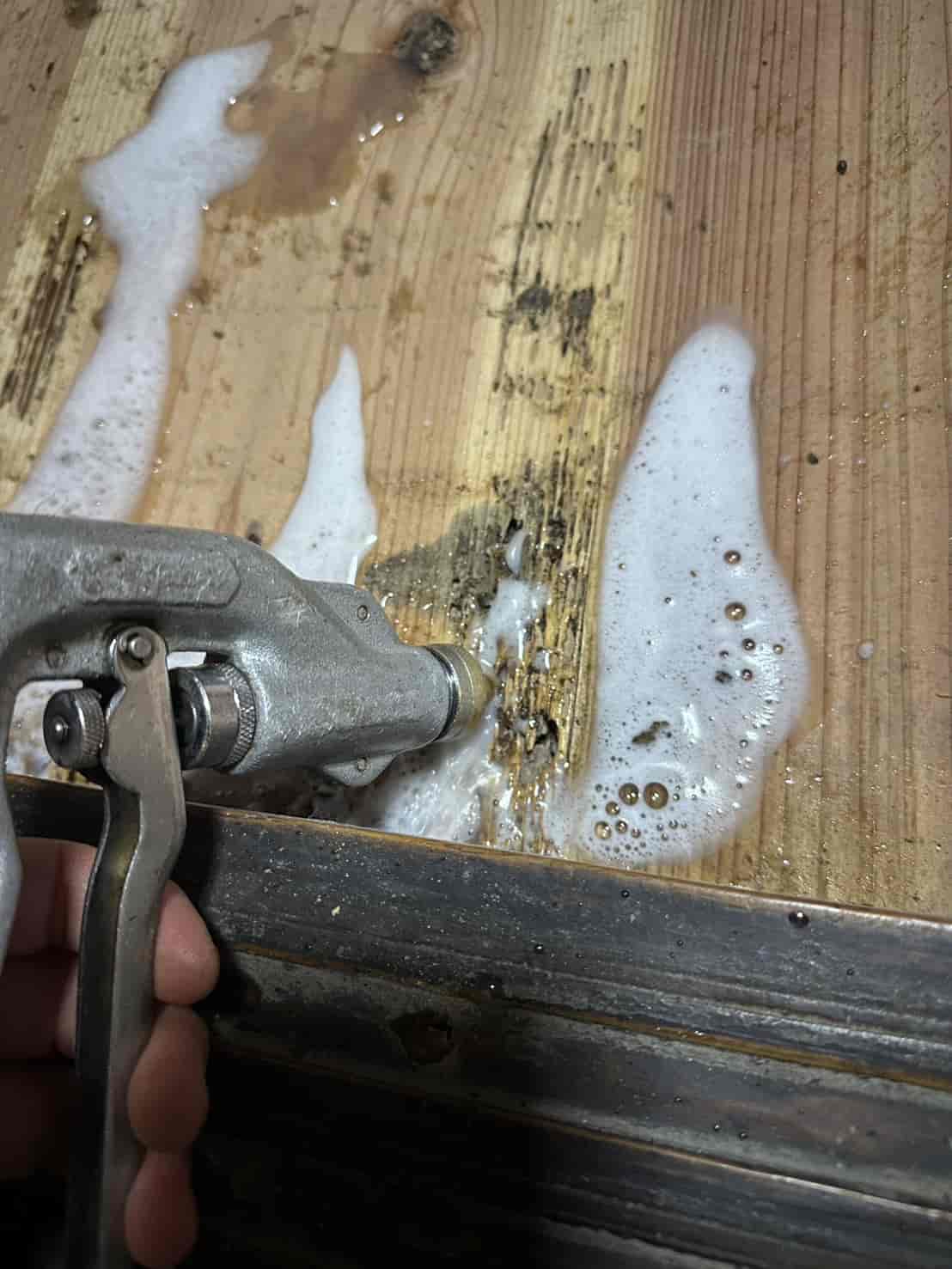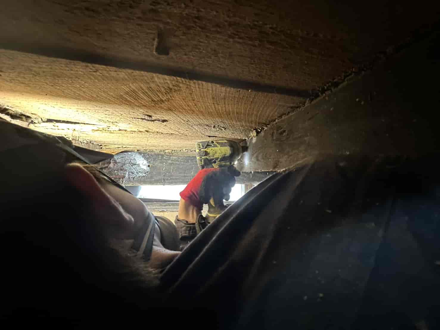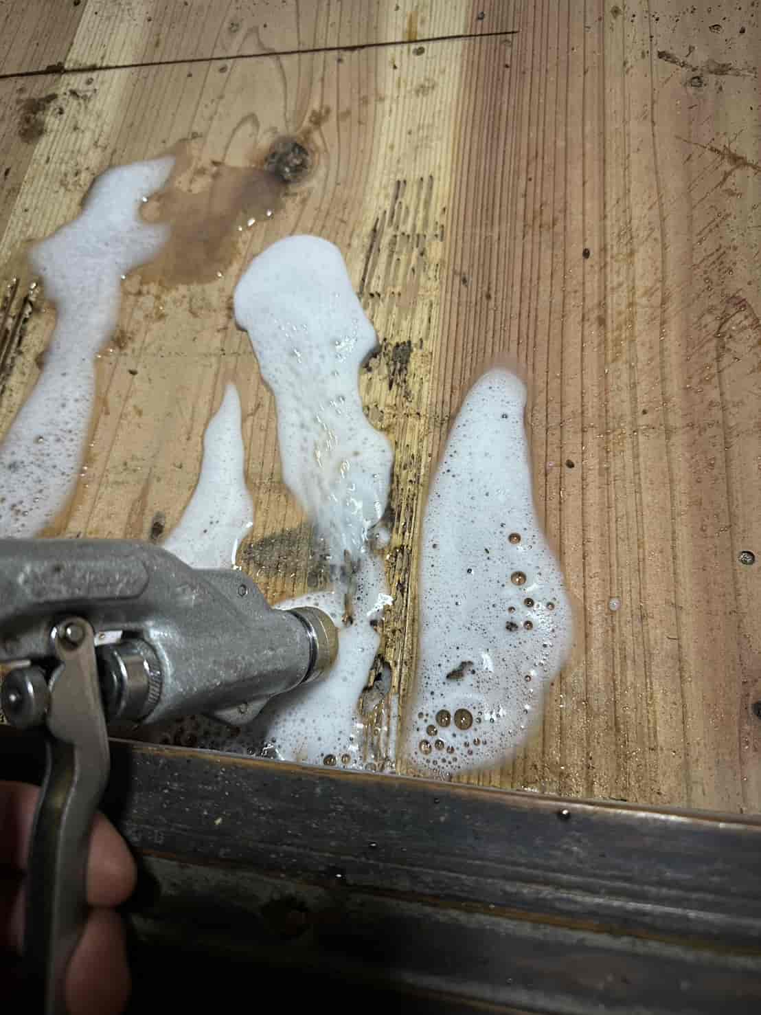 被害が進行している木部に対しては、表面散布だけでは十分ではありません。内部まで薬剤を浸透させる必要があります。専用ドリルで木部へ穿孔し、高濃度薬剤を直接注入。内部に潜伏している白アリや卵に対しても効果を発揮させます。特に土台・大引きなど構造上重要な部分は重点的に処理しました。これは被害が深刻な現場では欠かせない工程です。