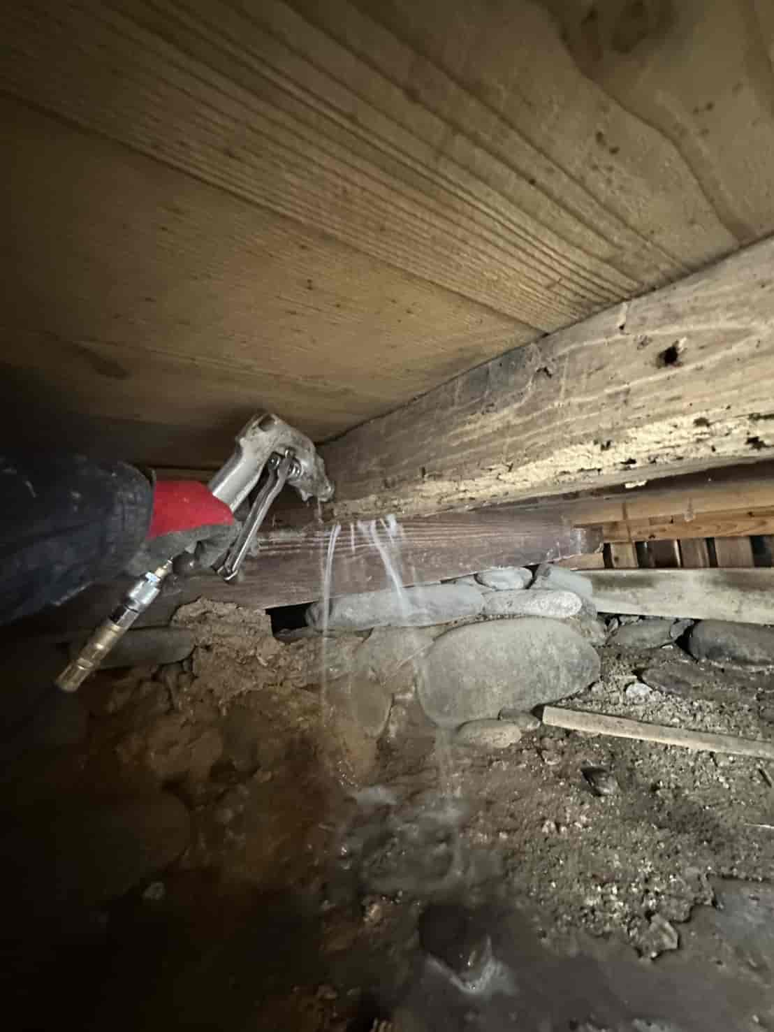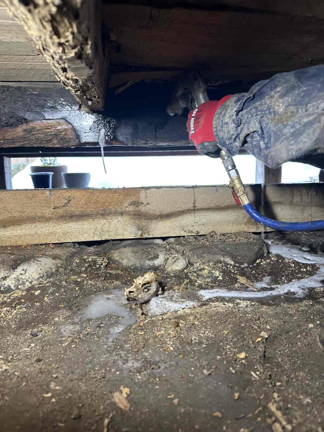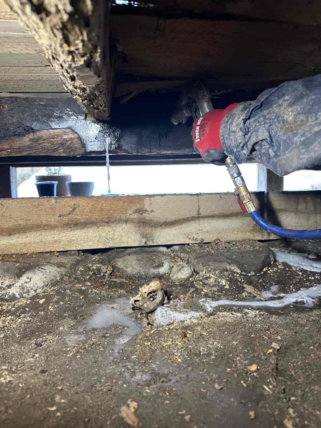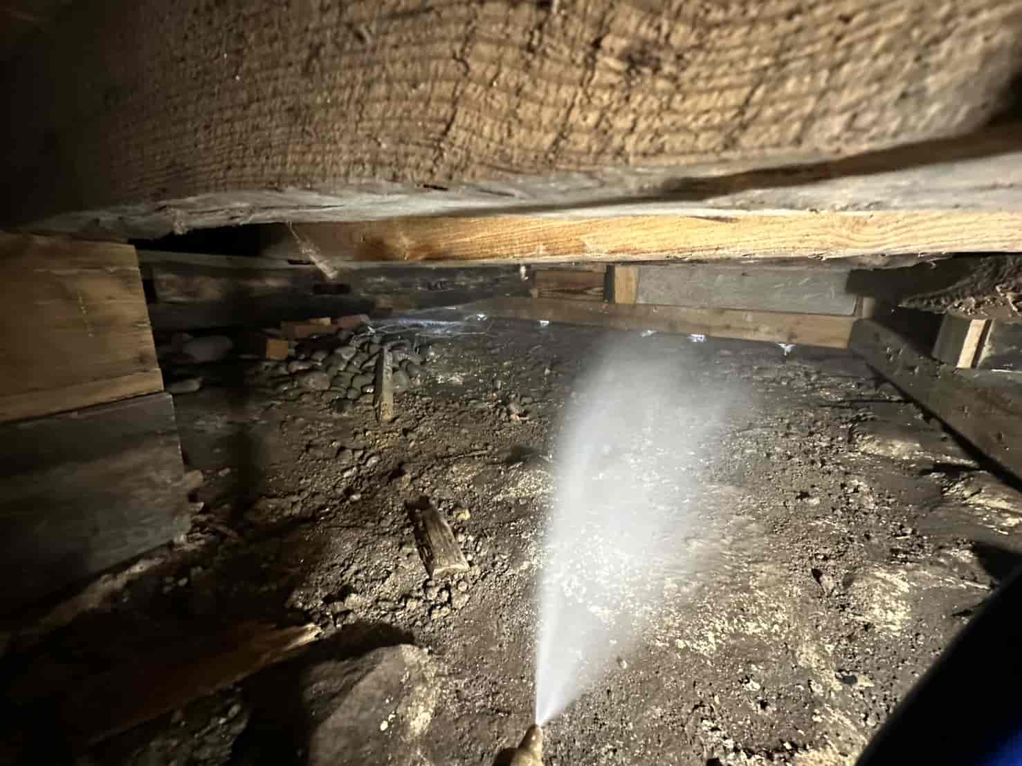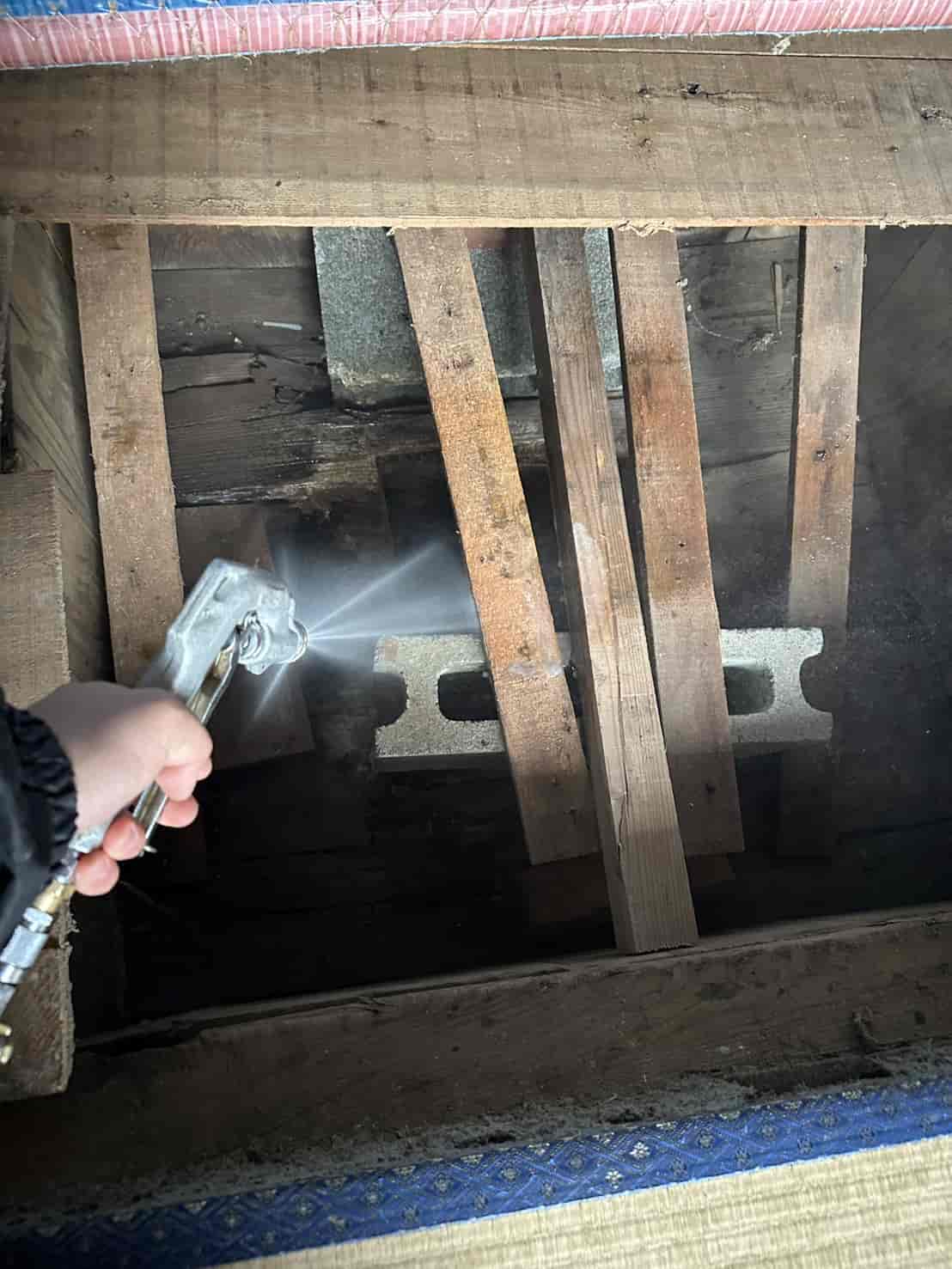 限られたご予算の中でも、最低限必要となる床下全体への散布処理は実施しました。土壌面に防蟻バリアを形成し、外部からの新たな侵入を抑制します。全面フル施工ではありませんが、被害箇所を重点的に押さえつつ、再侵入リスクを下げる処置をバランス良く行いました。