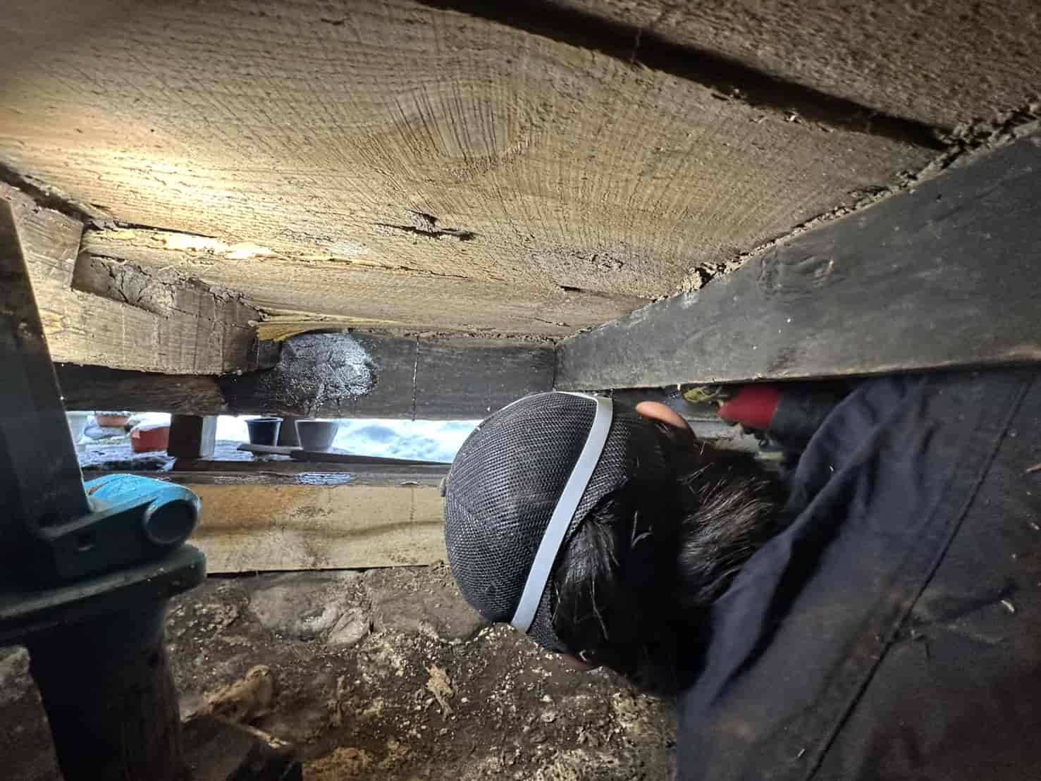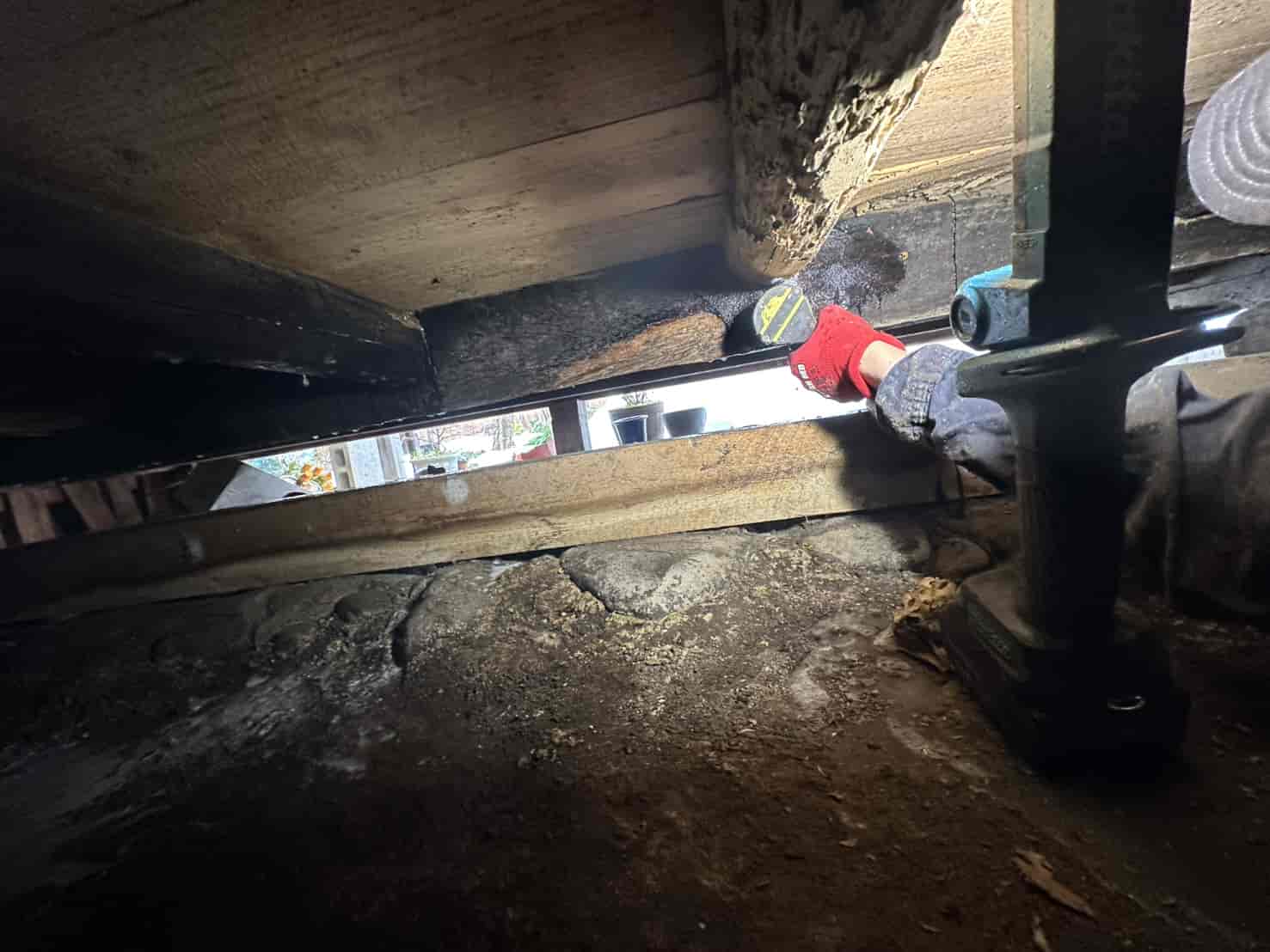 【対応】床下調査の結果、土台や大引きへの食害、蟻道の発生を確認しました。ご予算に配慮しながら被害箇所を優先する形で施工を実施し、木部への穿孔注入処理、畳下や座板の消毒、床下全体への薬剤散布を行いました。限られた条件の中で、被害の進行を抑えつつ再侵入対策まで対応いたしました。