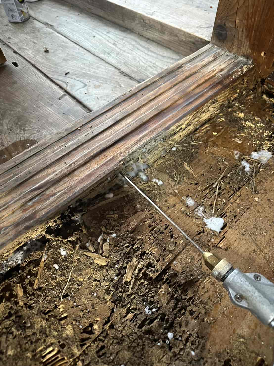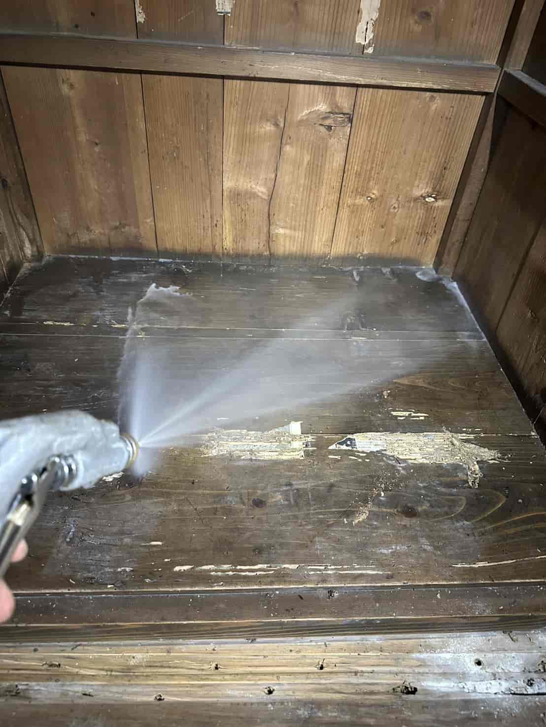 座板部分にも被害兆候があったため、薬剤処理を実施。露出部分はもちろん、内部に潜伏している可能性も考慮し、丁寧に処理しています。室内側の木部処理は、見た目を損なわないよう慎重に施工する技術が求められます。