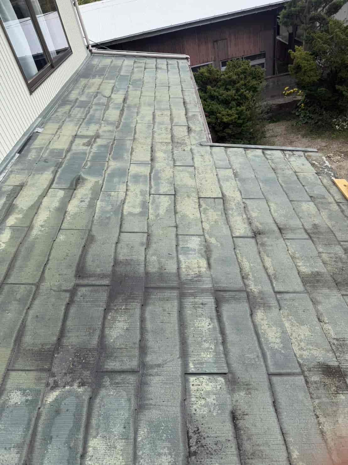 スレートは塗装が命。塗膜が剥がれた状態のまま放置すると、雨水を吸って乾いて…を繰り返し、反り、クラック(割れ)、層間剥離が進み、防水能力が完全に失われていきます。