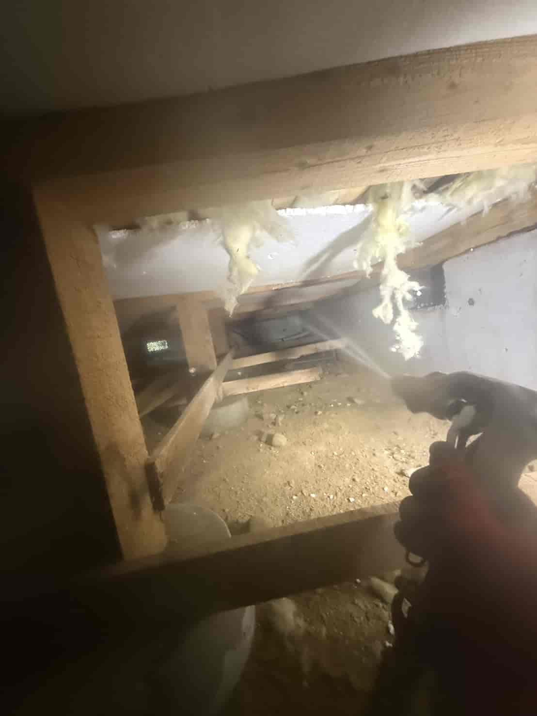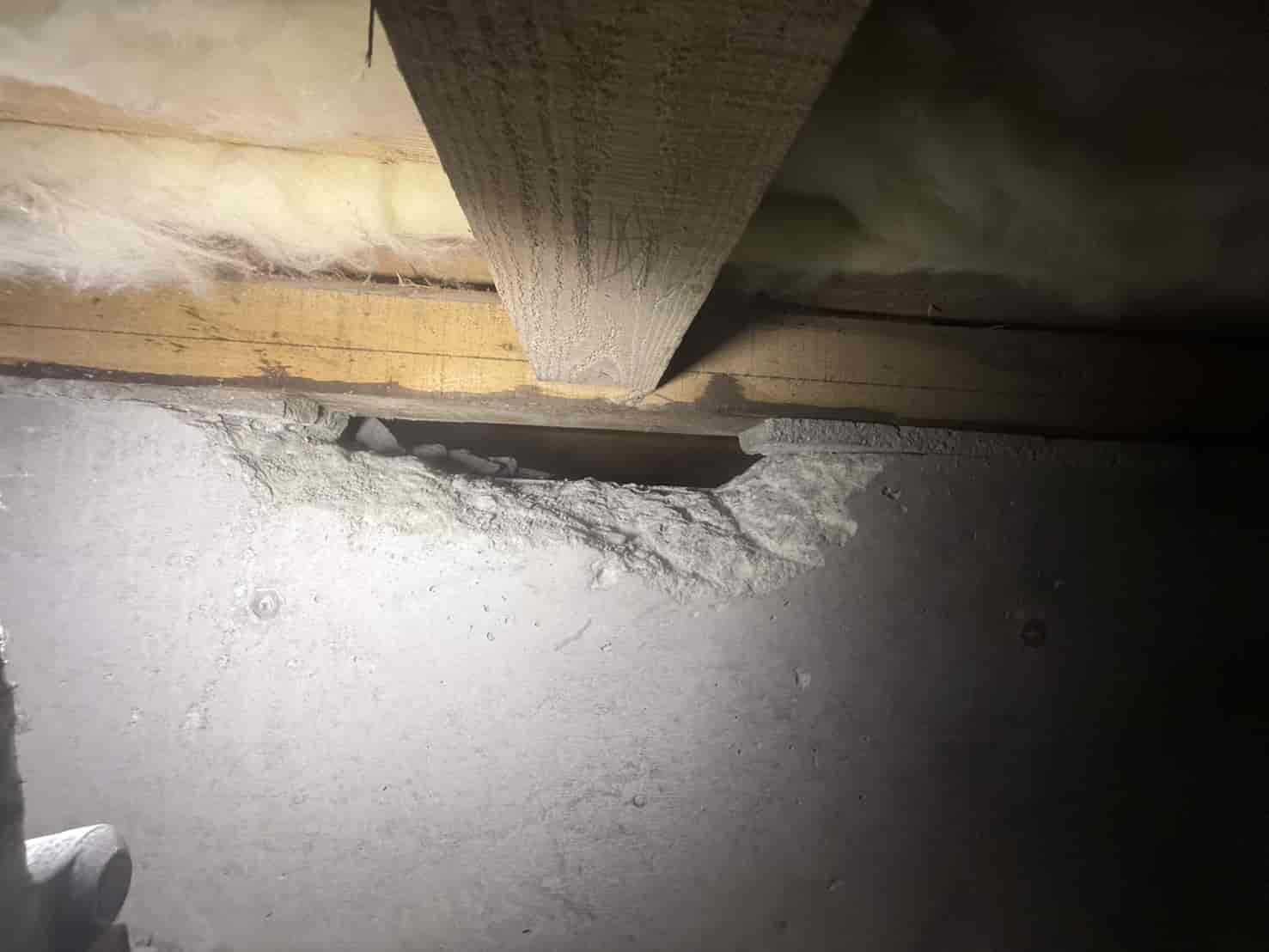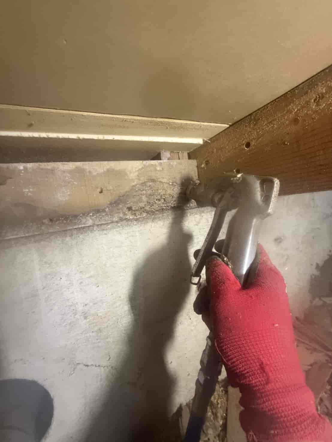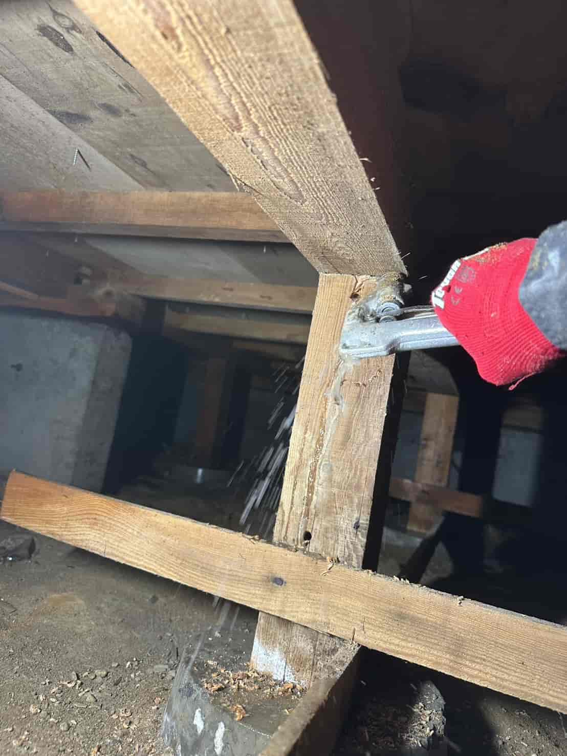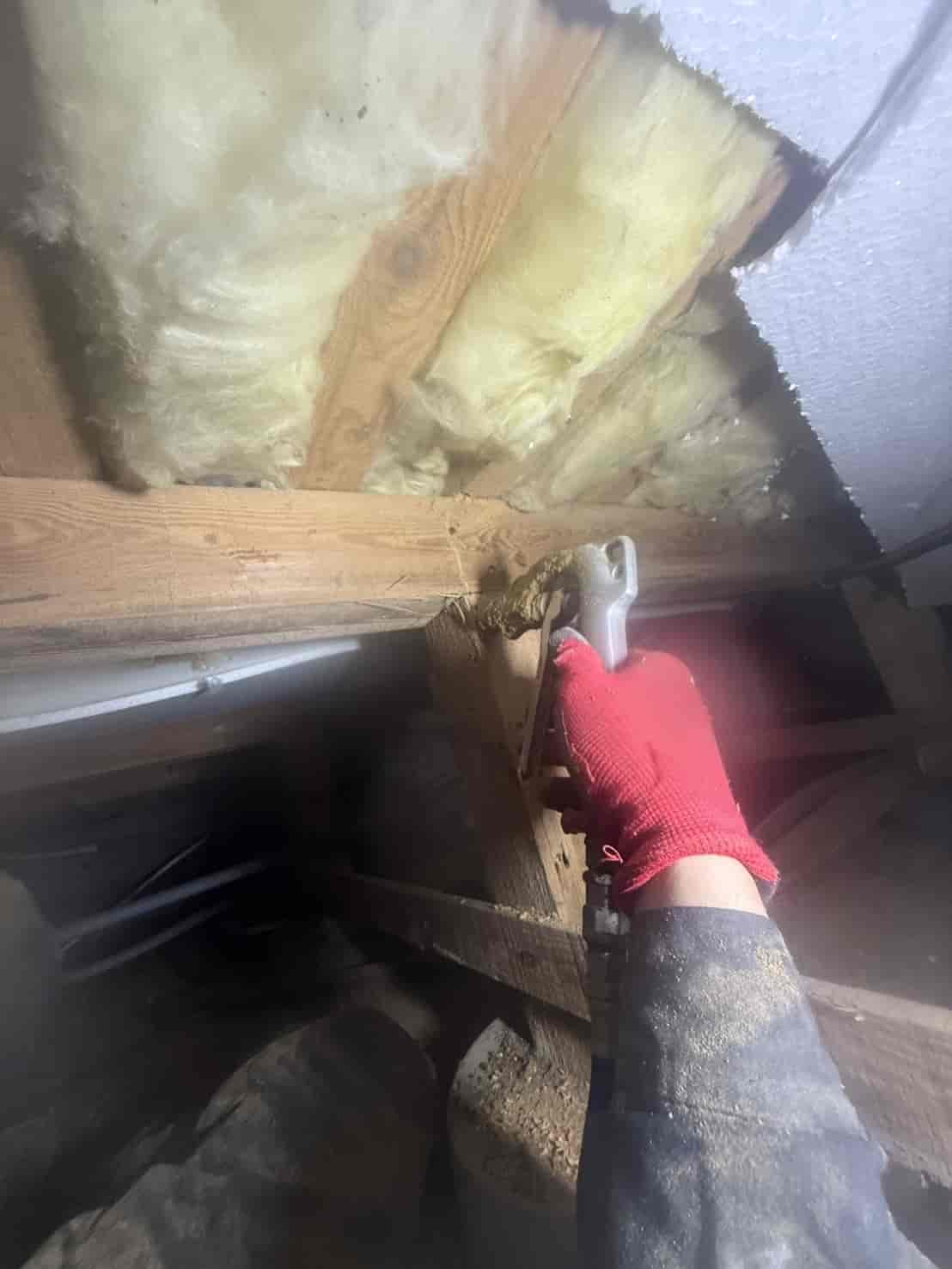【対応】被害箇所の木部に穿孔注入処理を行い、内部まで薬剤を行き渡らせて確実に駆除しました。床下の断熱材を一部カットし、見えない部分まで徹底的に処理を実施しました。駆除後は再発防止のための予防消毒も行い、長期的に安心できる環境を整えました。