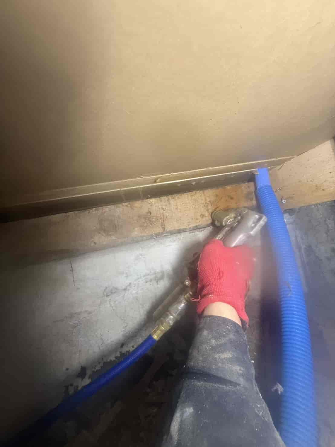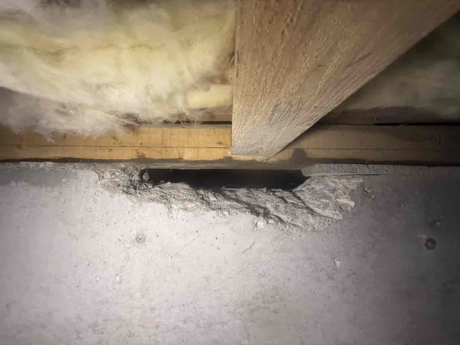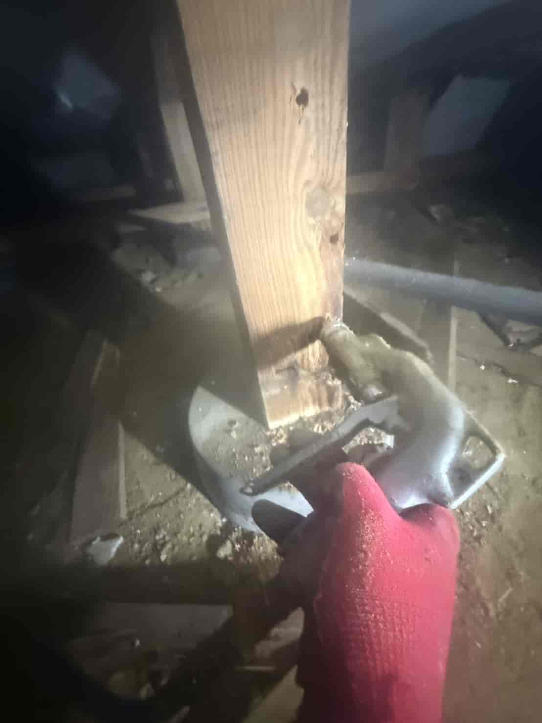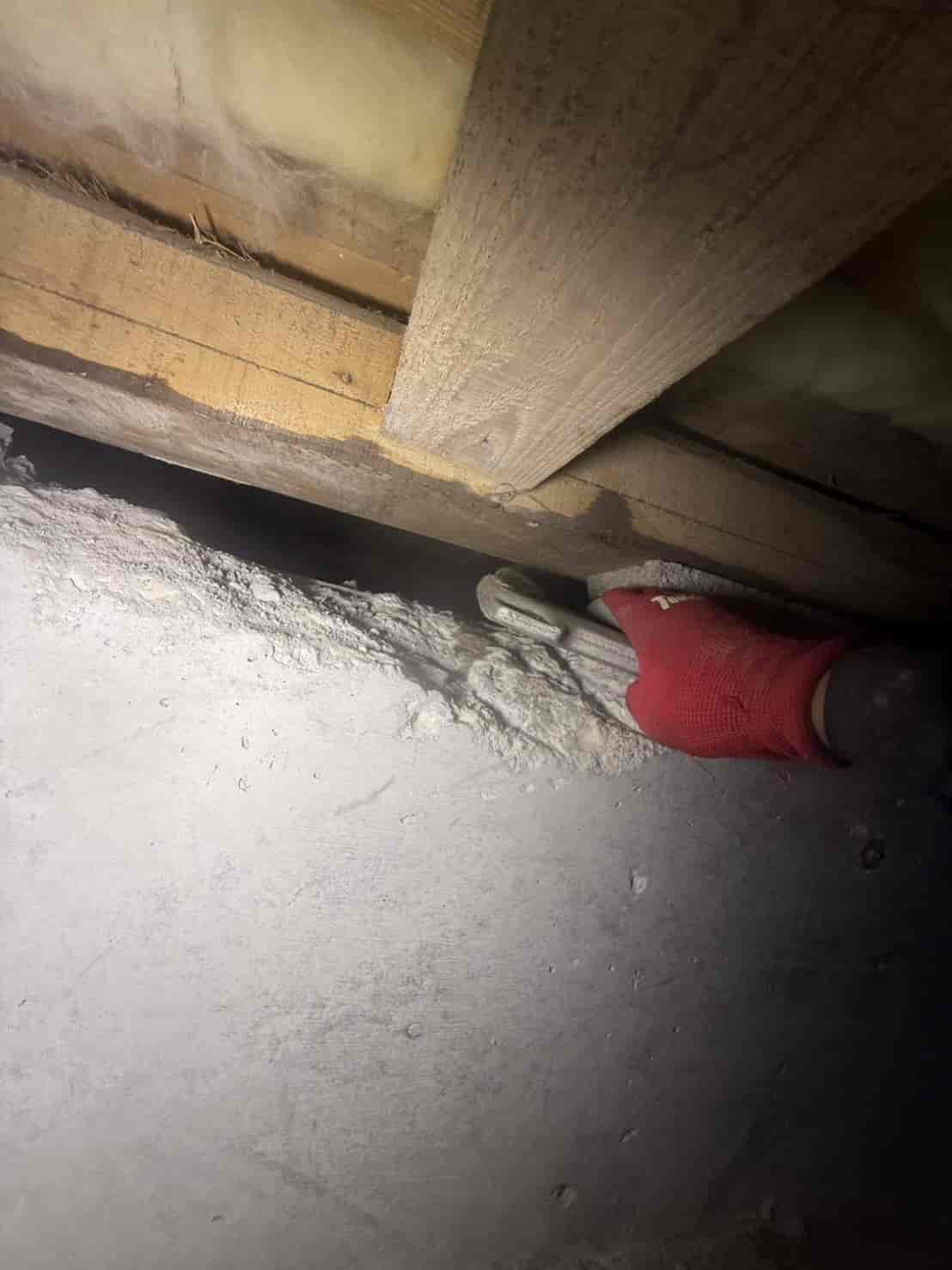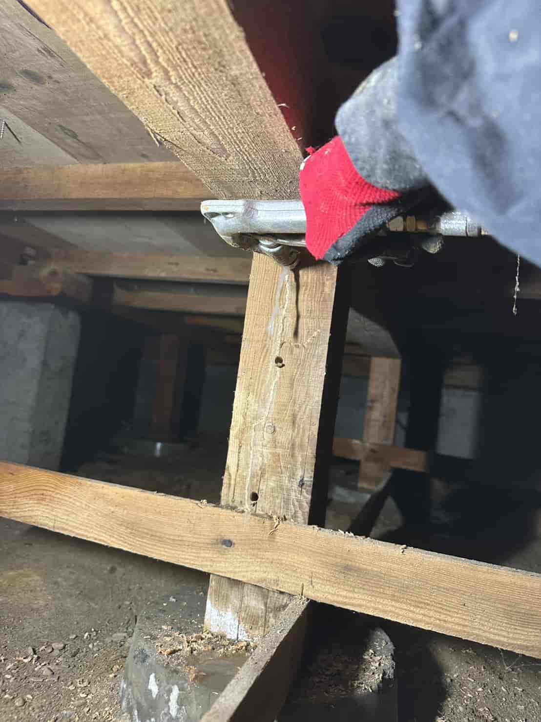 【対応】被害箇所の木部に穿孔注入処理を行い、内部まで薬剤を行き渡らせて確実に駆除しました。床下の断熱材を一部カットし、見えない部分まで徹底的に処理を実施しました。駆除後は再発防止のための予防消毒も行い、長期的に安心できる環境を整えました。