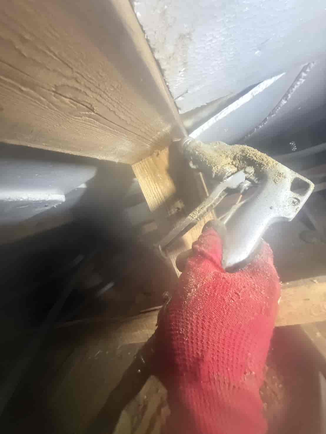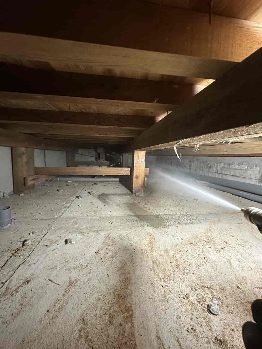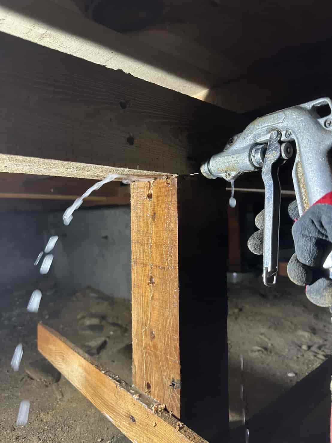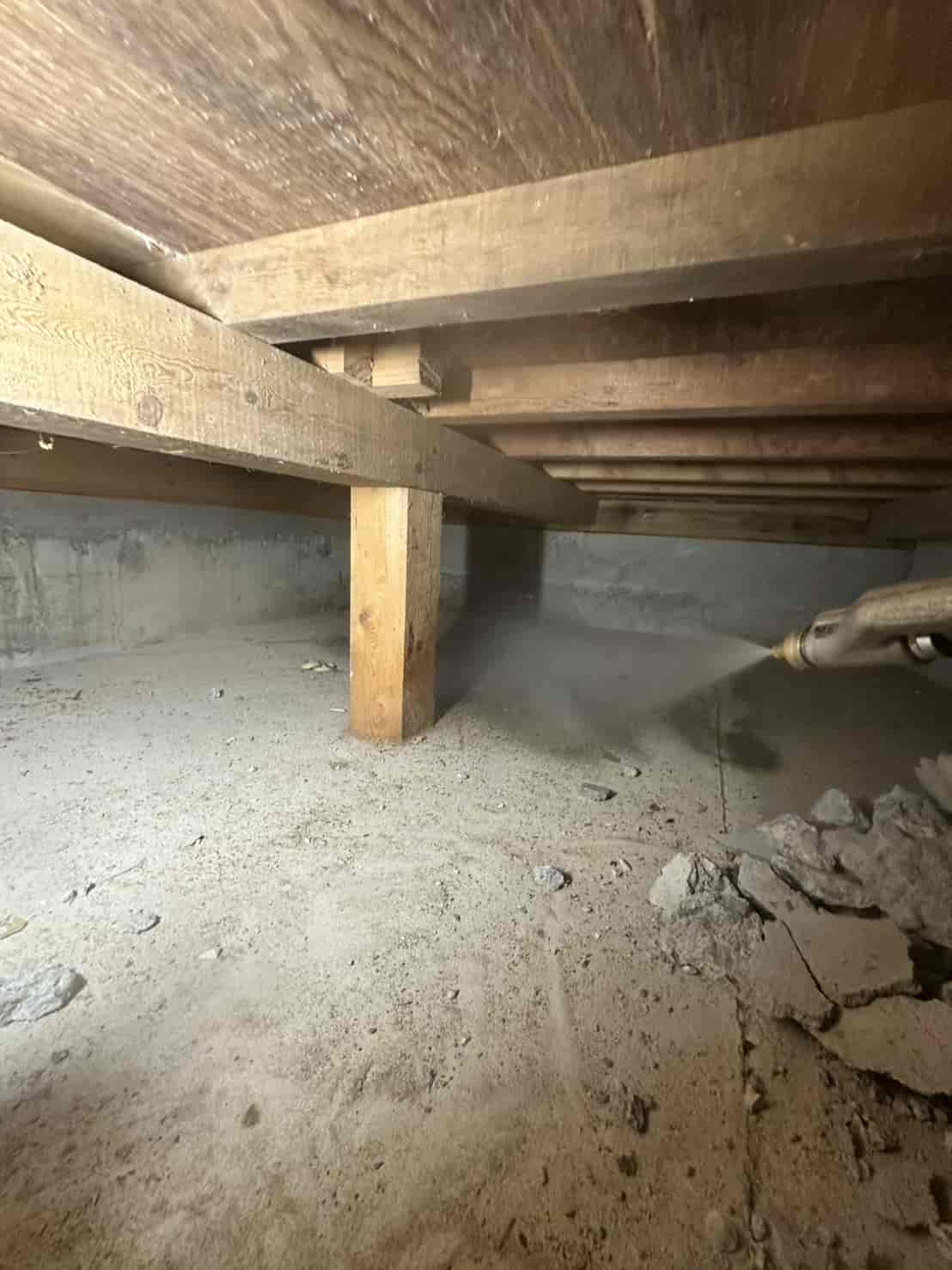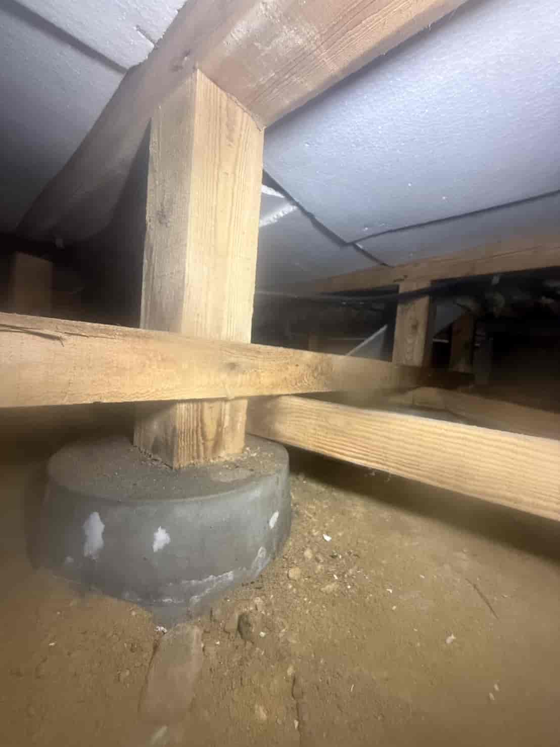【対応】被害箇所の木部に穿孔注入処理を行い、内部まで薬剤を行き渡らせて確実に駆除しました。床下の断熱材を一部カットし、見えない部分まで徹底的に処理を実施しました。駆除後は再発防止のための予防消毒も行い、長期的に安心できる環境を整えました。