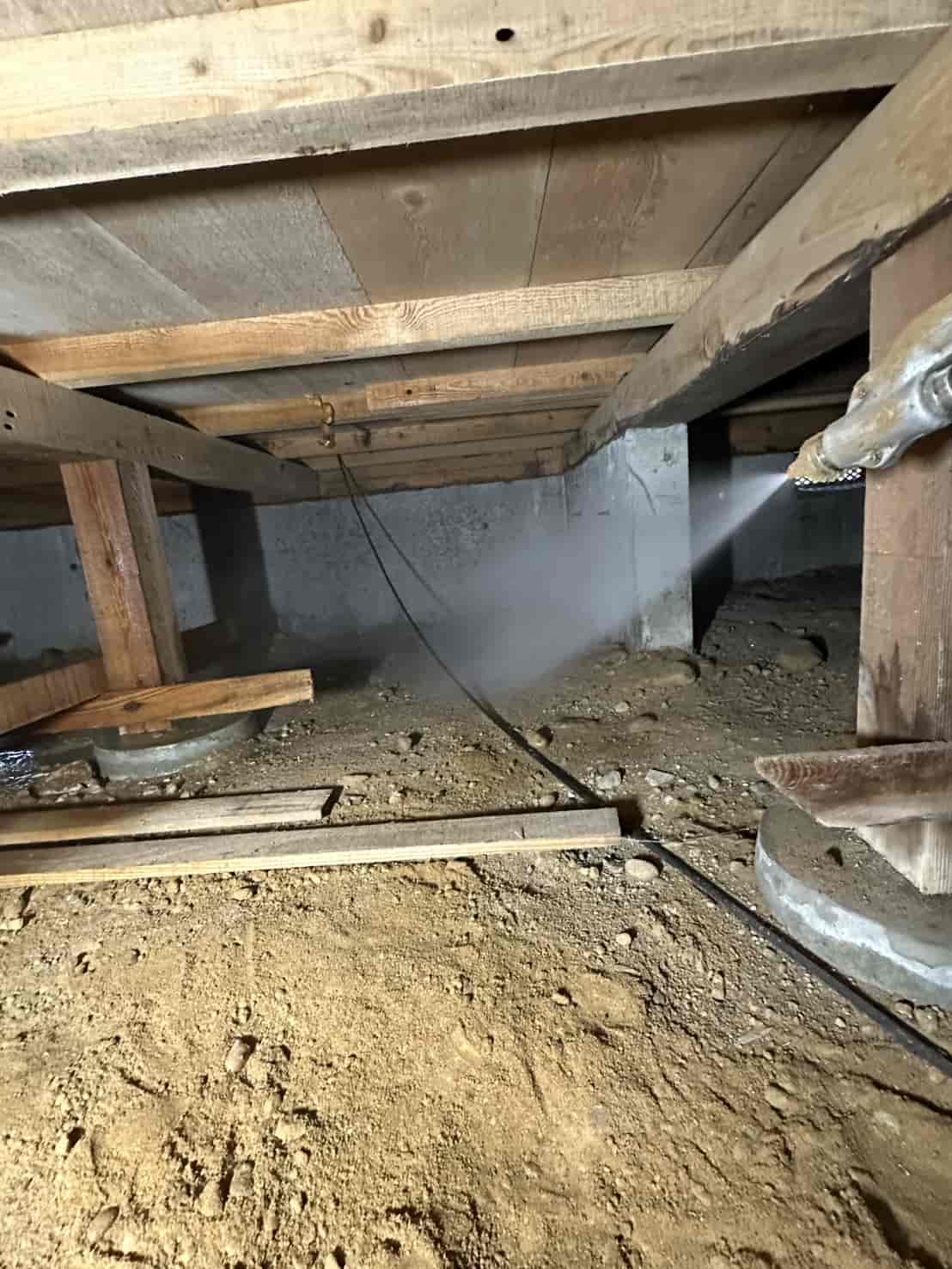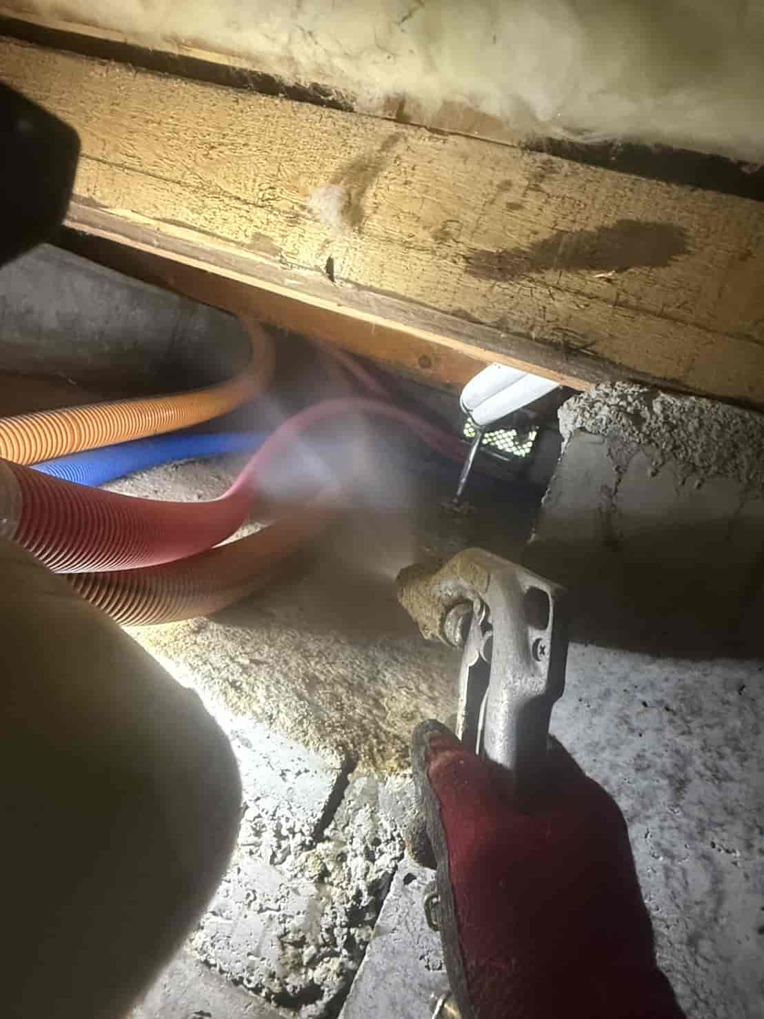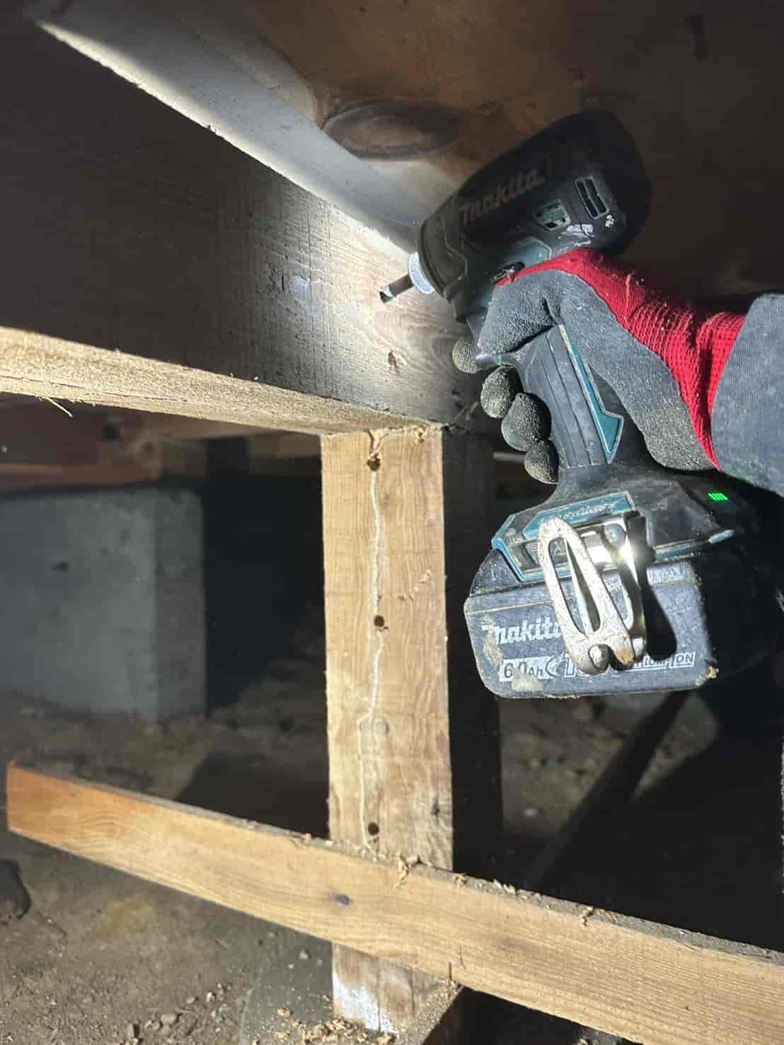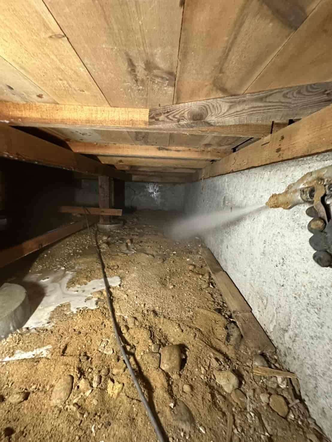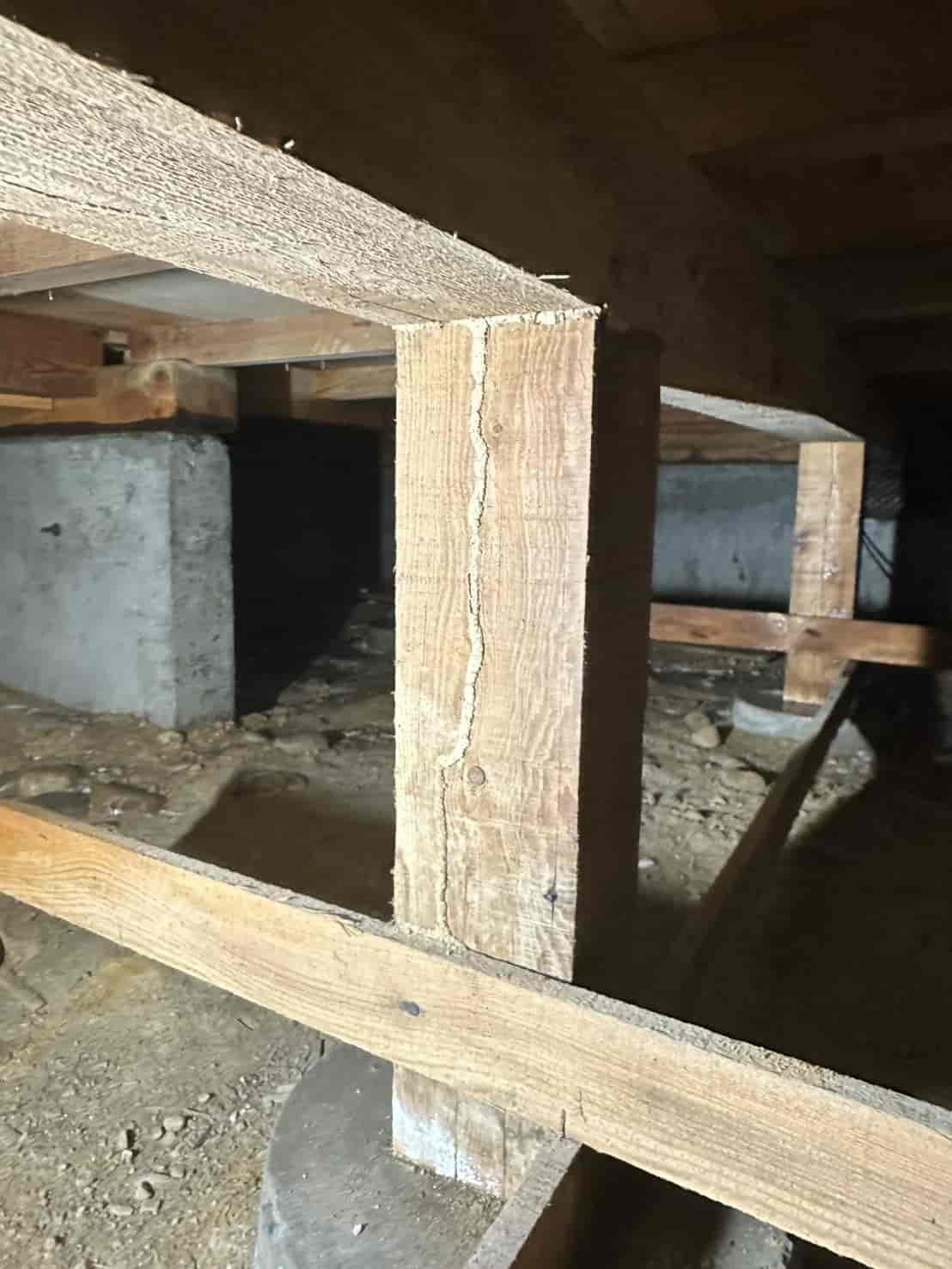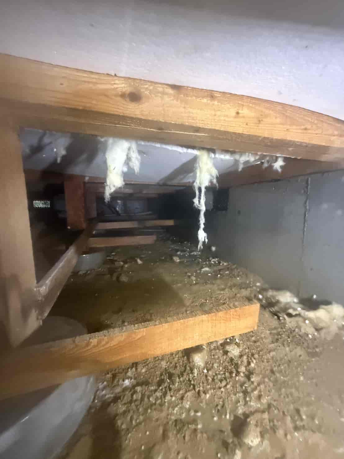 【対応】被害箇所の木部に穿孔注入処理を行い、内部まで薬剤を行き渡らせて確実に駆除しました。床下の断熱材を一部カットし、見えない部分まで徹底的に処理を実施しました。駆除後は再発防止のための予防消毒も行い、長期的に安心できる環境を整えました。