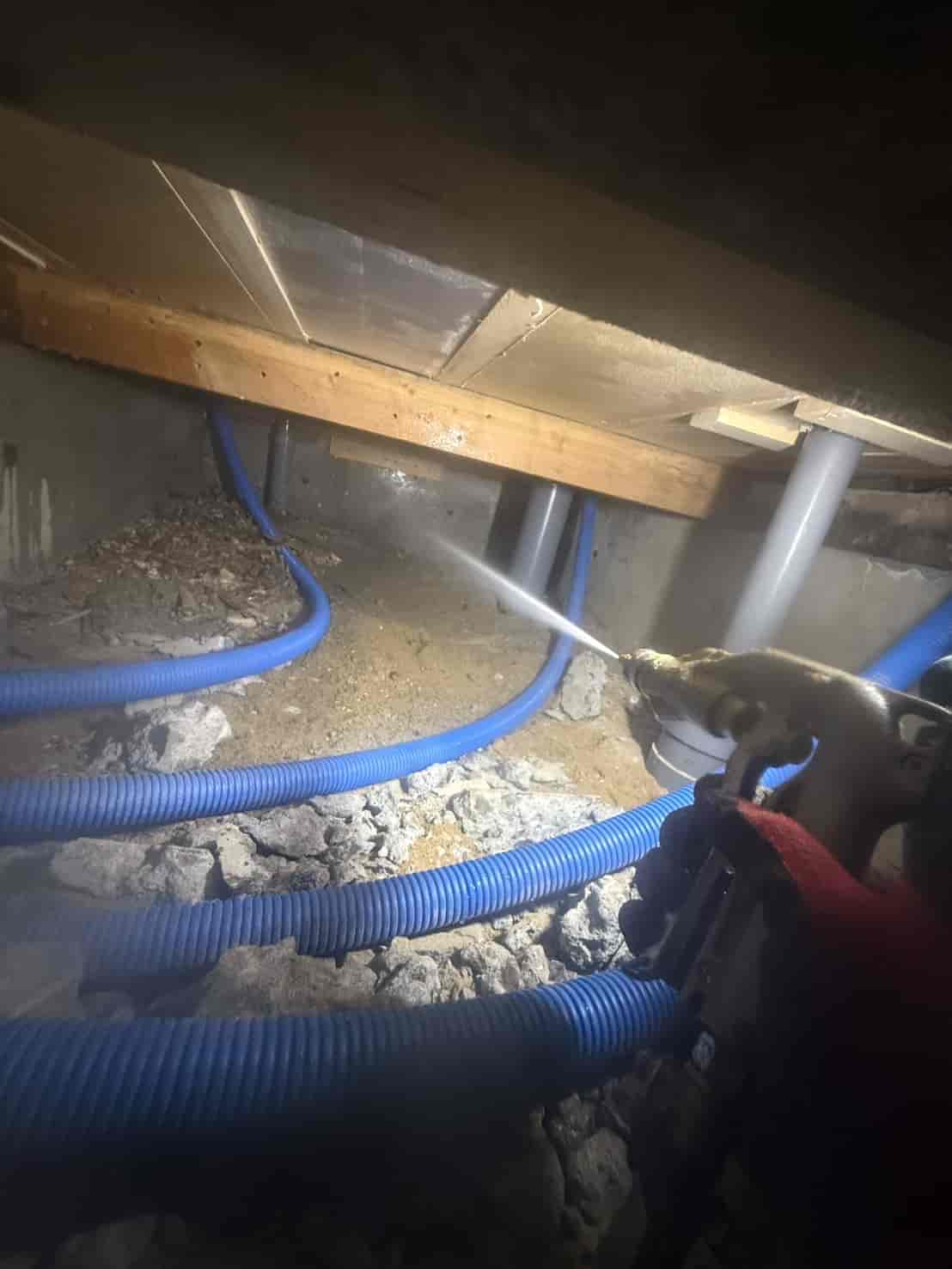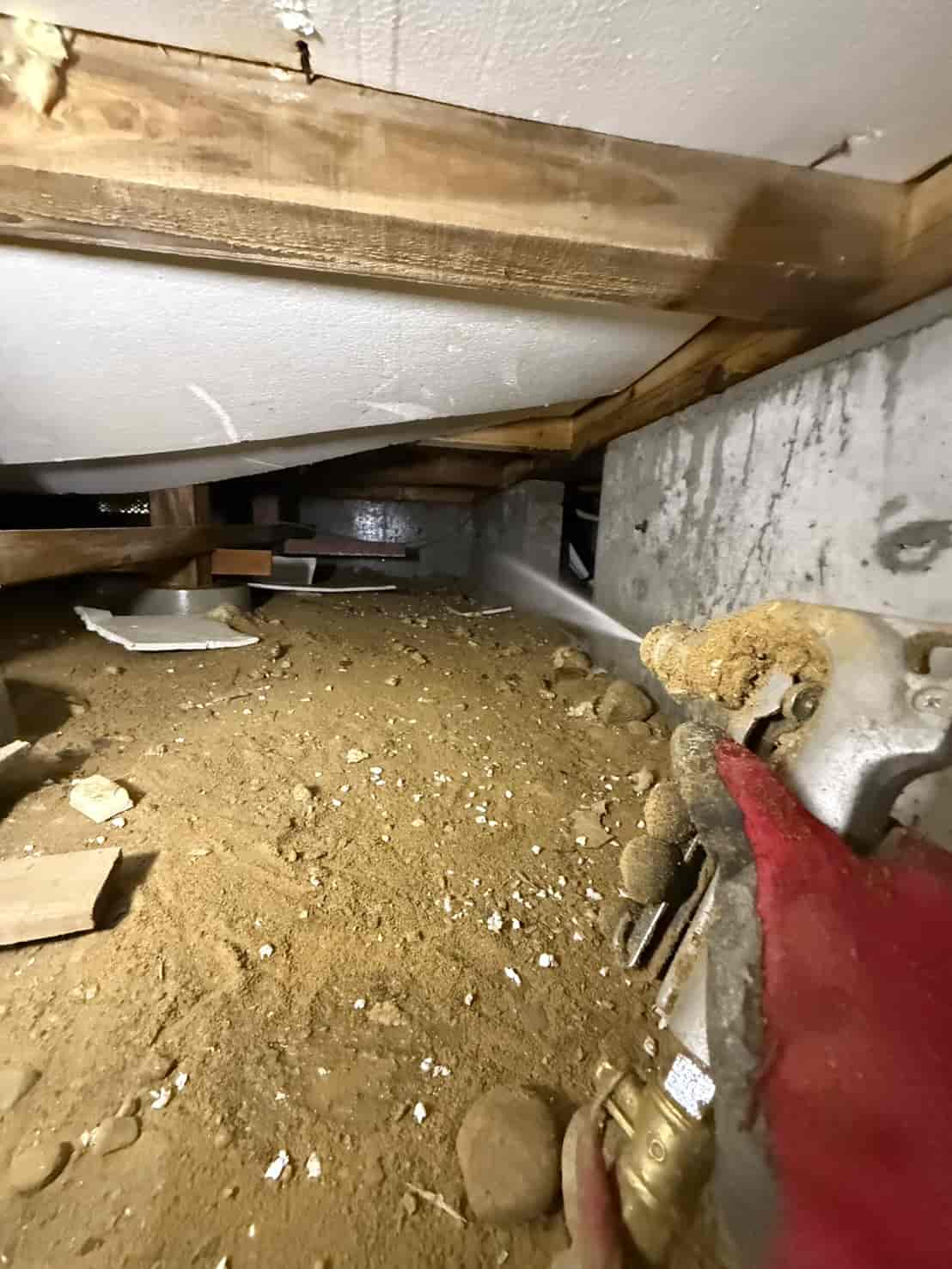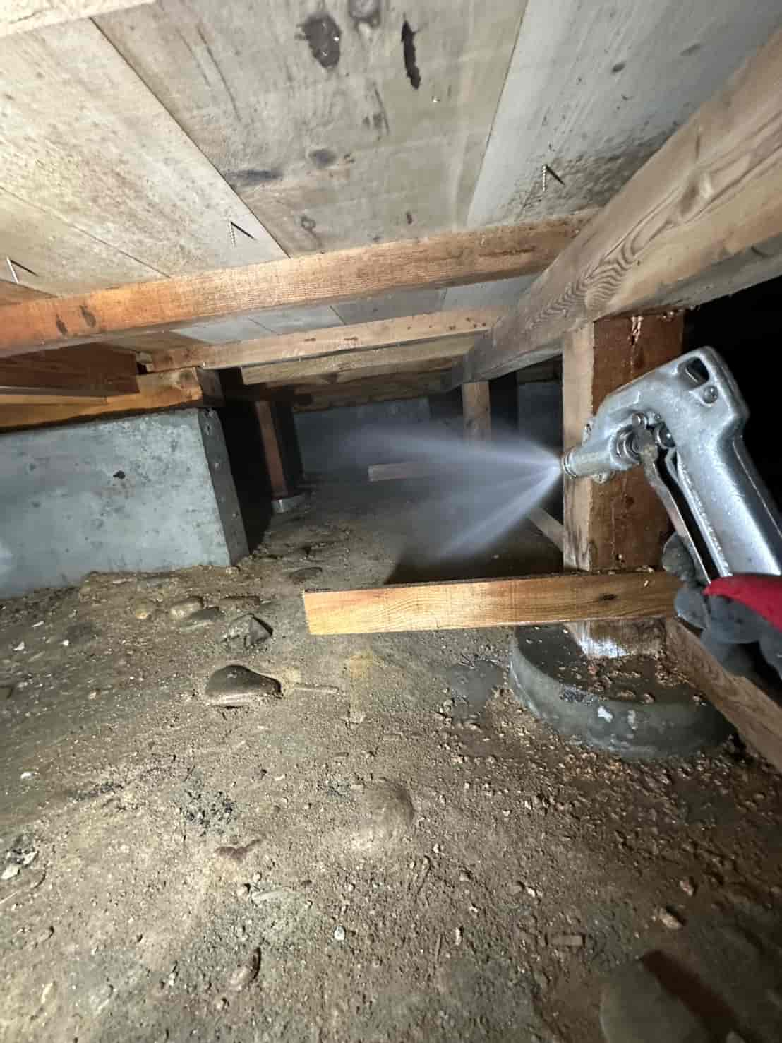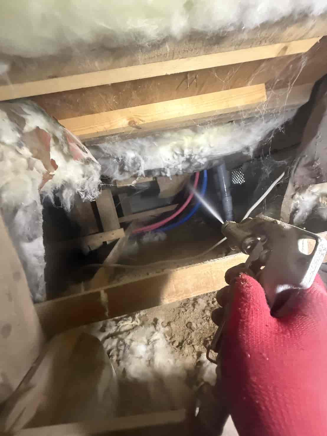 床下に断熱材があったため、一部をカットして内部を露出させ、しっかりと処理を行いました。断熱材の裏側は湿気がこもりやすく、シロアリが発生しやすい環境です。そのため、見える範囲だけでなく、隠れている部分まで対応することが重要です。