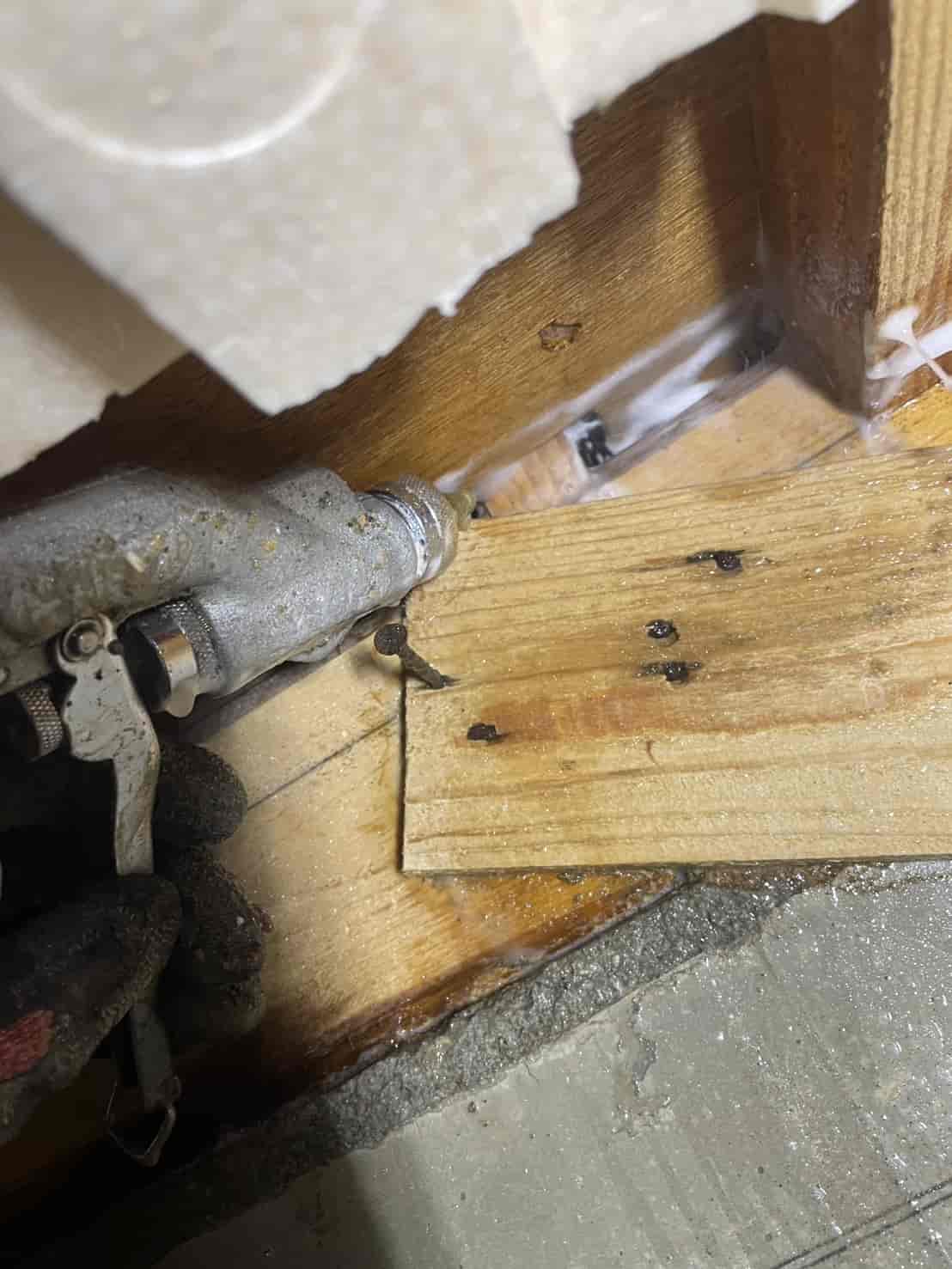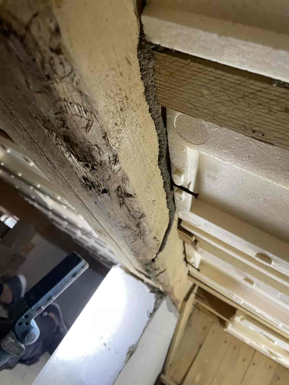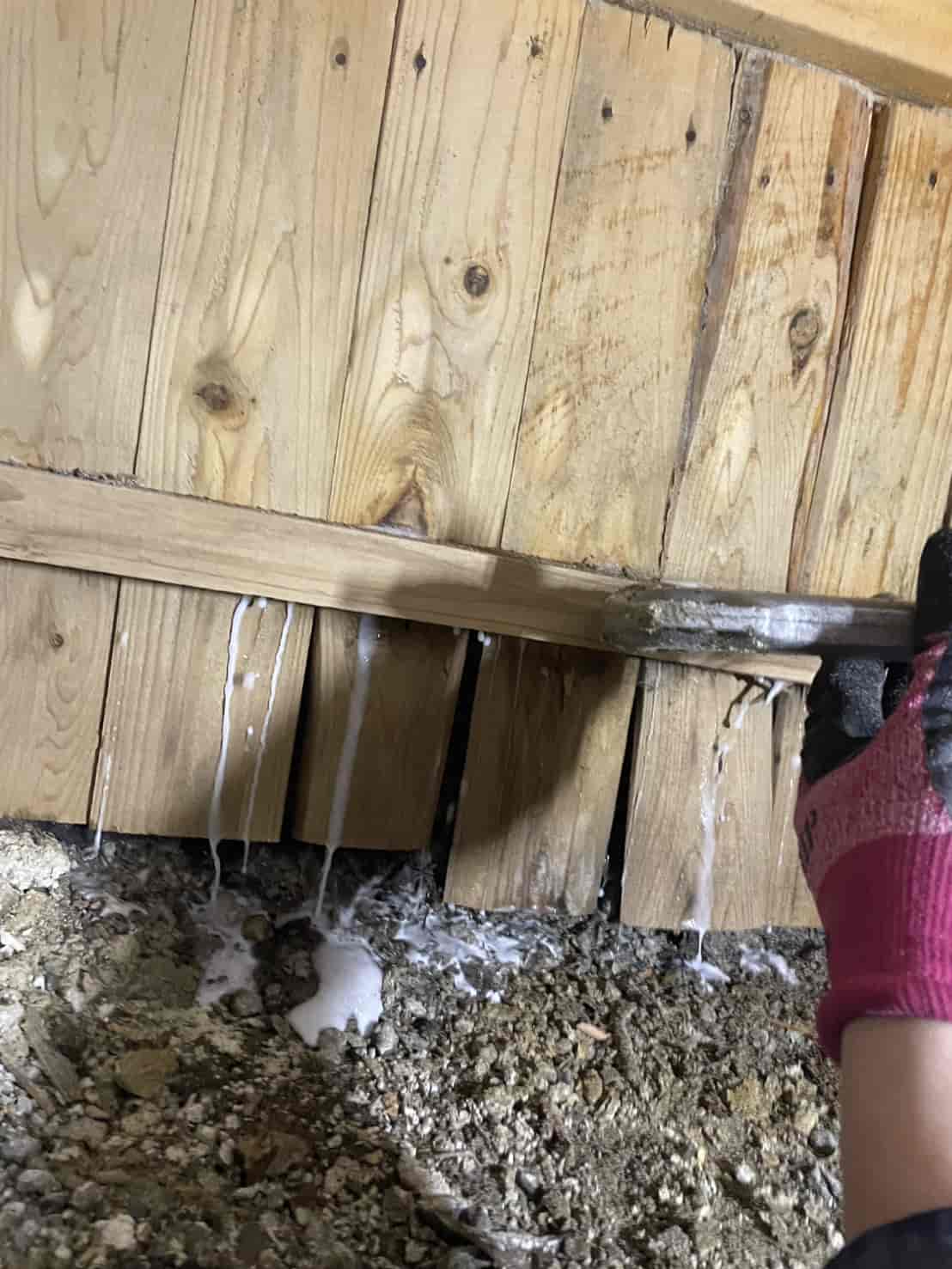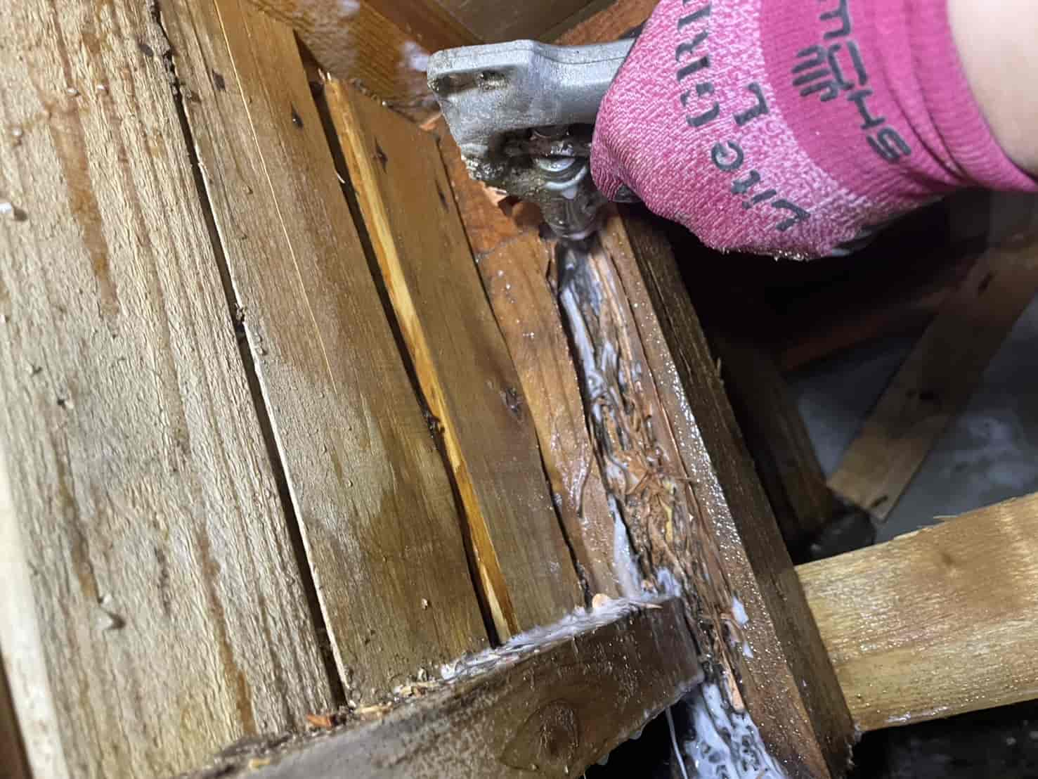 床下全面散布はもちろん、食害部、玄関、浴室に穿孔注入による直接消毒を行いました。また、床下断熱材の裏側にも蟻道を発見したので、断熱材を一部撤去し直接消毒を行いました。