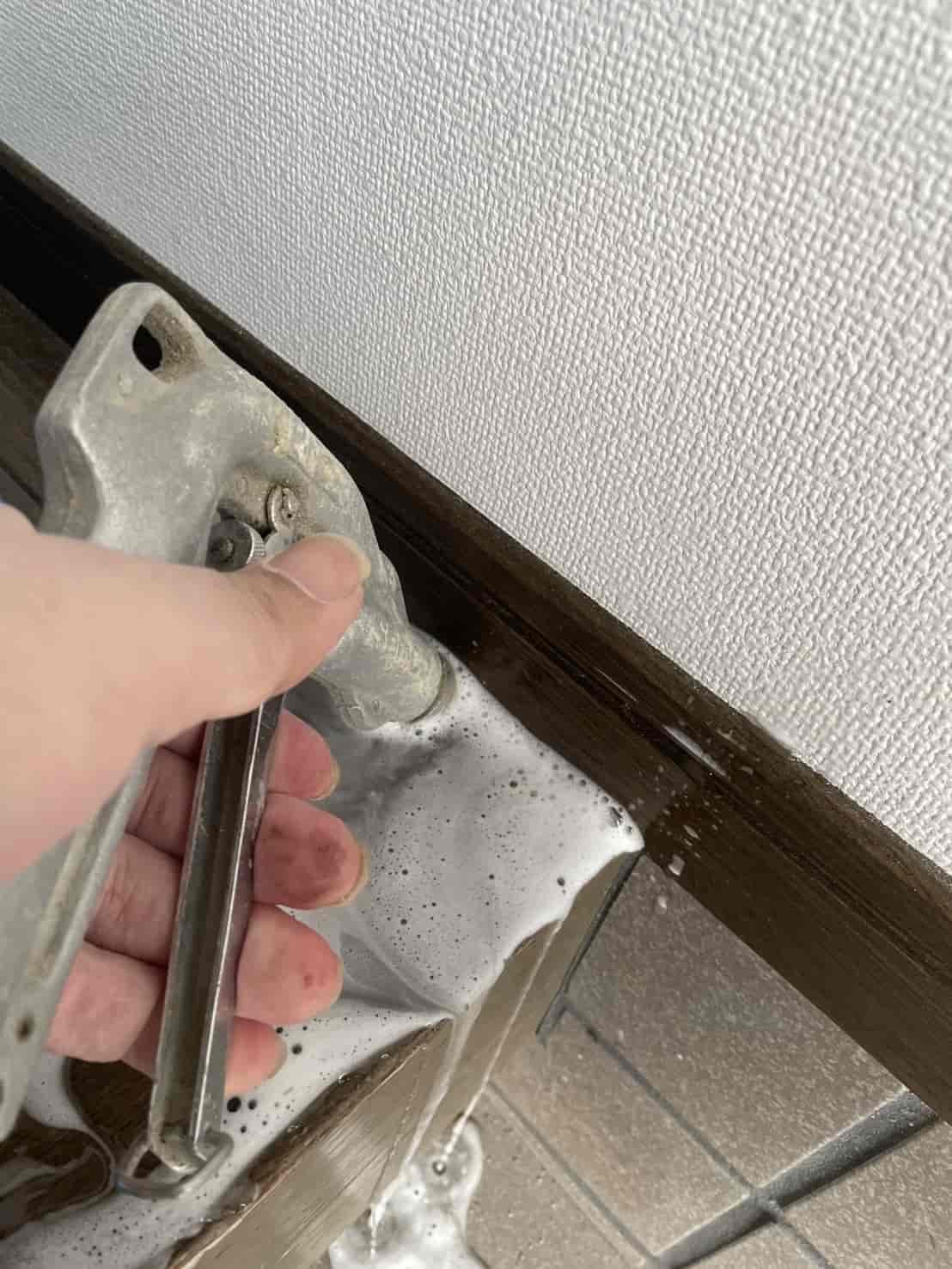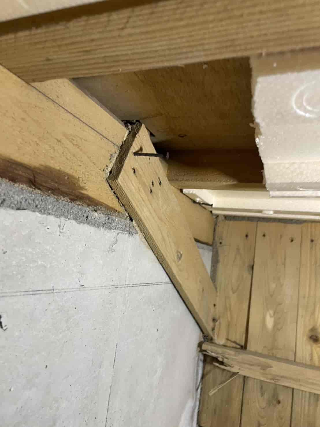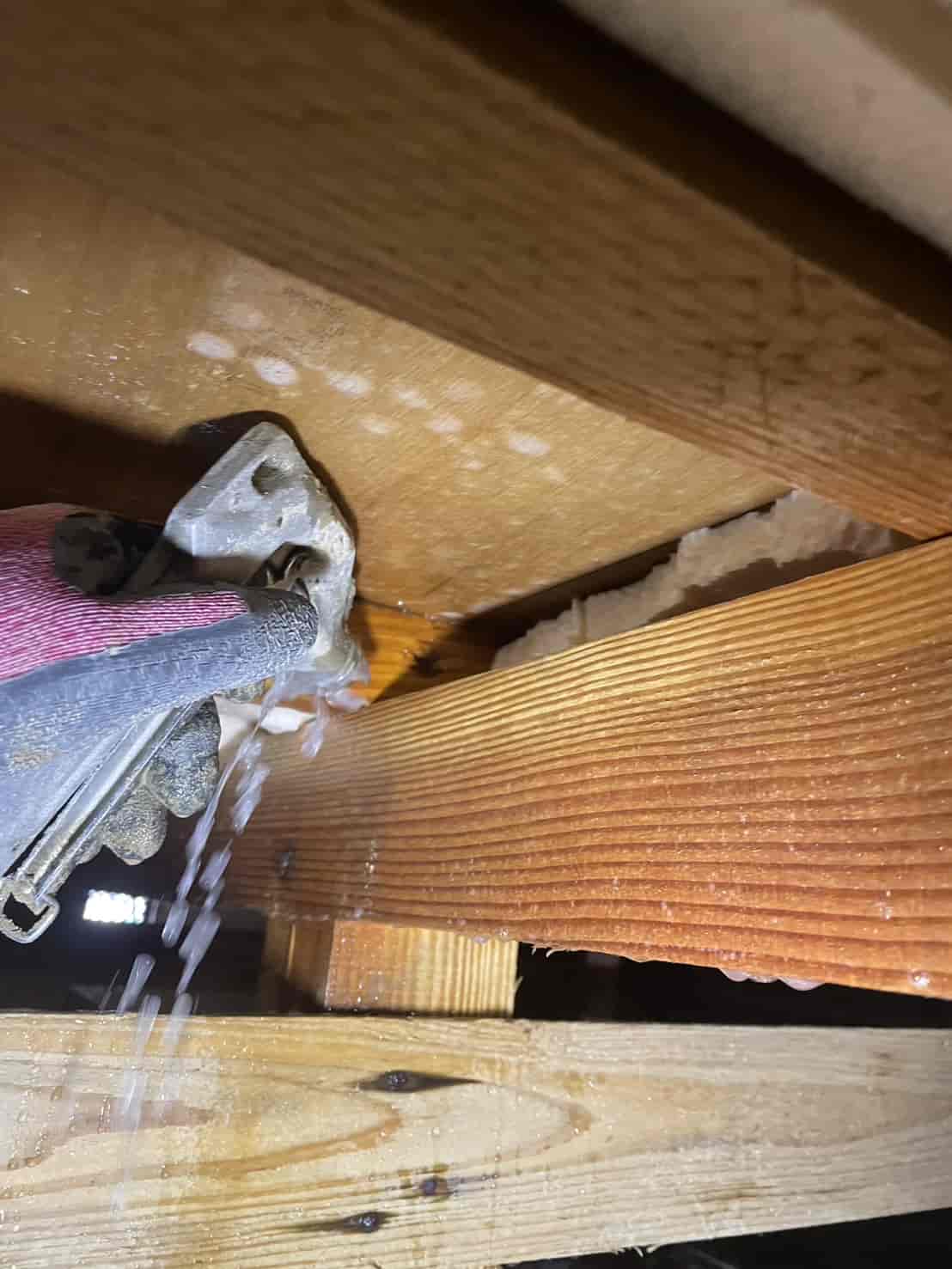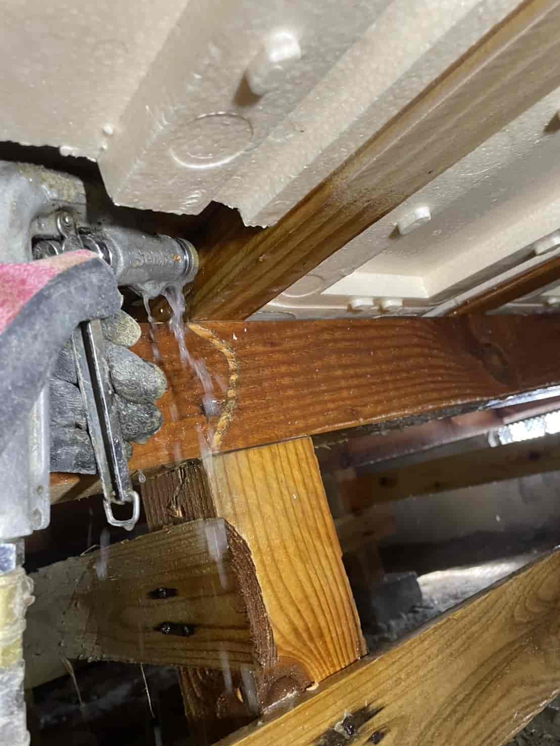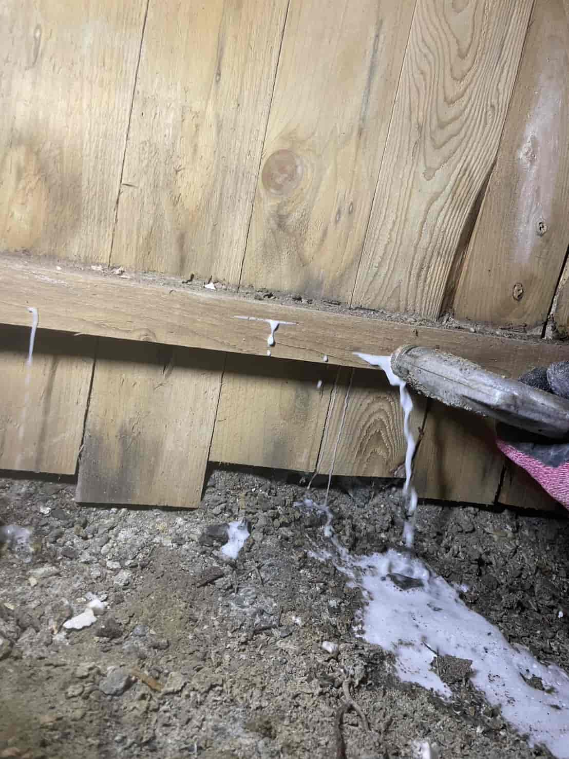 床下全面散布はもちろん、食害部、玄関、浴室に穿孔注入による直接消毒を行いました。また、床下断熱材の裏側にも蟻道を発見したので、断熱材を一部撤去し直接消毒を行いました。