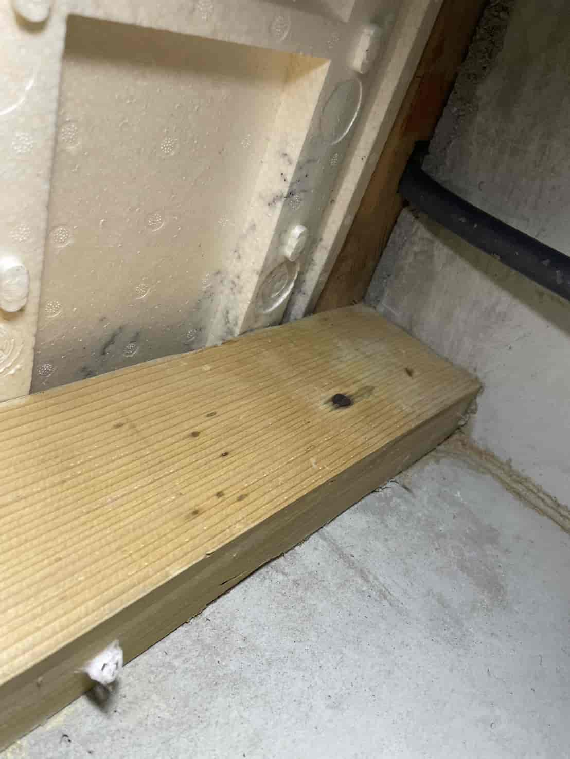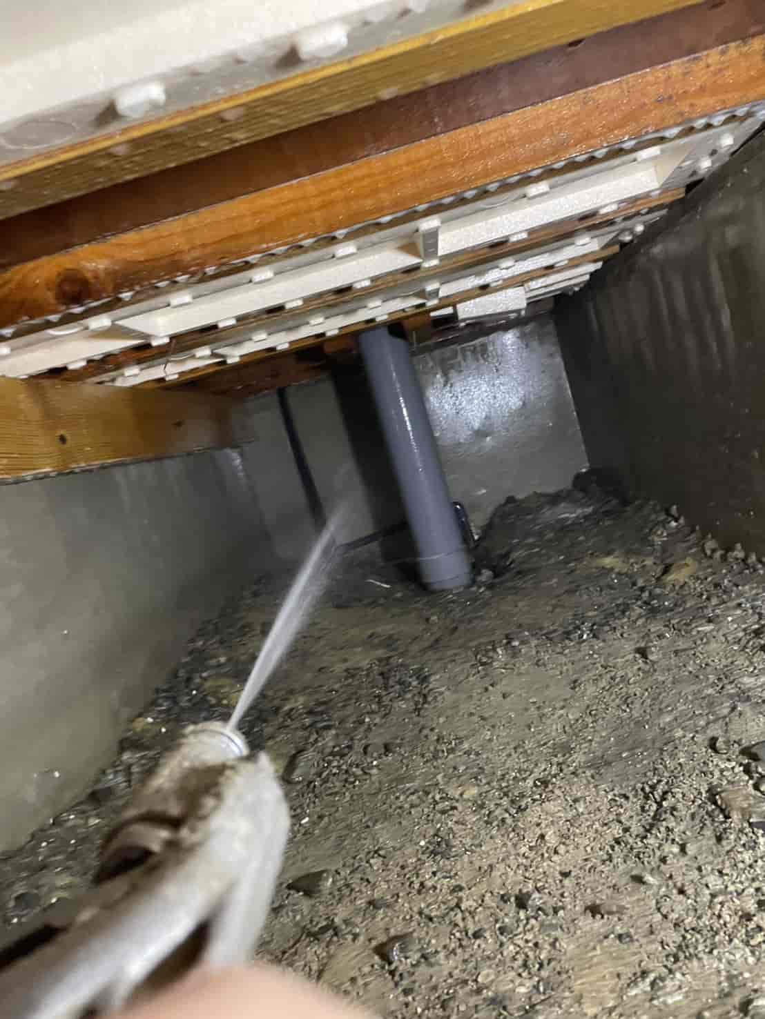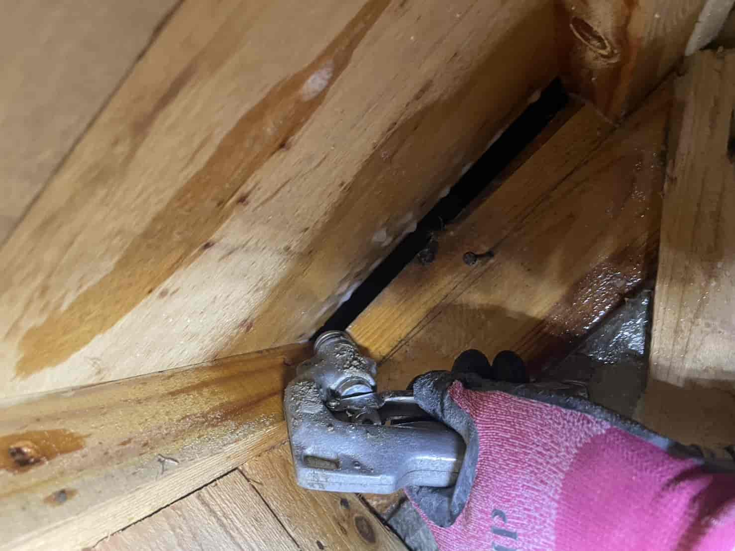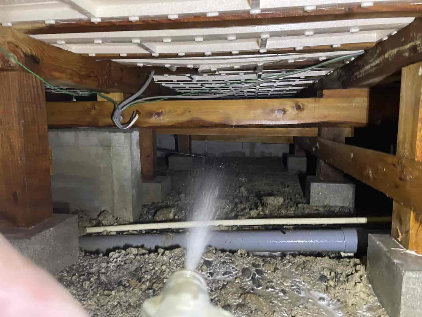 床下全面散布はもちろん、食害部、玄関、浴室に穿孔注入による直接消毒を行いました。また、床下断熱材の裏側にも蟻道を発見したので、断熱材を一部撤去し直接消毒を行いました。