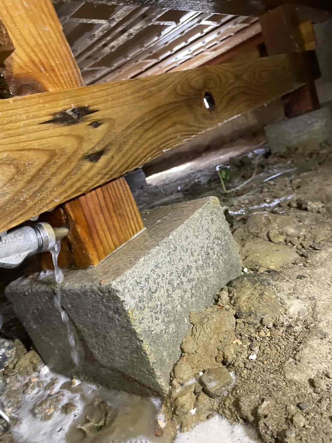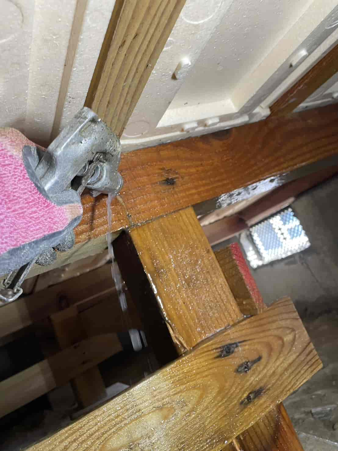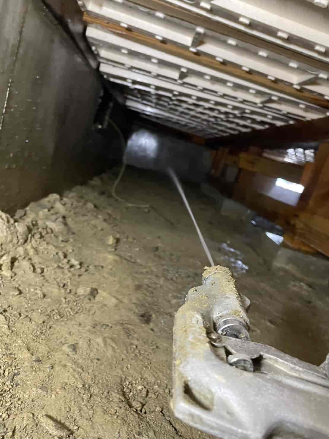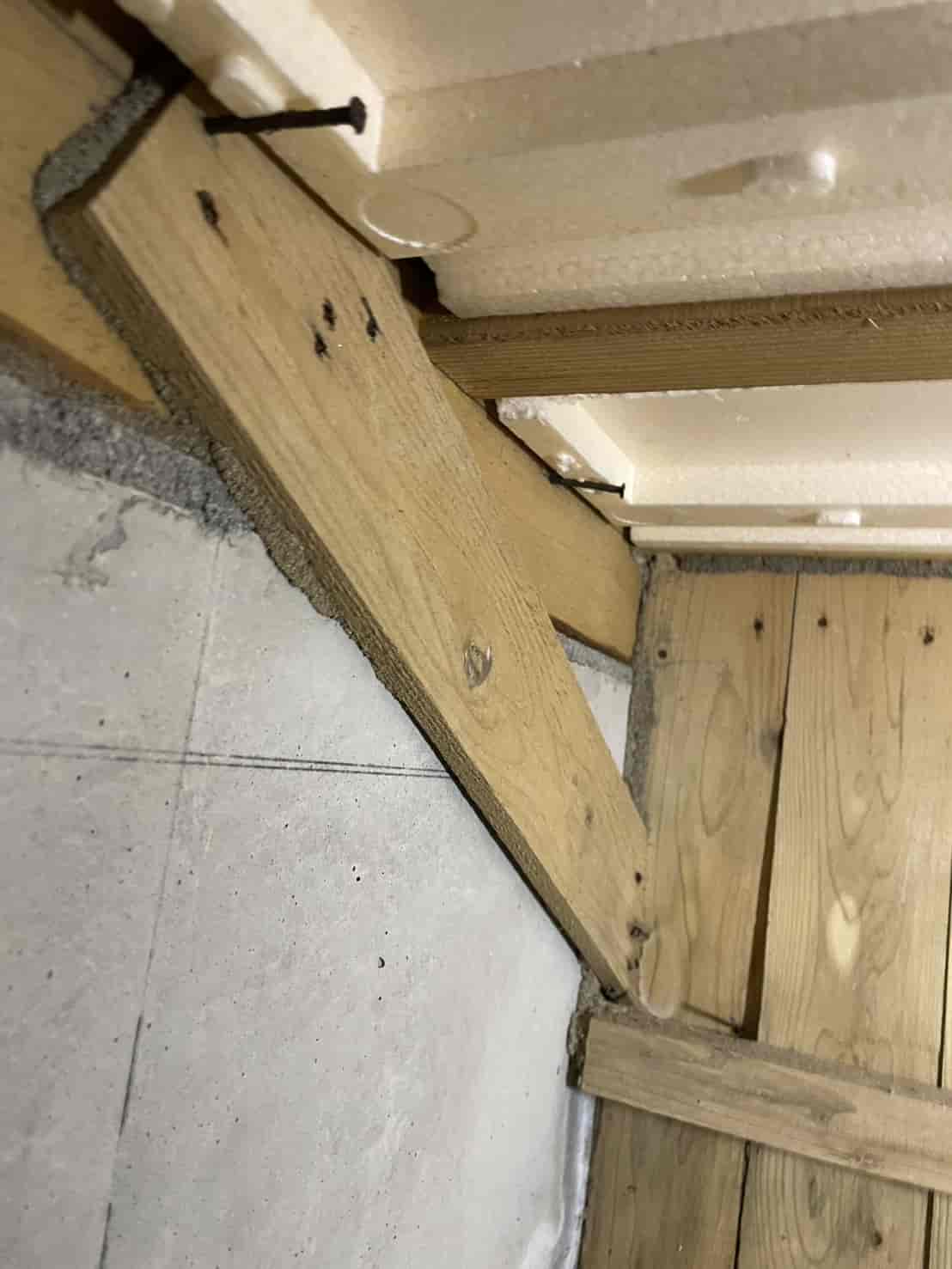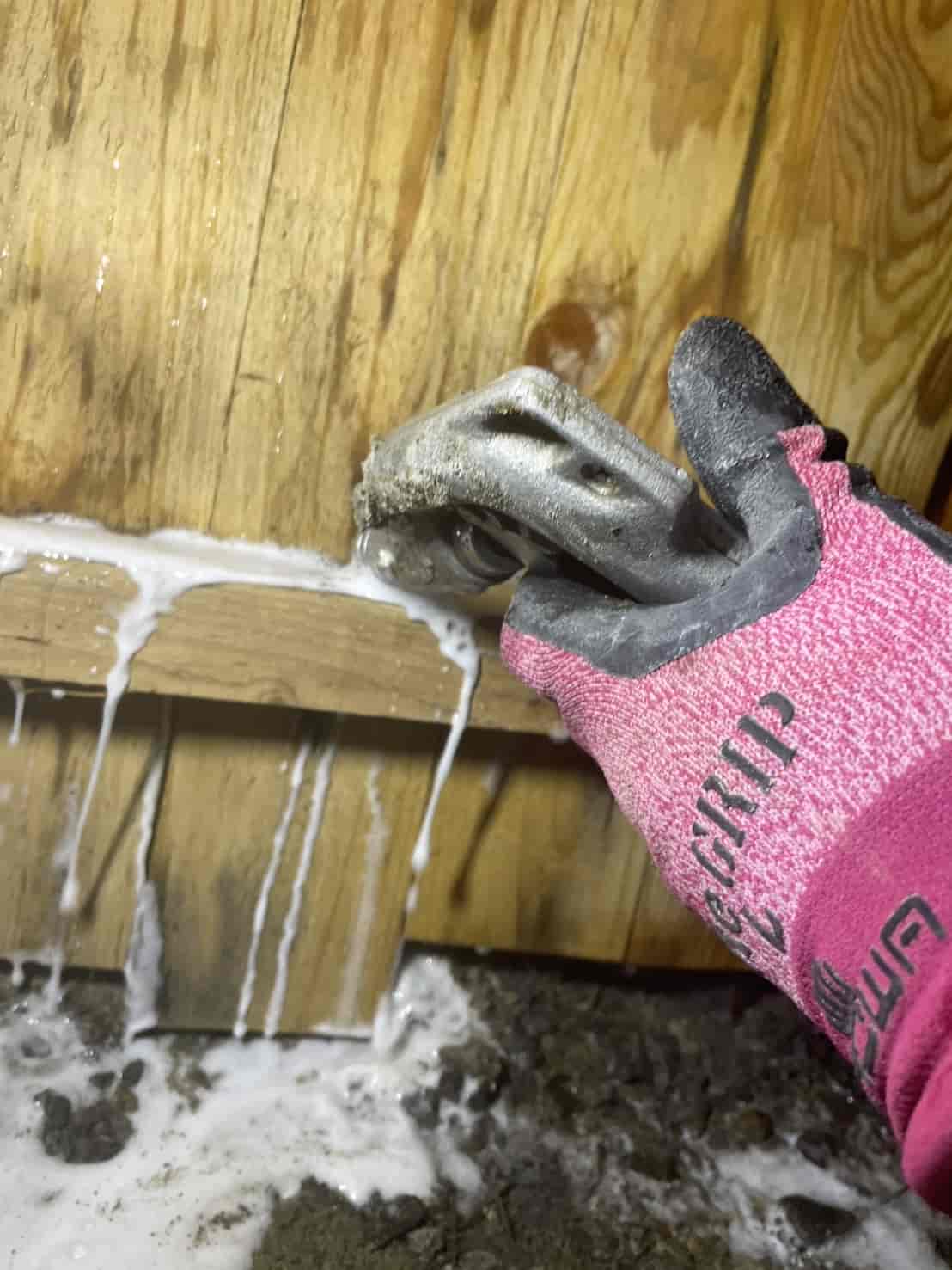 床下全面散布はもちろん、食害部、玄関、浴室に穿孔注入による直接消毒を行いました。また、床下断熱材の裏側にも蟻道を発見したので、断熱材を一部撤去し直接消毒を行いました。