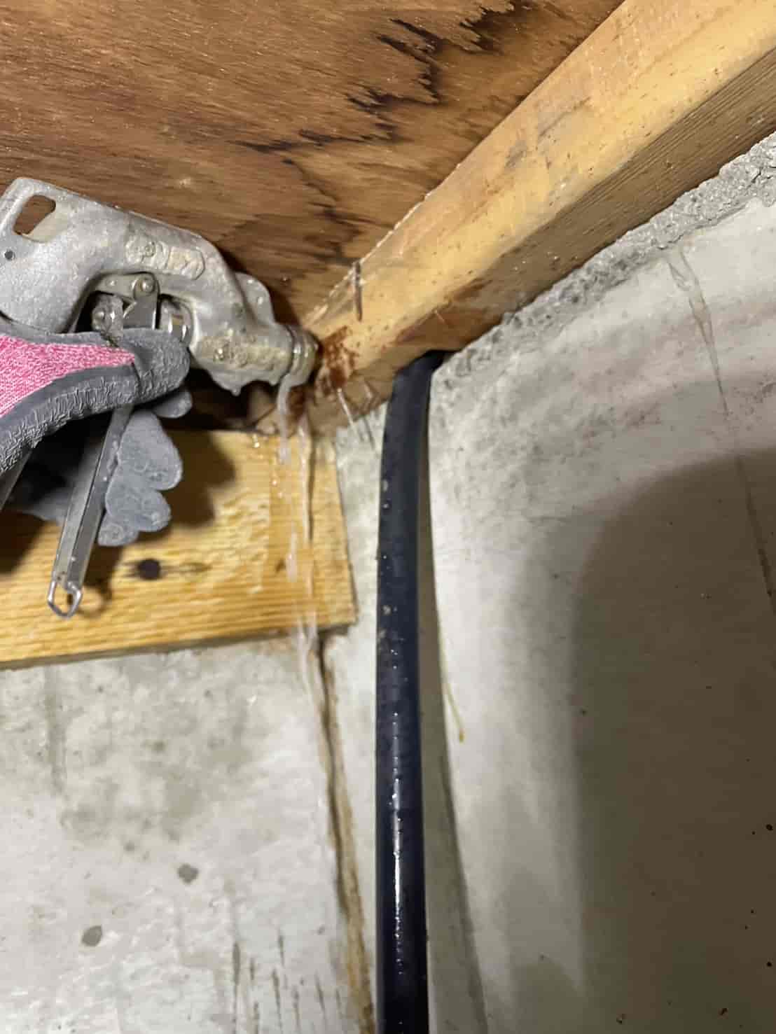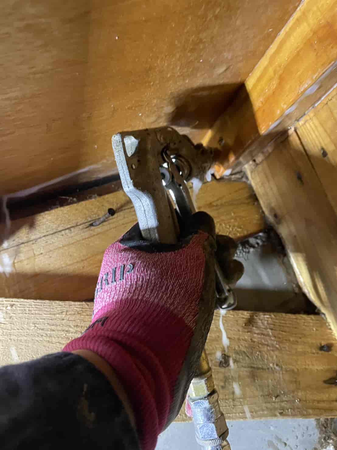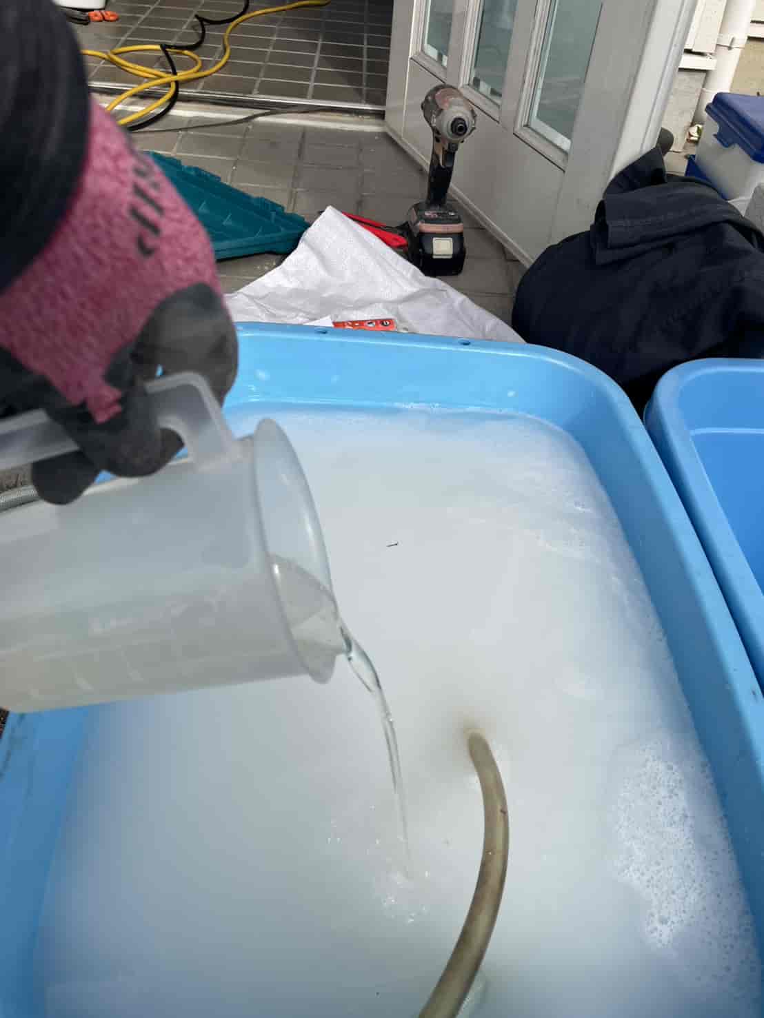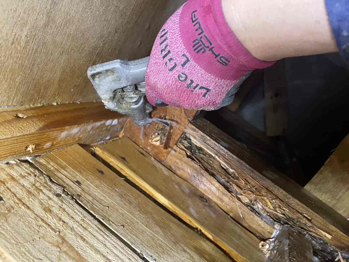 床下全面散布はもちろん、食害部、玄関、浴室に穿孔注入による直接消毒を行いました。また、床下断熱材の裏側にも蟻道を発見したので、断熱材を一部撤去し直接消毒を行いました。