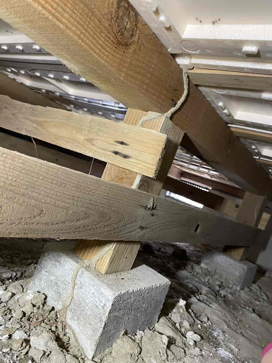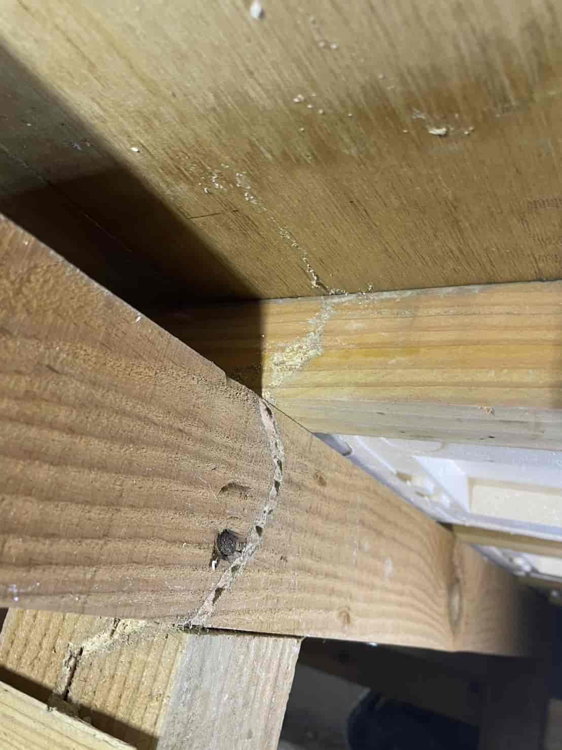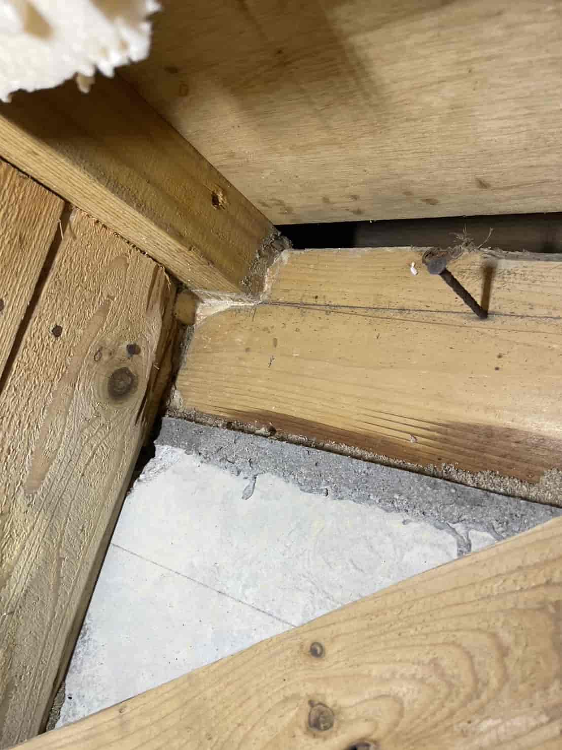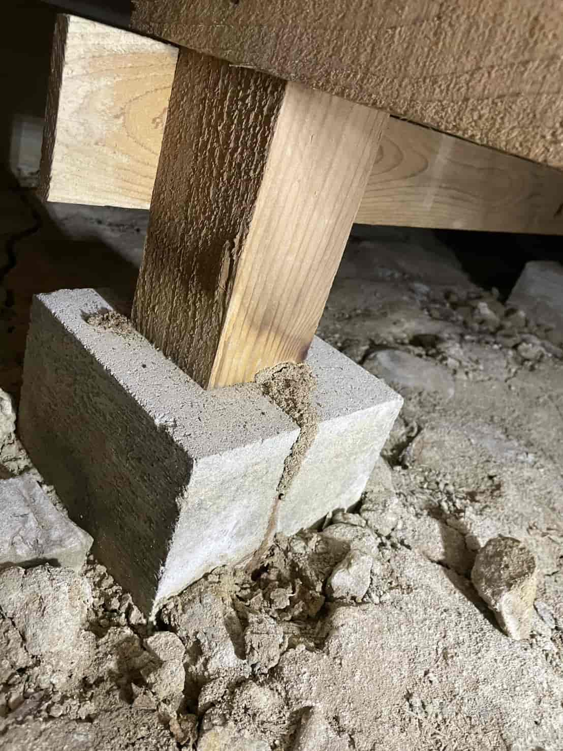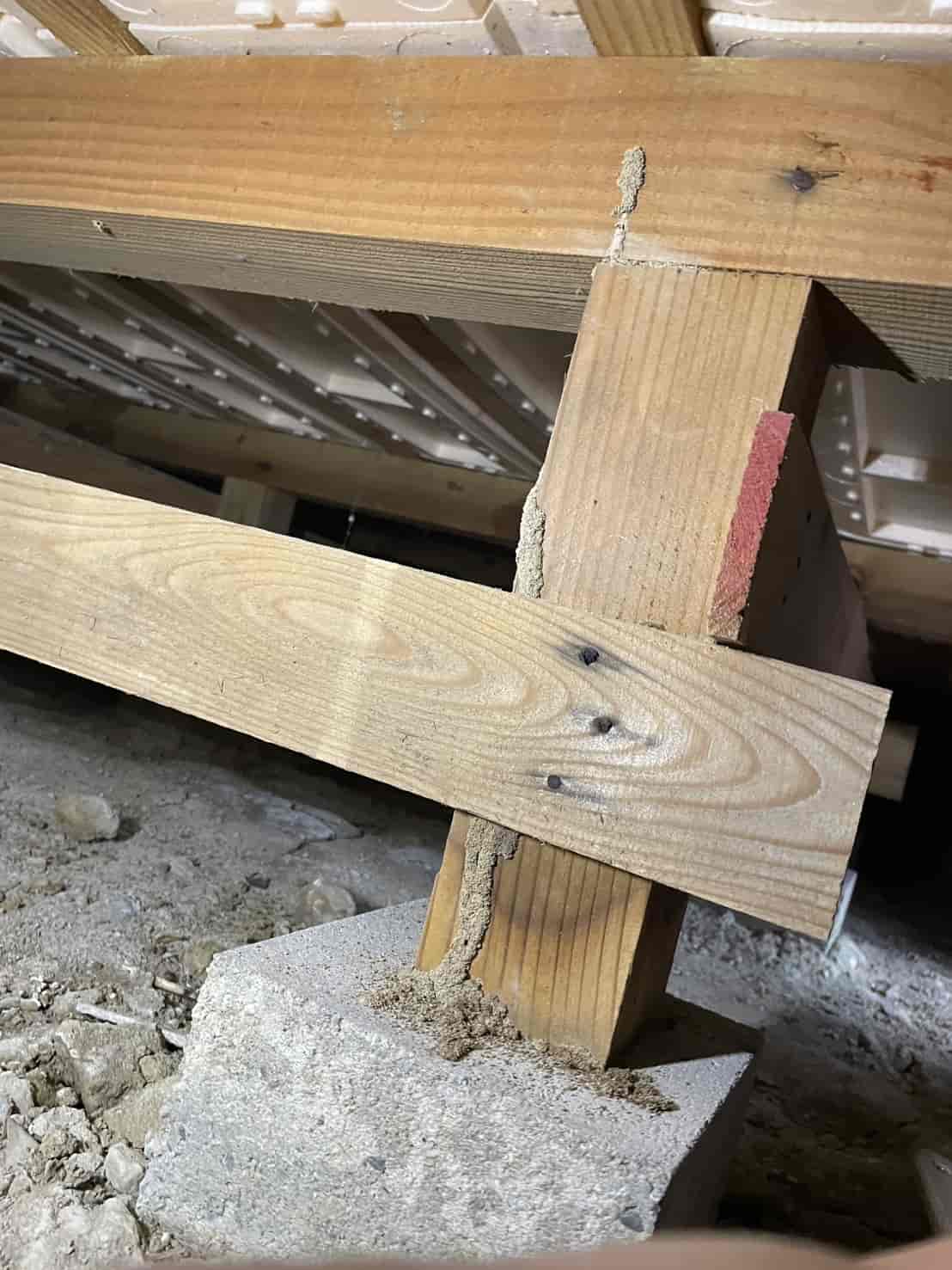 和歌山県岩出市のお客様より玄関の框部分の木が空洞になっているとの相談を受け訪問したところ、框部分がシロアリによる被害が確認され、床下にも蟻道や食害が多数確認されました。