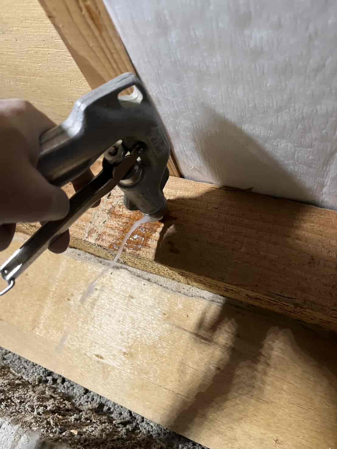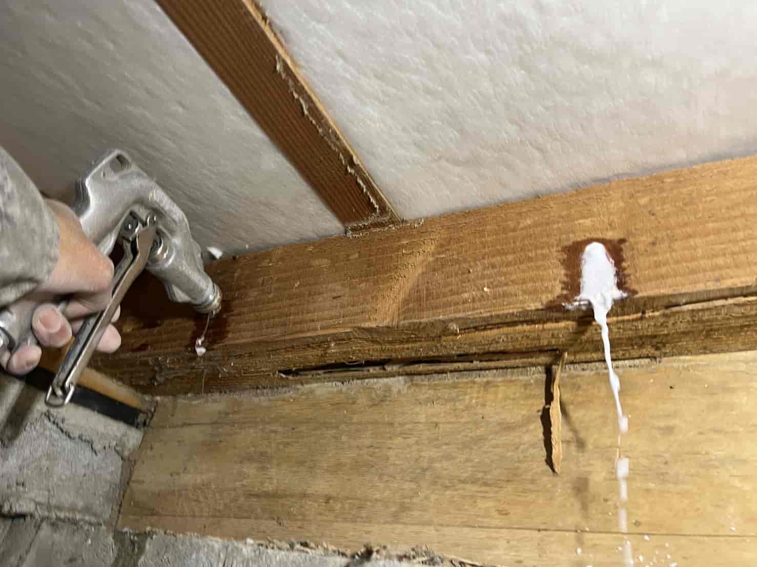 框の穿孔注入: 露出した被害箇所である框に薬剤を注入し、シロアリを直接駆除するとともに、再侵入を防ぎます。