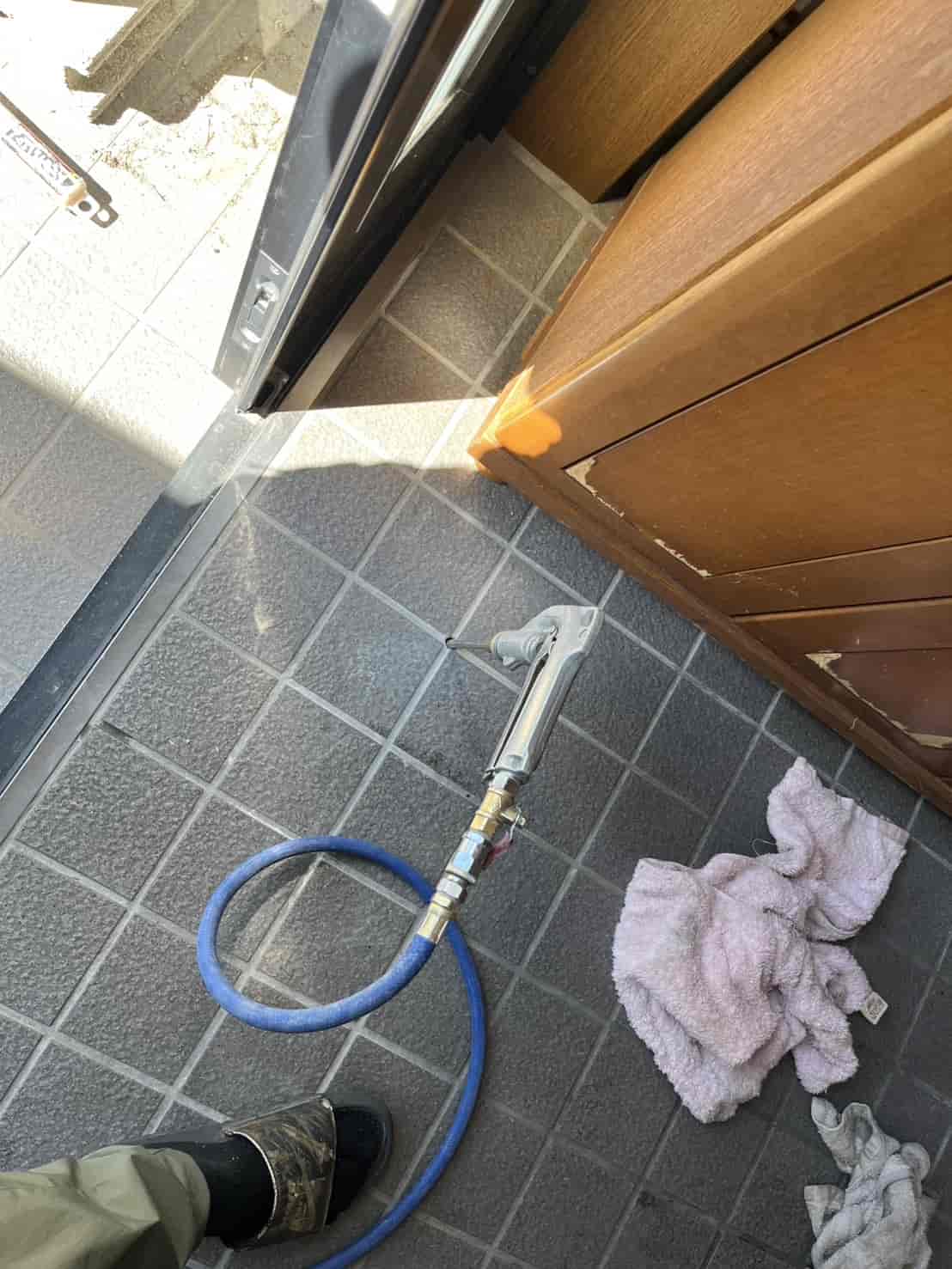 【対応】玄関框から蟻道が見つかりイエシロアリ被害が判明したため、框・床下木部への穿孔注入や床下全面の薬剤散布など複合的な駆除・予防工事を実施しました。