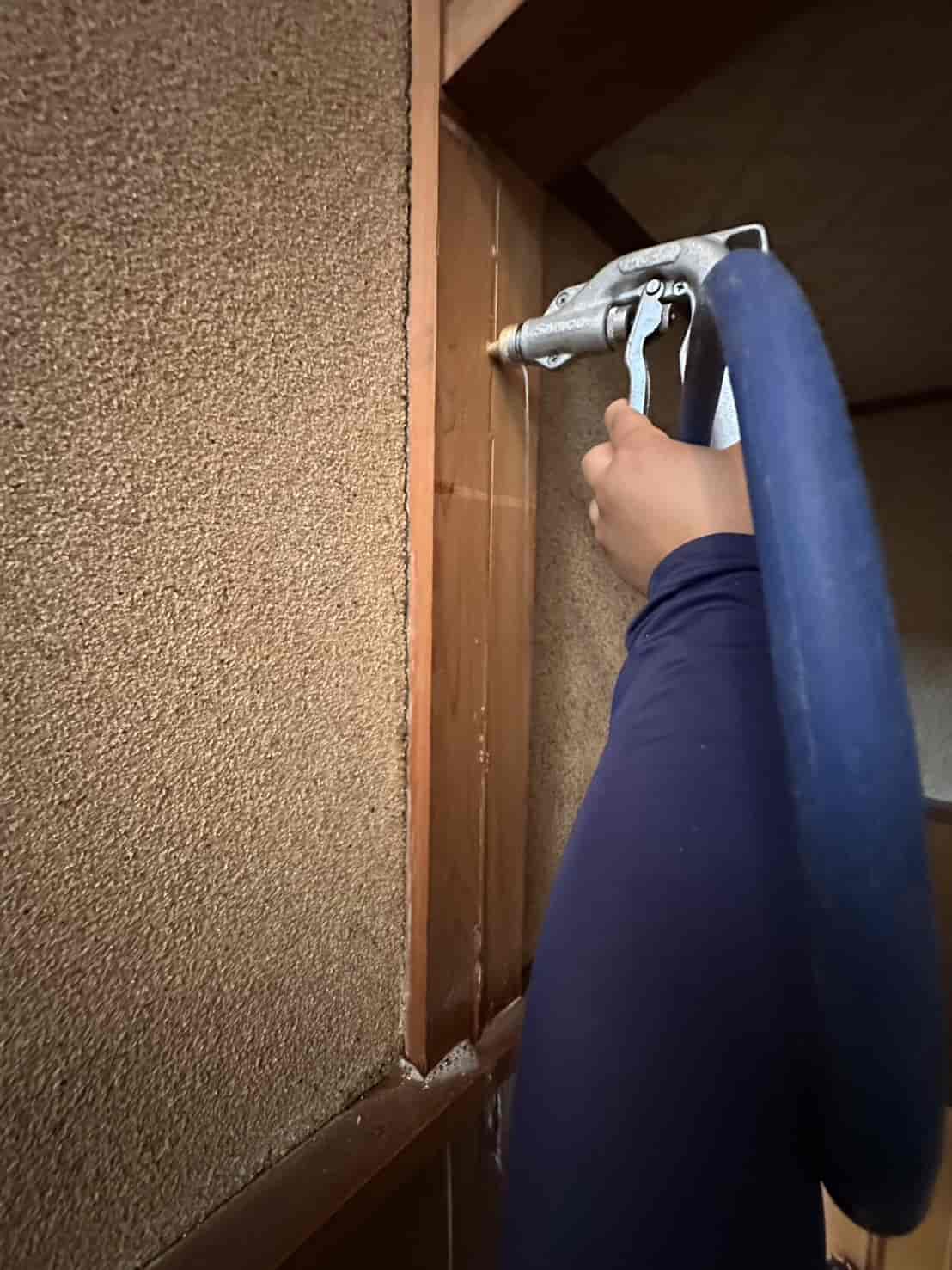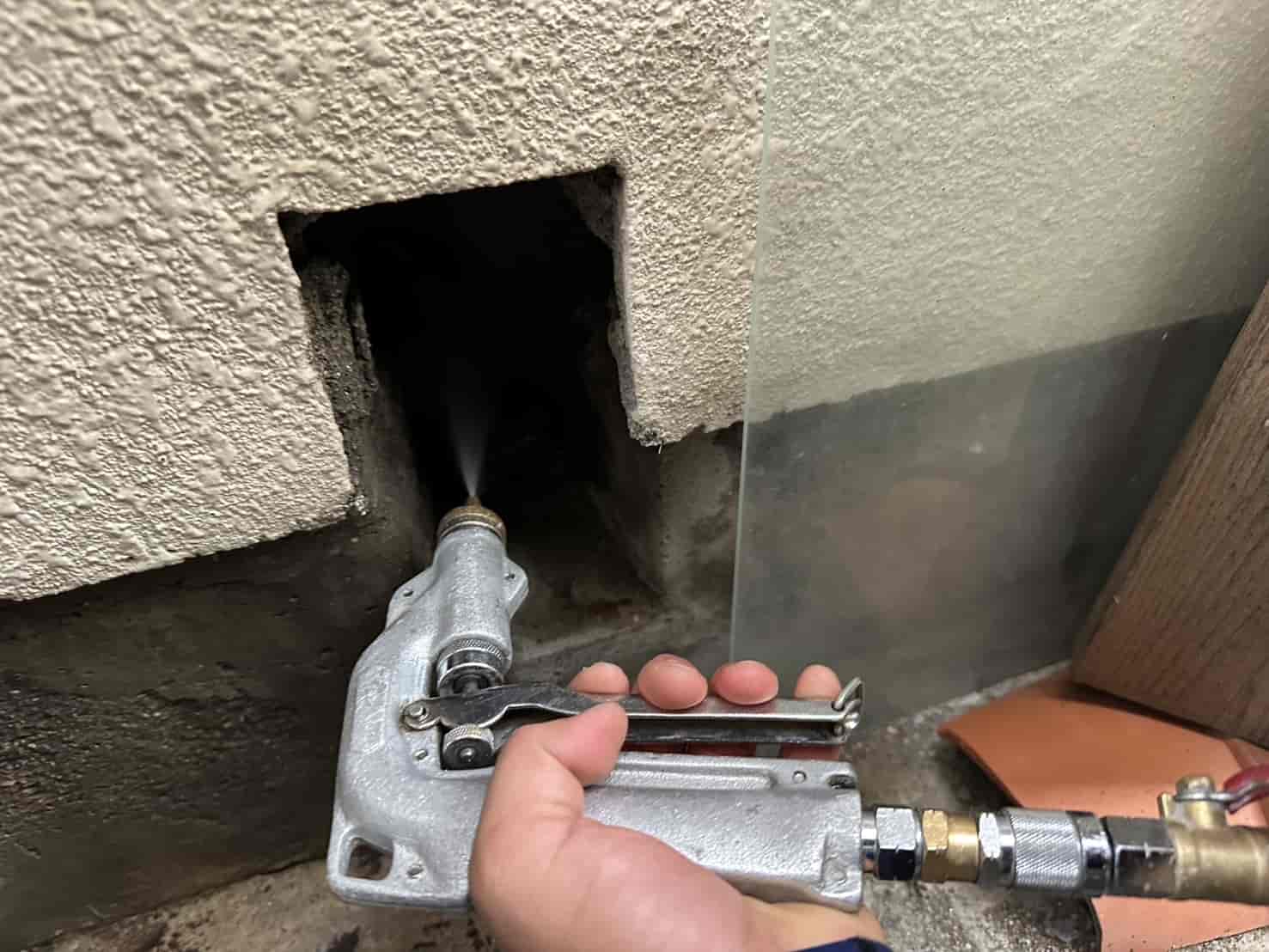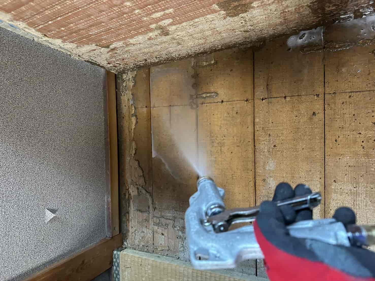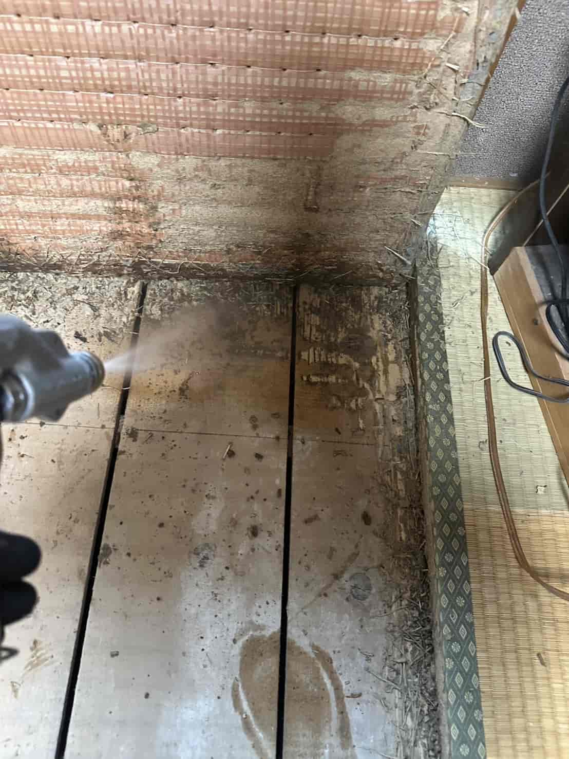 その後、木部表面全体にも薬剤を散布し、白アリの駆除と再発防止を同時に実施しました。