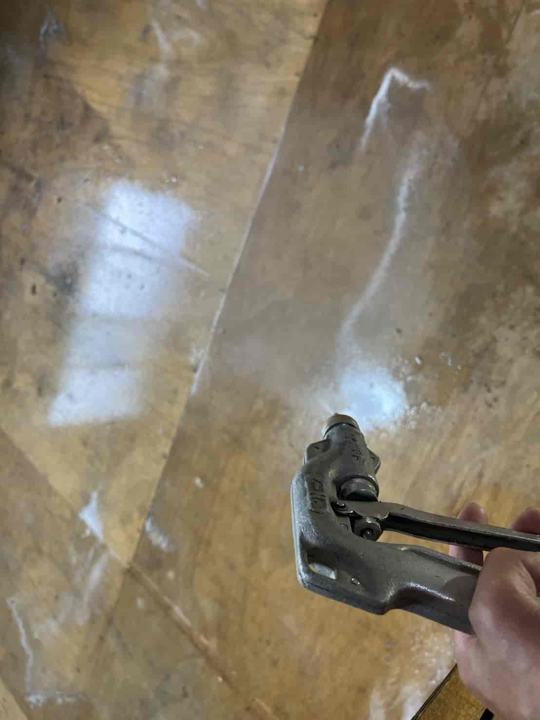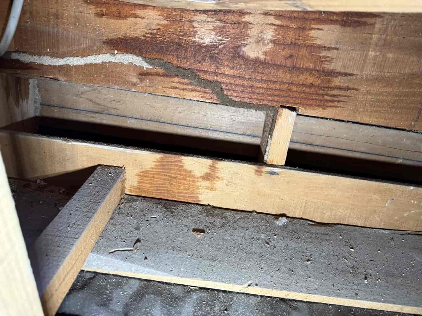 また、和室の畳をめくって確認したところ、座板にも複数の喰い跡があり、すでに2階の天井裏へと白アリの道(蟻道)が伸びているのが確認できました。