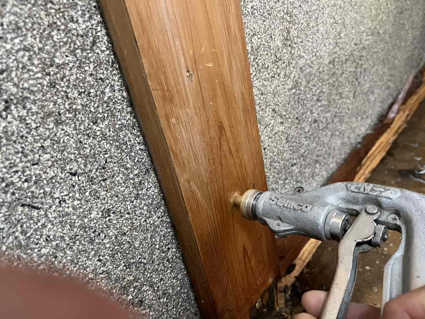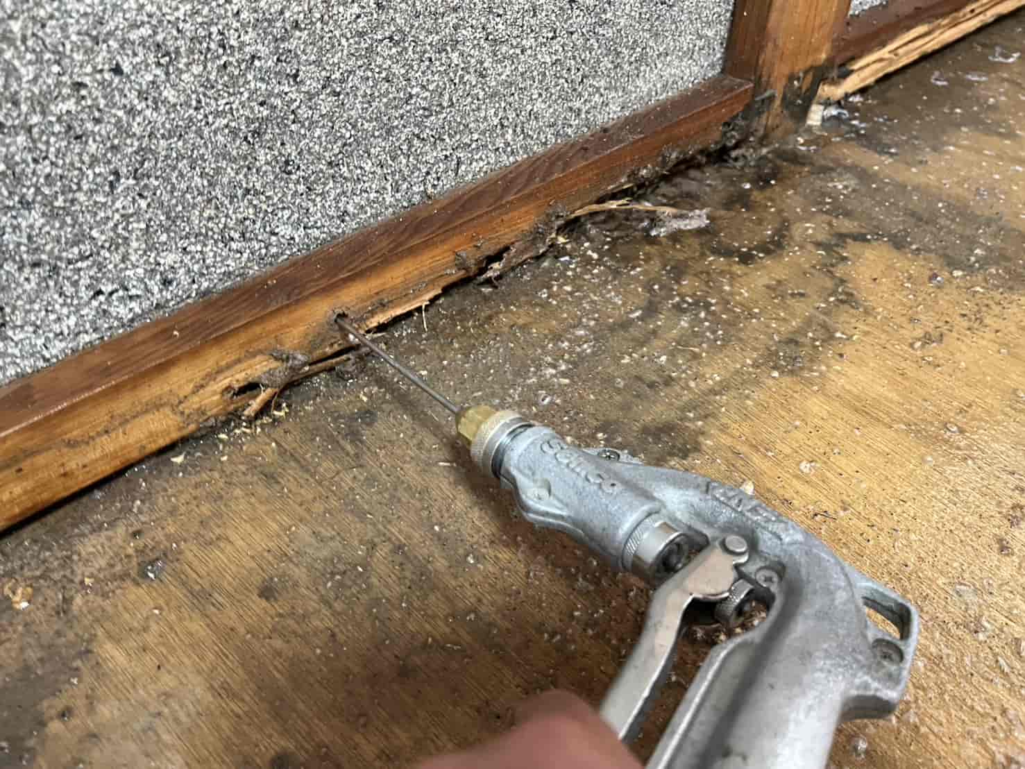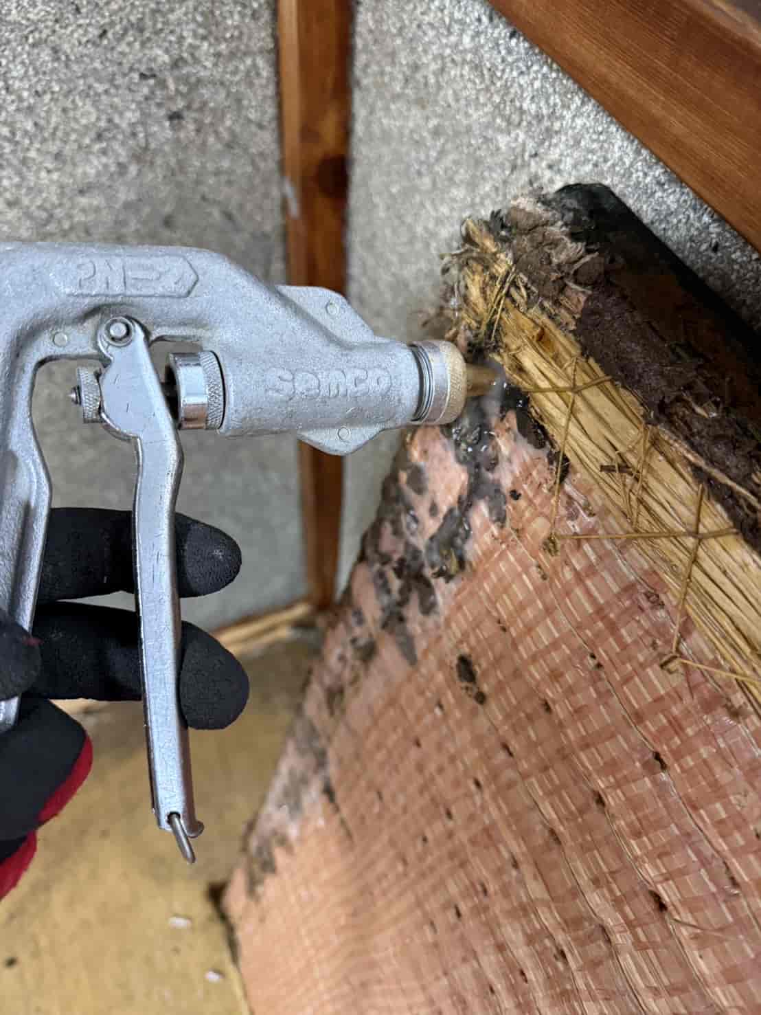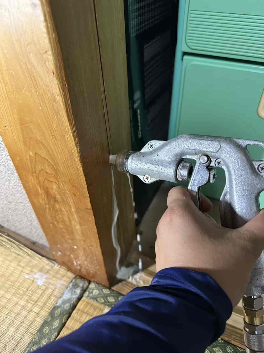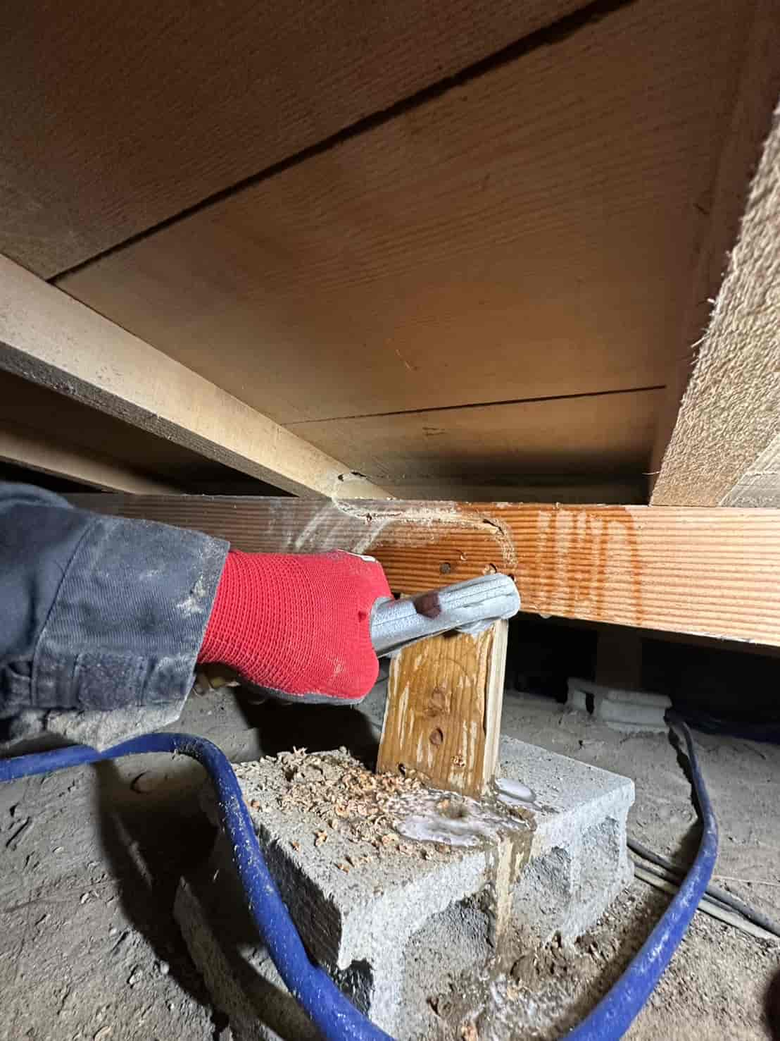 床下の主要な構造木部に細かい穴(穿孔)を開け、内部まで薬剤を圧入。