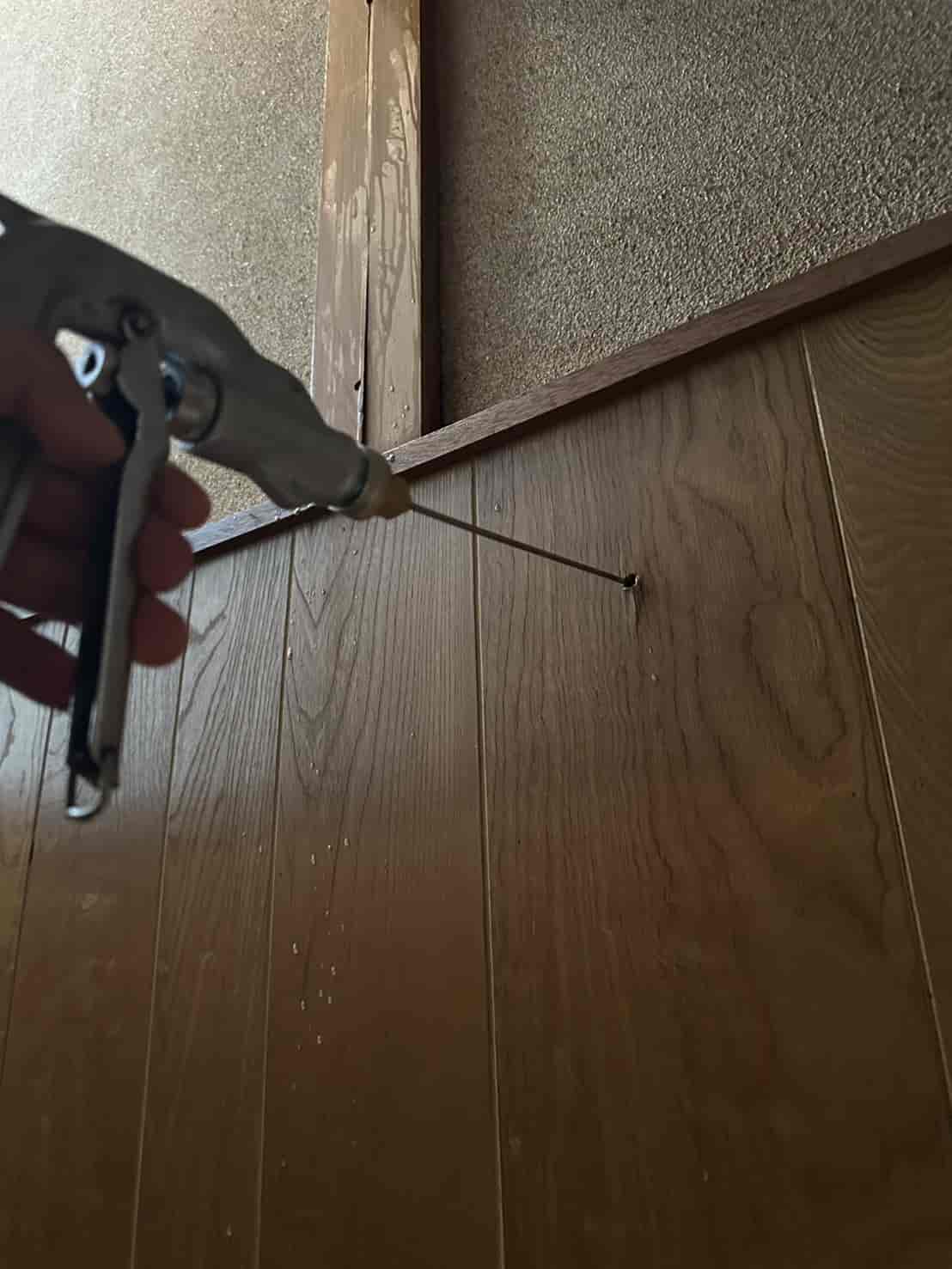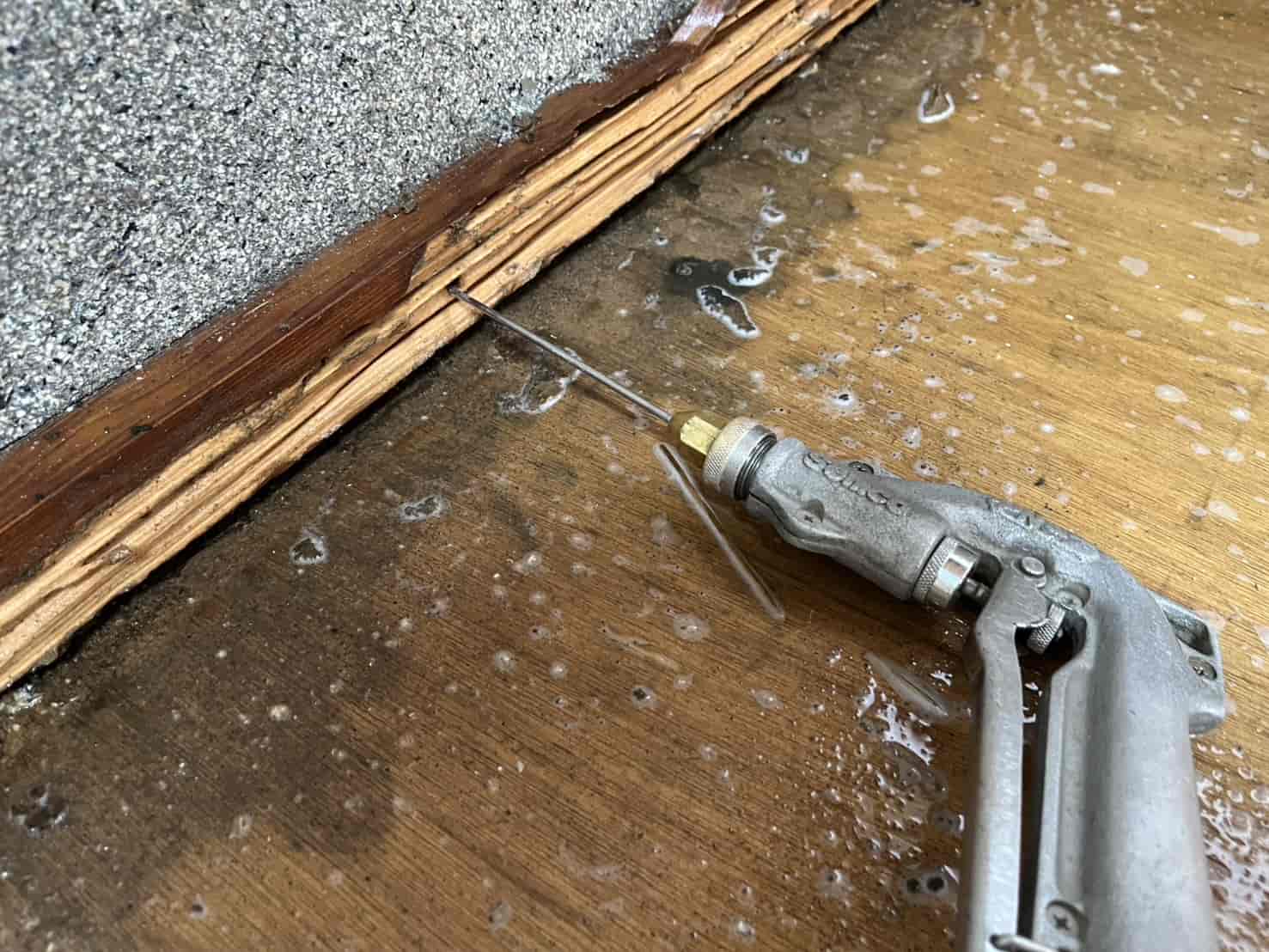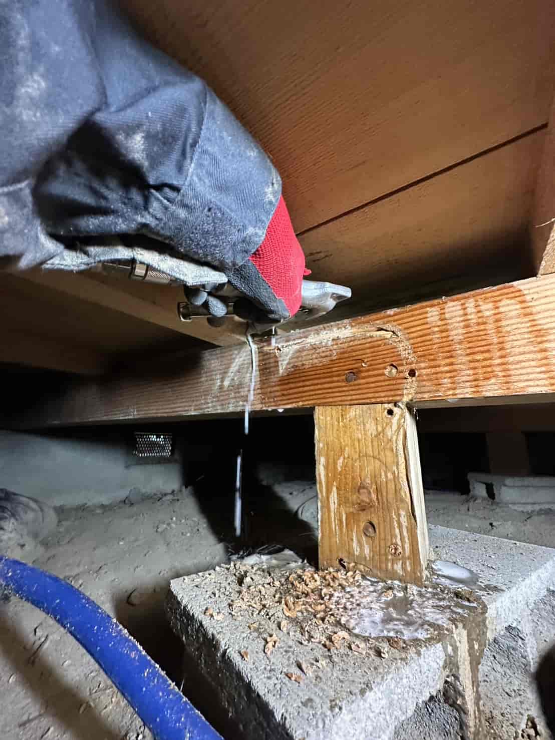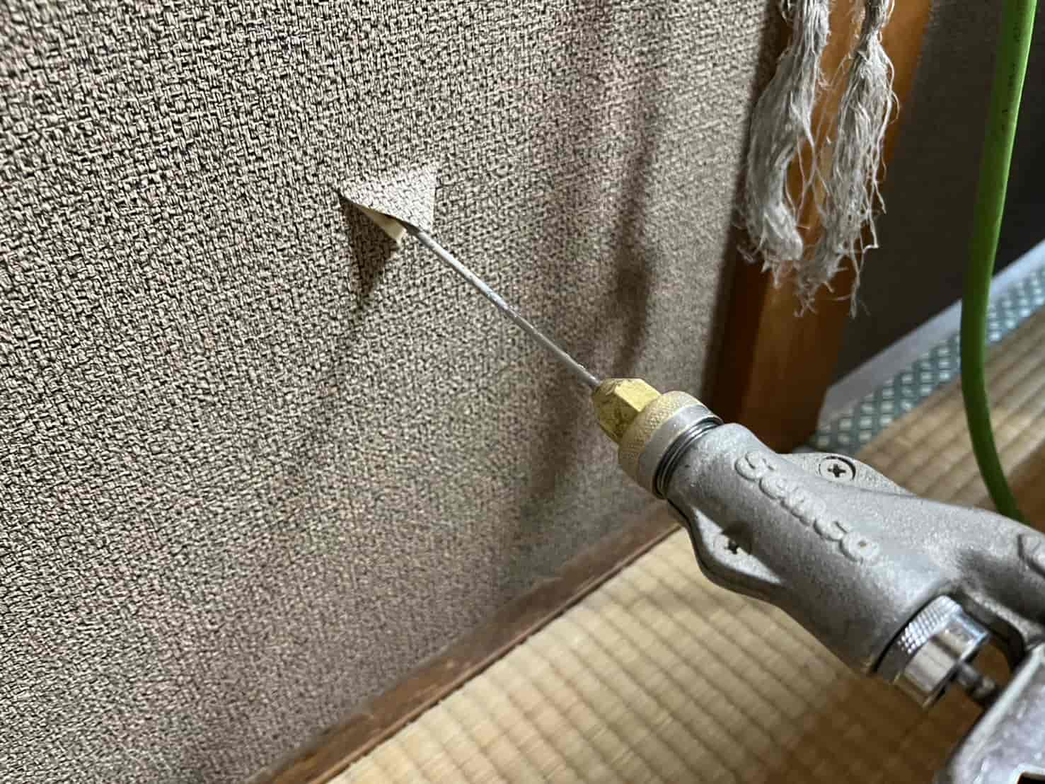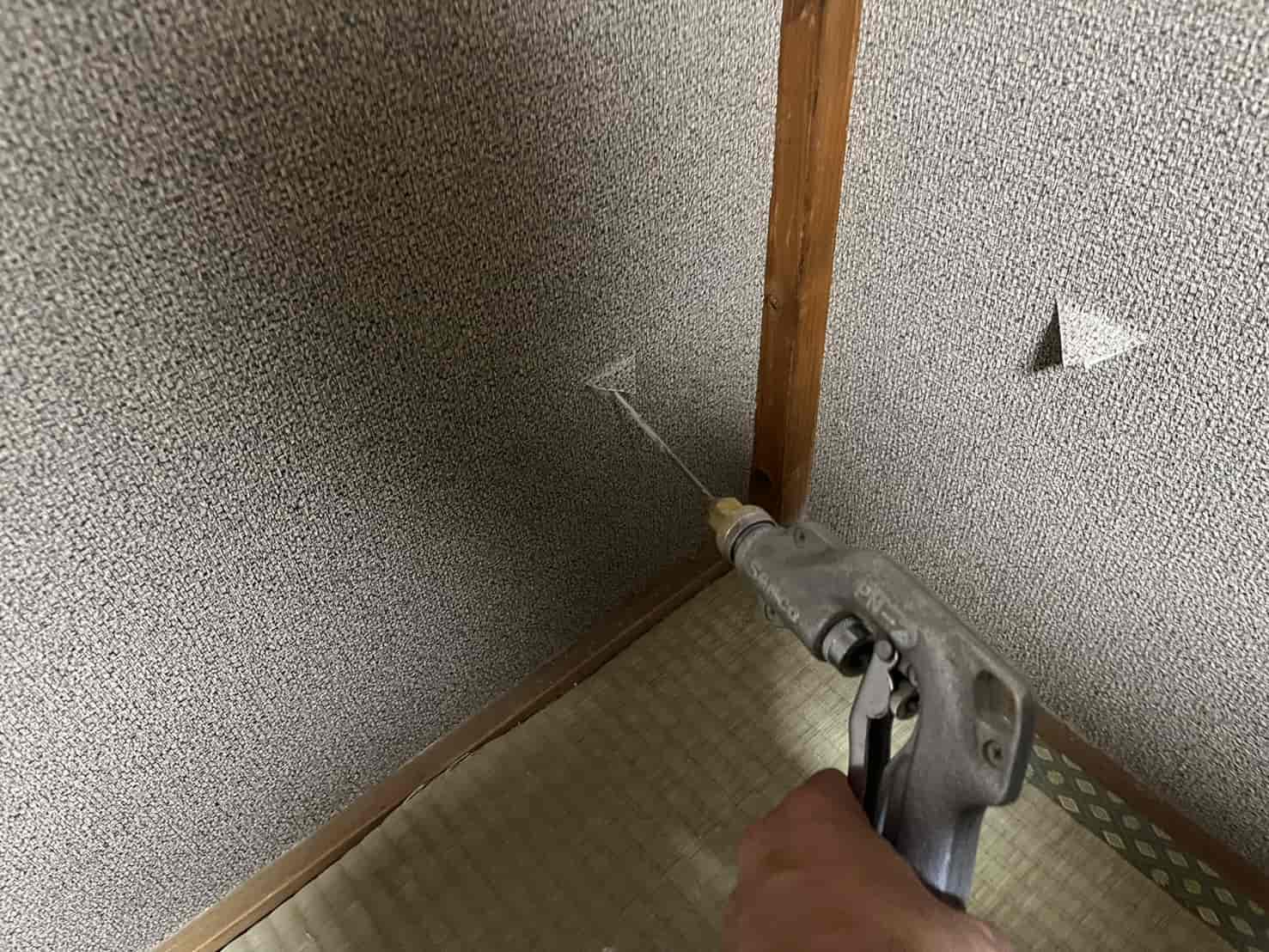 床下の主要な構造木部に細かい穴(穿孔)を開け、内部まで薬剤を圧入。