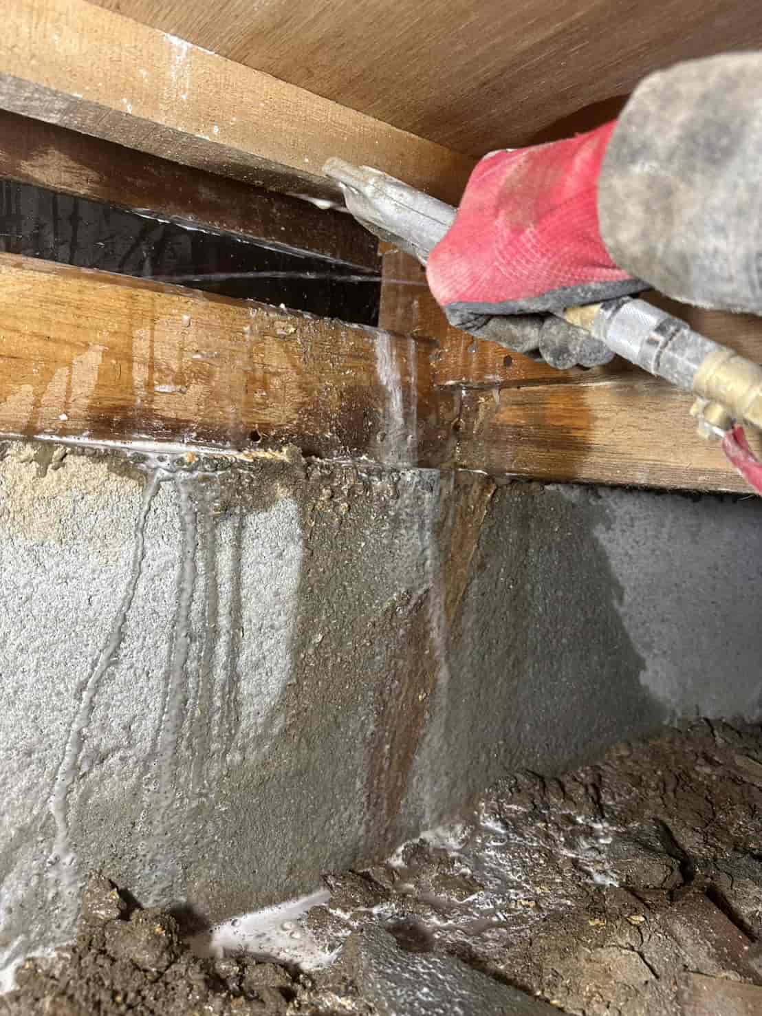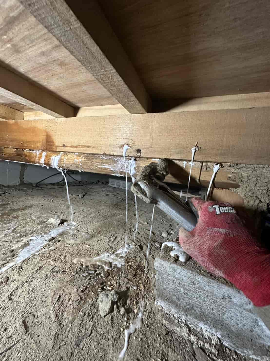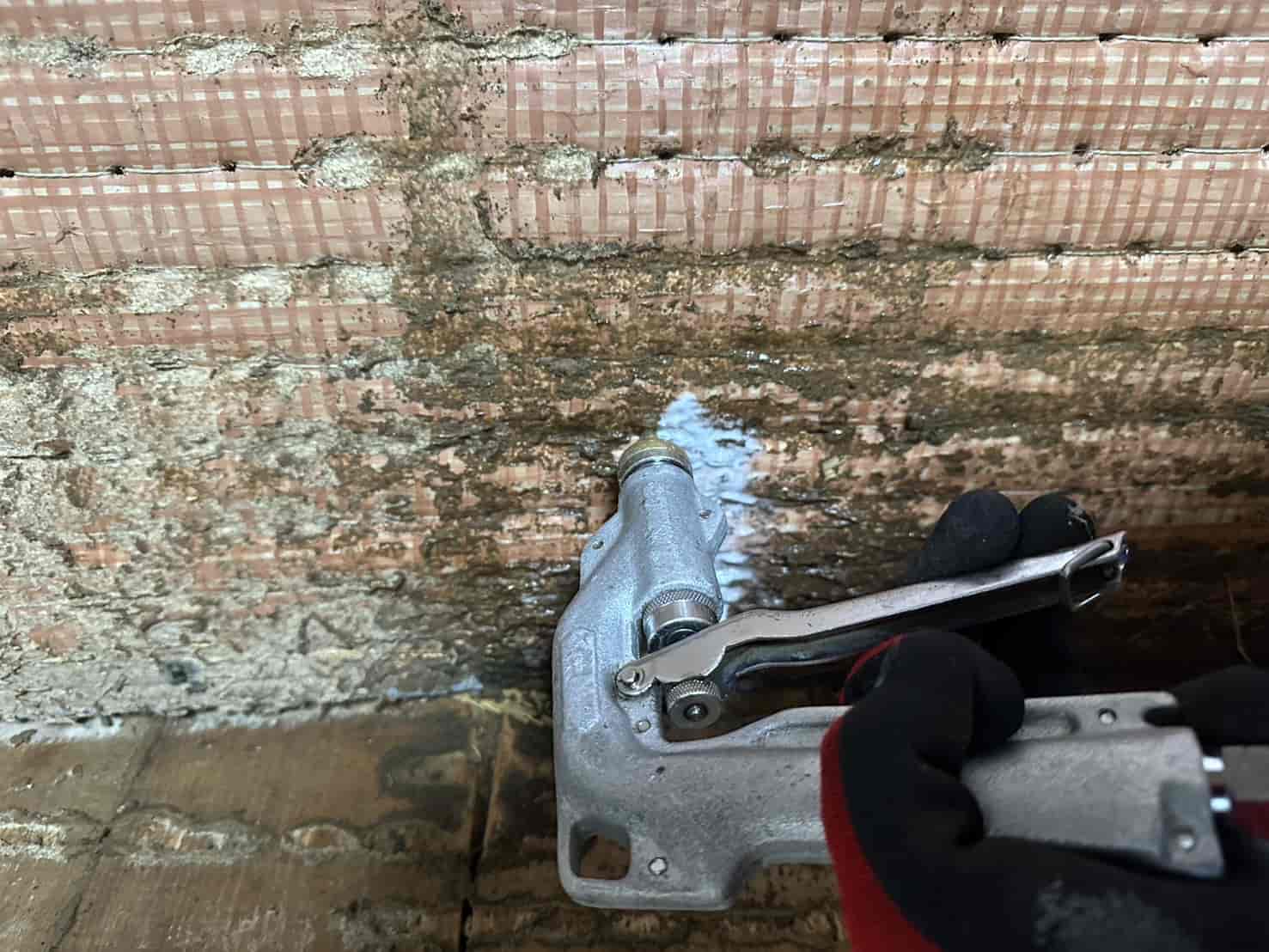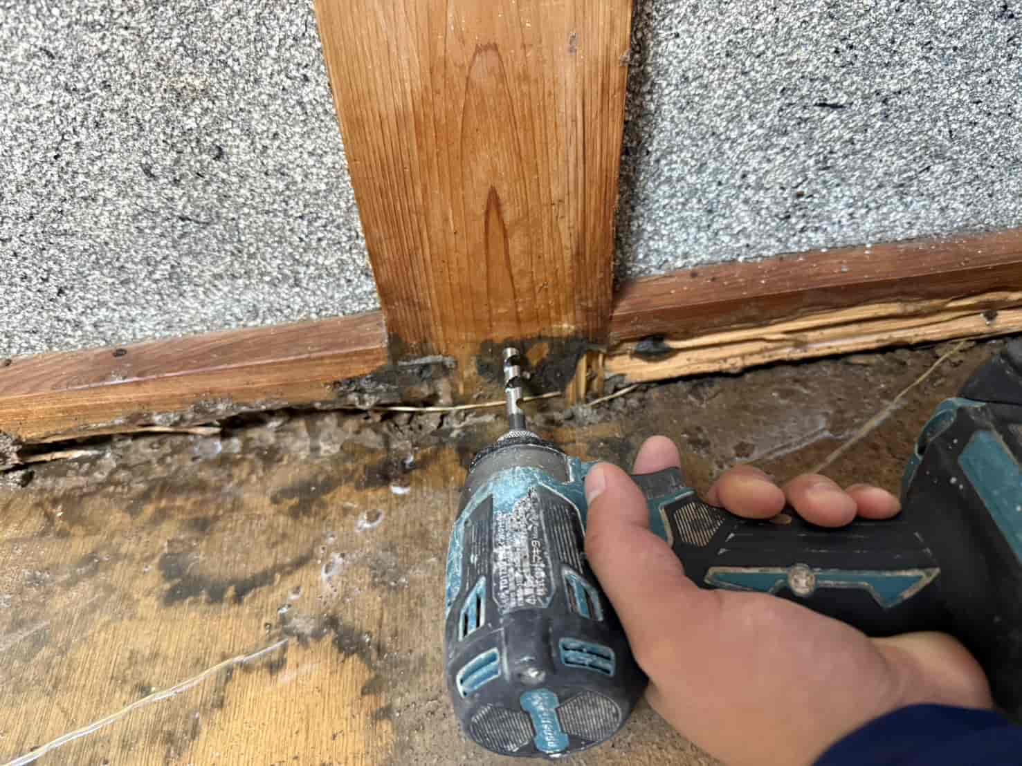 床下の主要な構造木部に細かい穴(穿孔)を開け、内部まで薬剤を圧入。