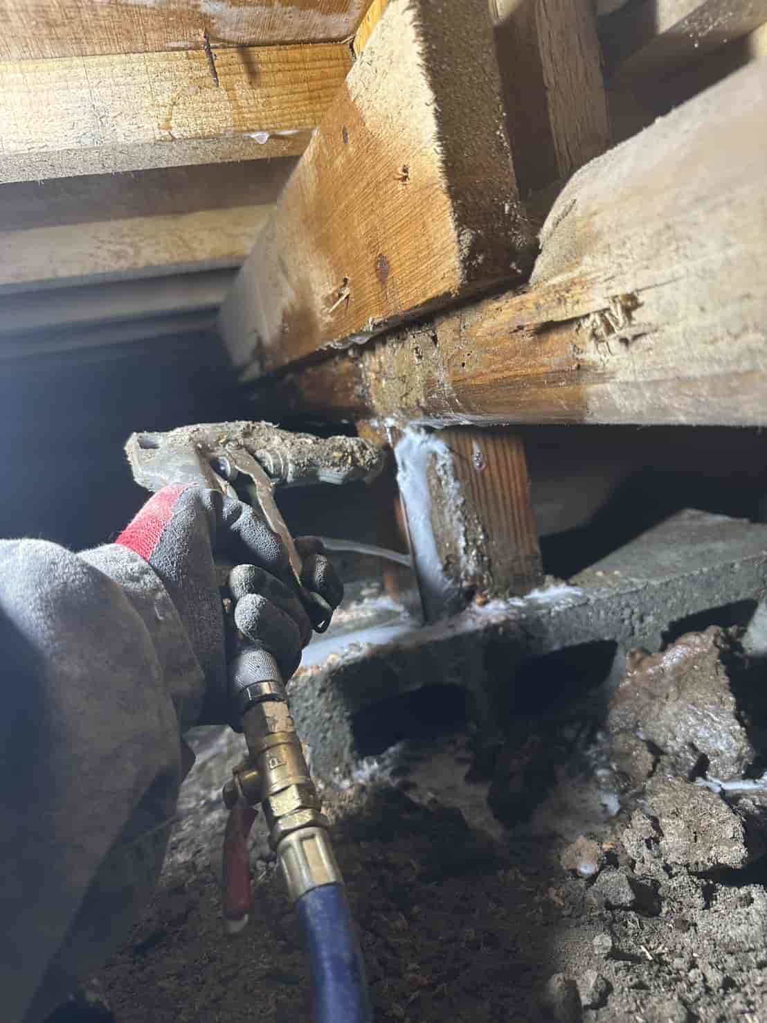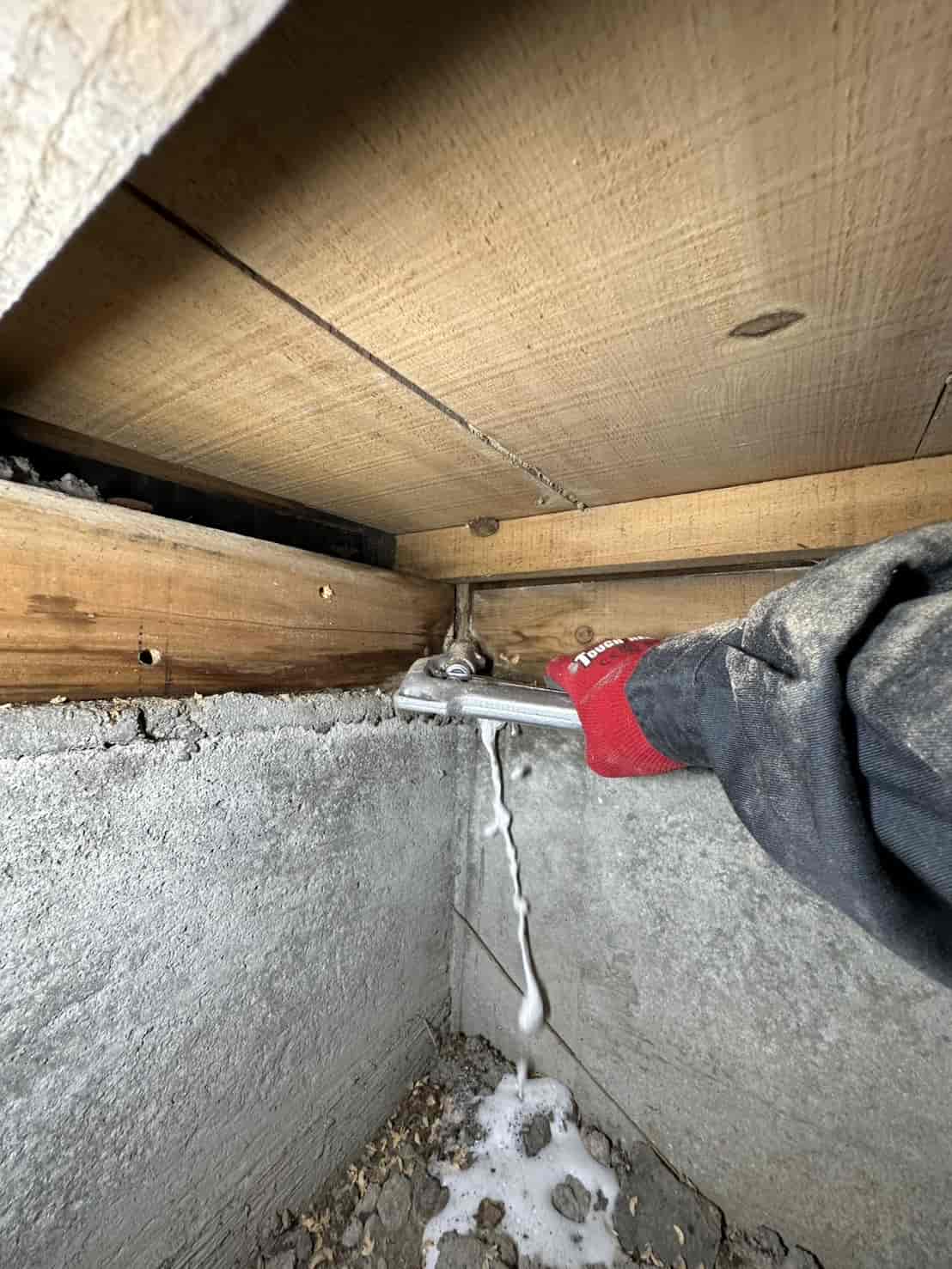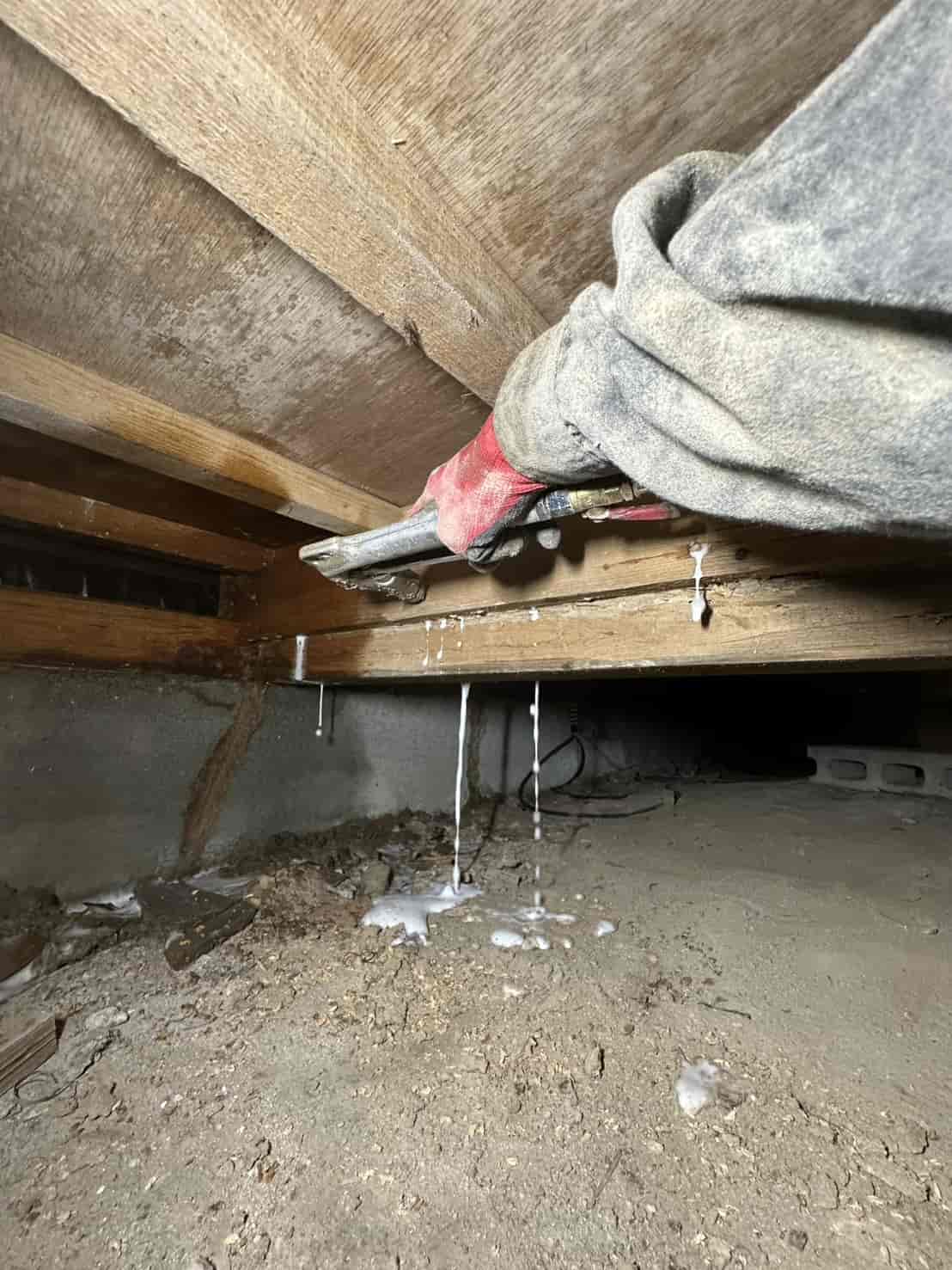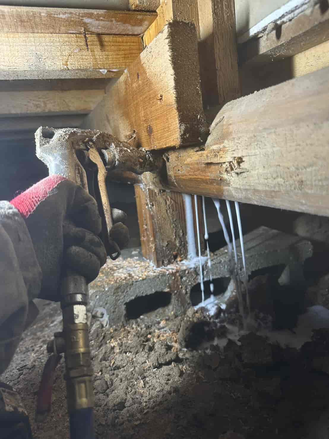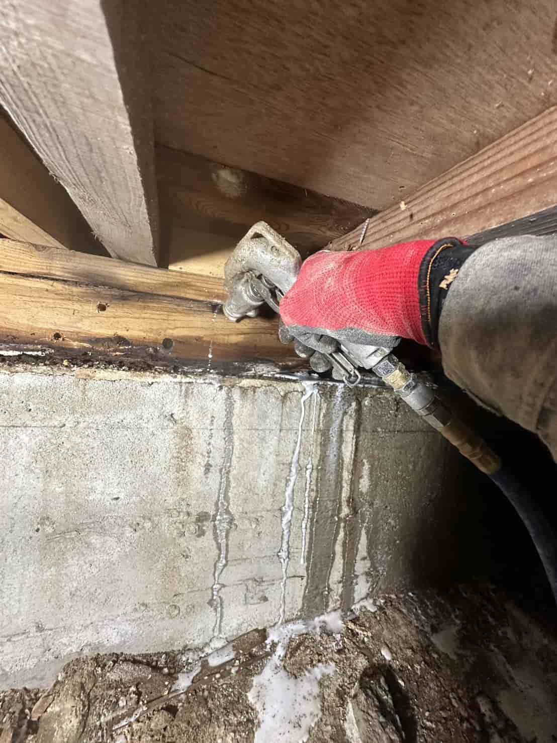 床下の主要な構造木部に細かい穴(穿孔)を開け、内部まで薬剤を圧入。