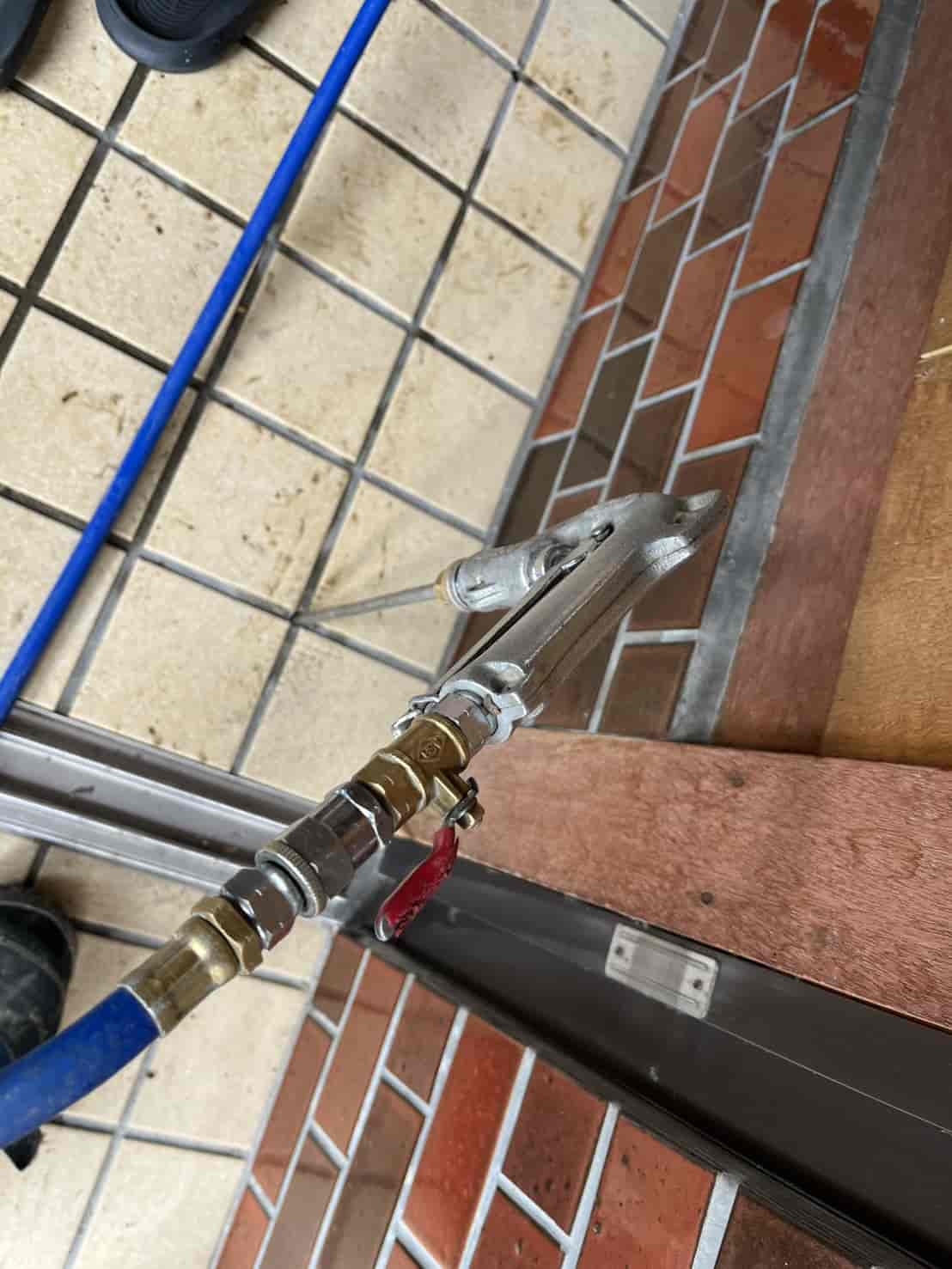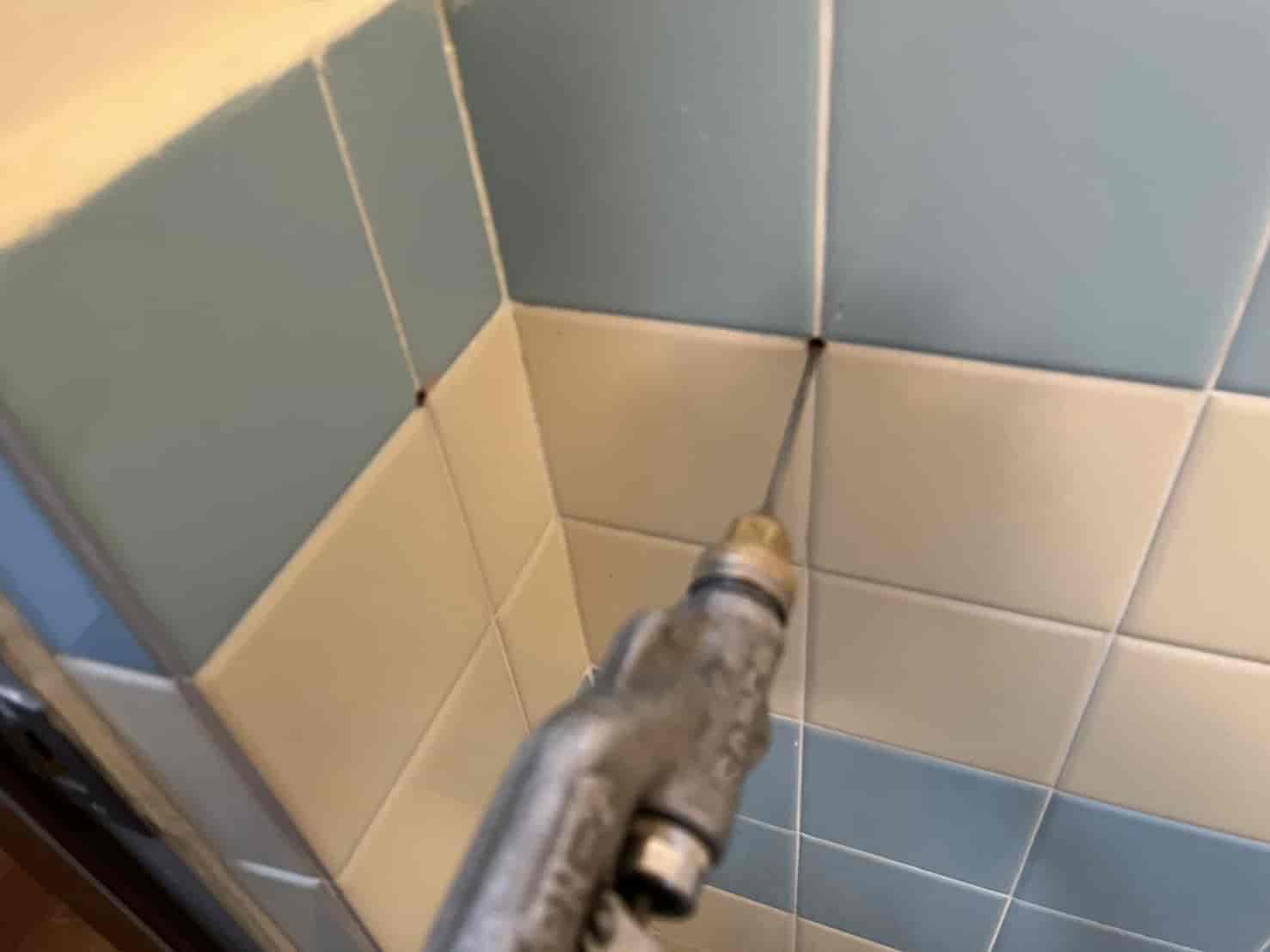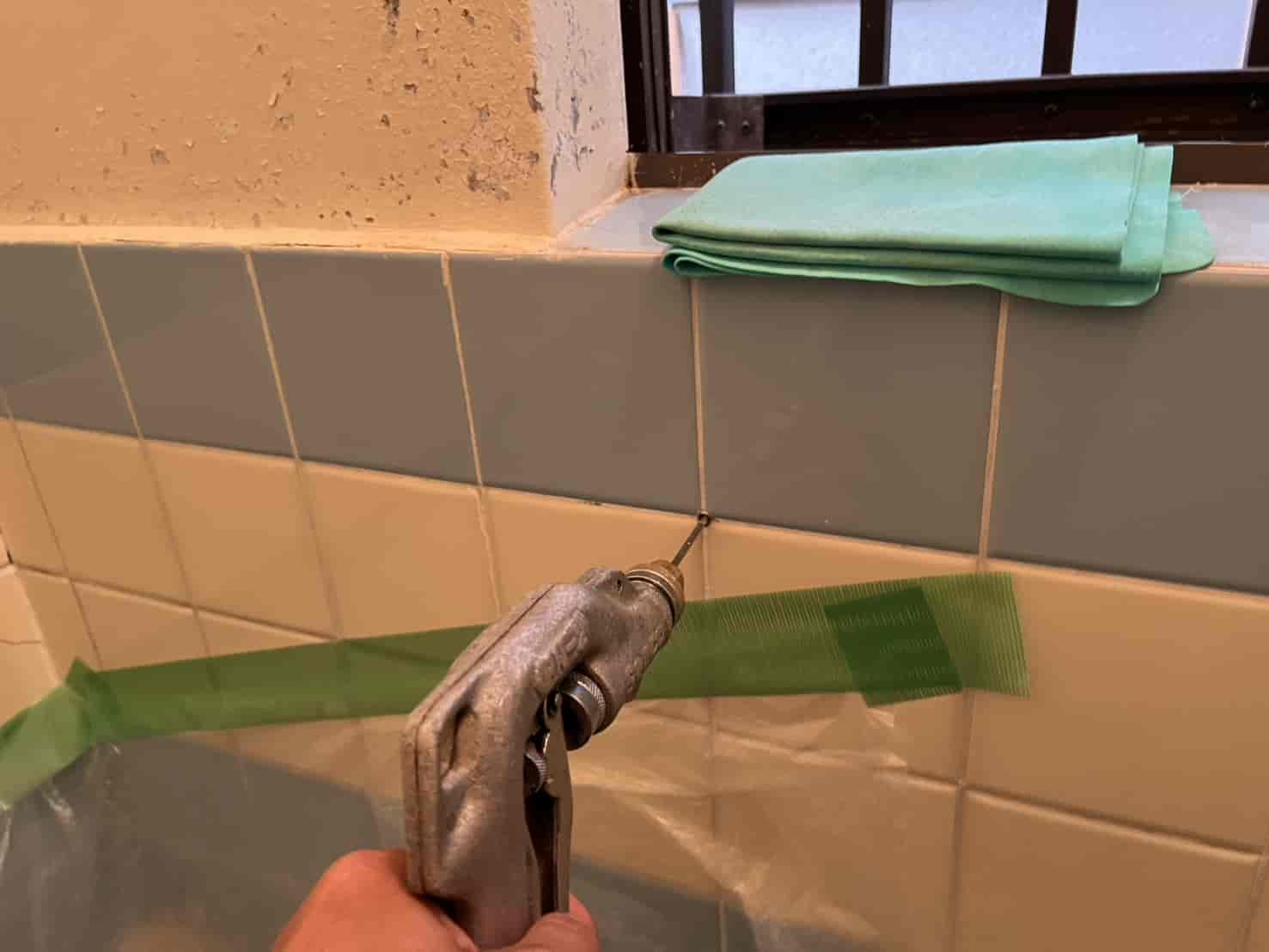 タイルやスラブの目地に専用ドリルで小さな穴をあけ、内部へ薬剤を高圧注入しました。