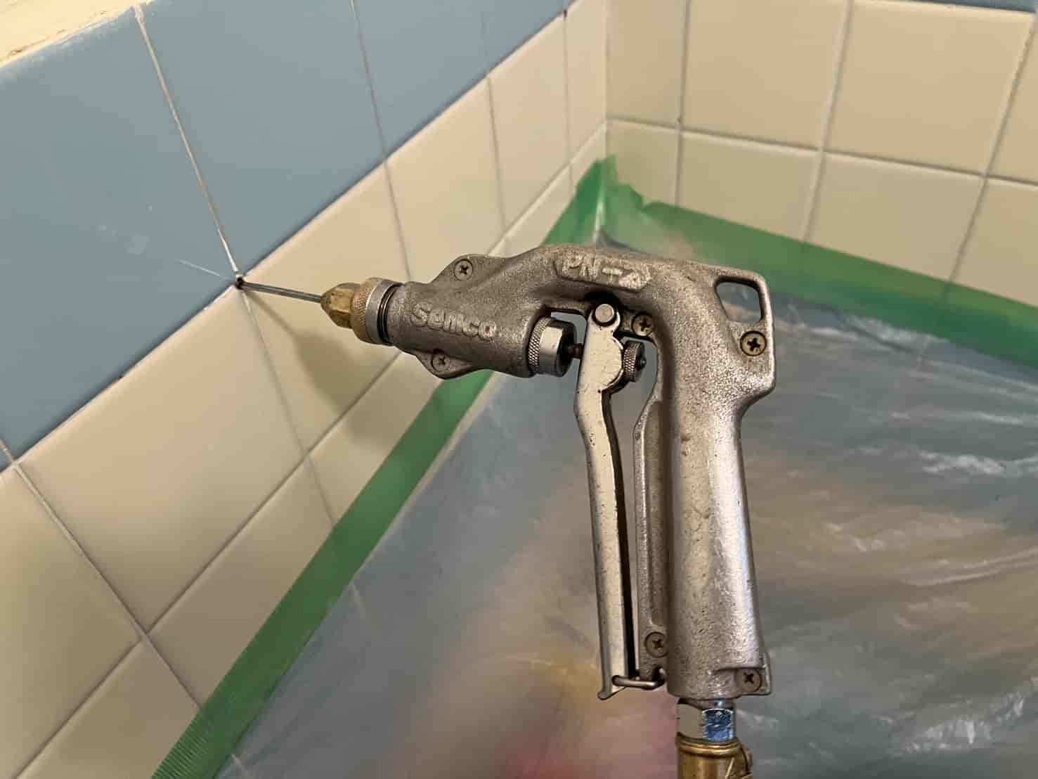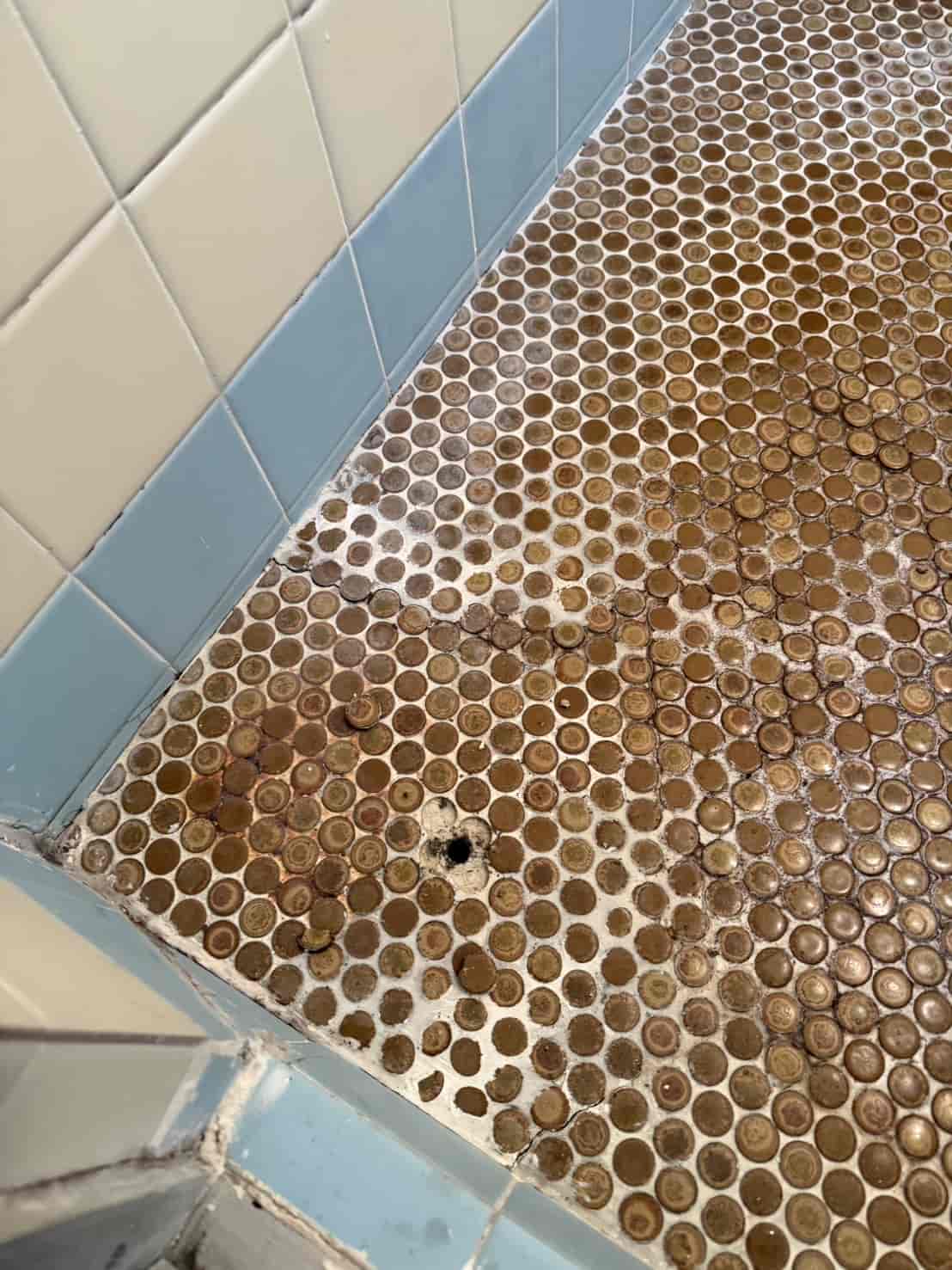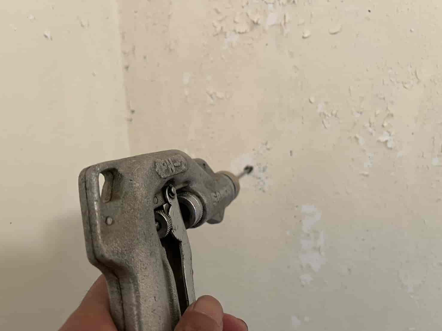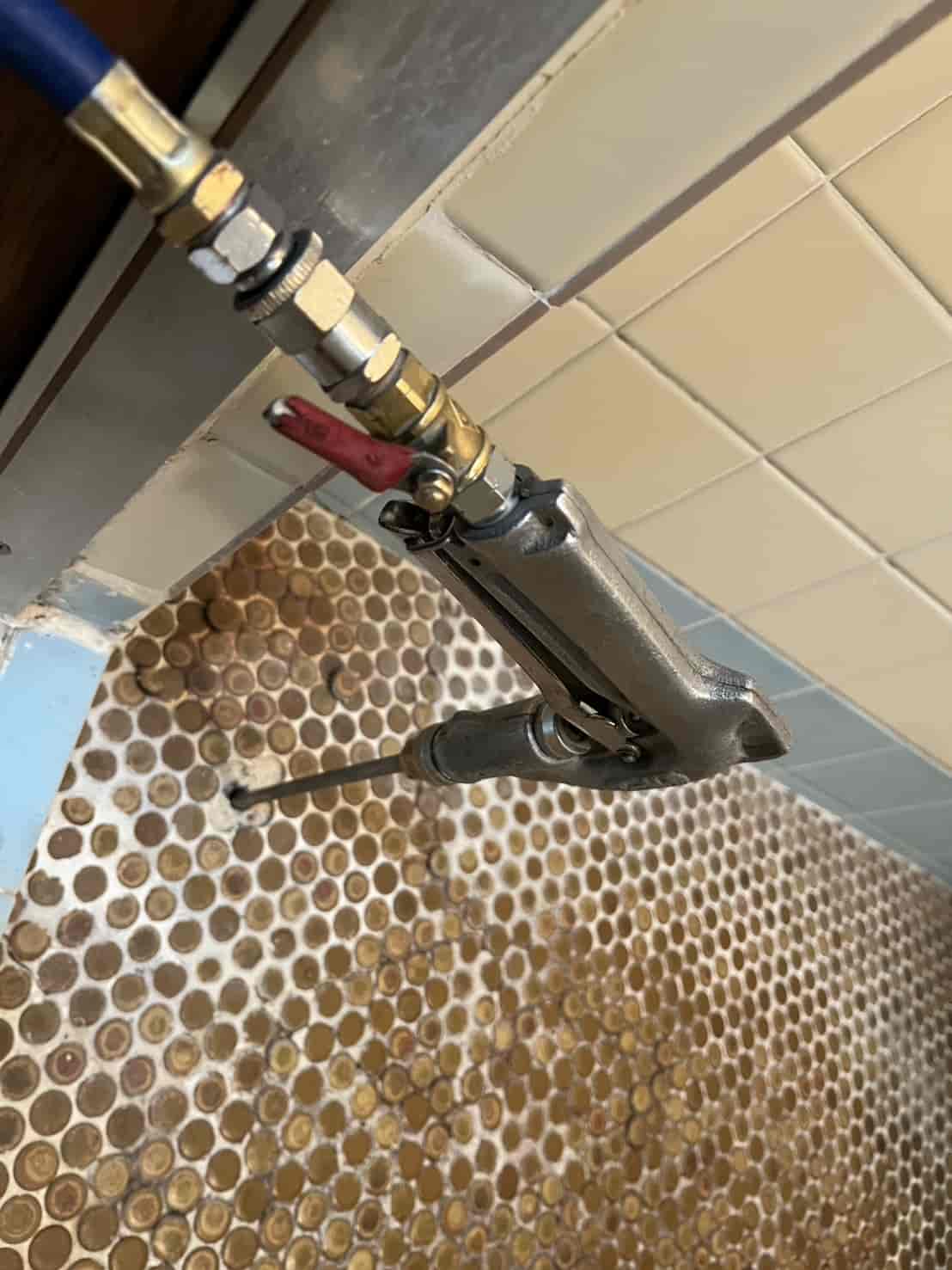 タイルやスラブの目地に専用ドリルで小さな穴をあけ、内部へ薬剤を高圧注入しました。